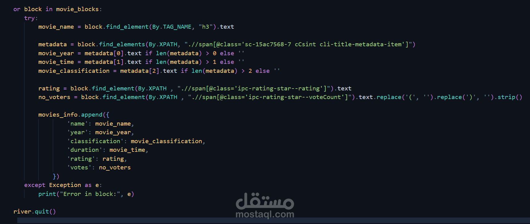 مشروع بلغة Python يعتمد على مكتبة Selenium لأتمتة عملية جمع بيانات الأفلام من موقع IMDb، بما في ذلك العناوين، التقييمات، والأنواع السينمائية. يقوم السكربت بمحاكاة التصفح البشري للتنقل بين الصفحات واستخراج البيانات بشكل منظم، ثم حفظها بصيغة مناسبة للتحليل أو عرضها لاحقًا.