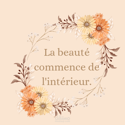 "تصميم أنيق على شكل إطار زهري بألوان دافئة يحيط بعبارة فرنسية ملهمة «La beauté commence de l'intérieur» والتي تعني: الجمال يبدأ من الداخل. التصميم يجمع بين الأناقة والبساطة ليضفي لمسة راقية على أي مشروع.