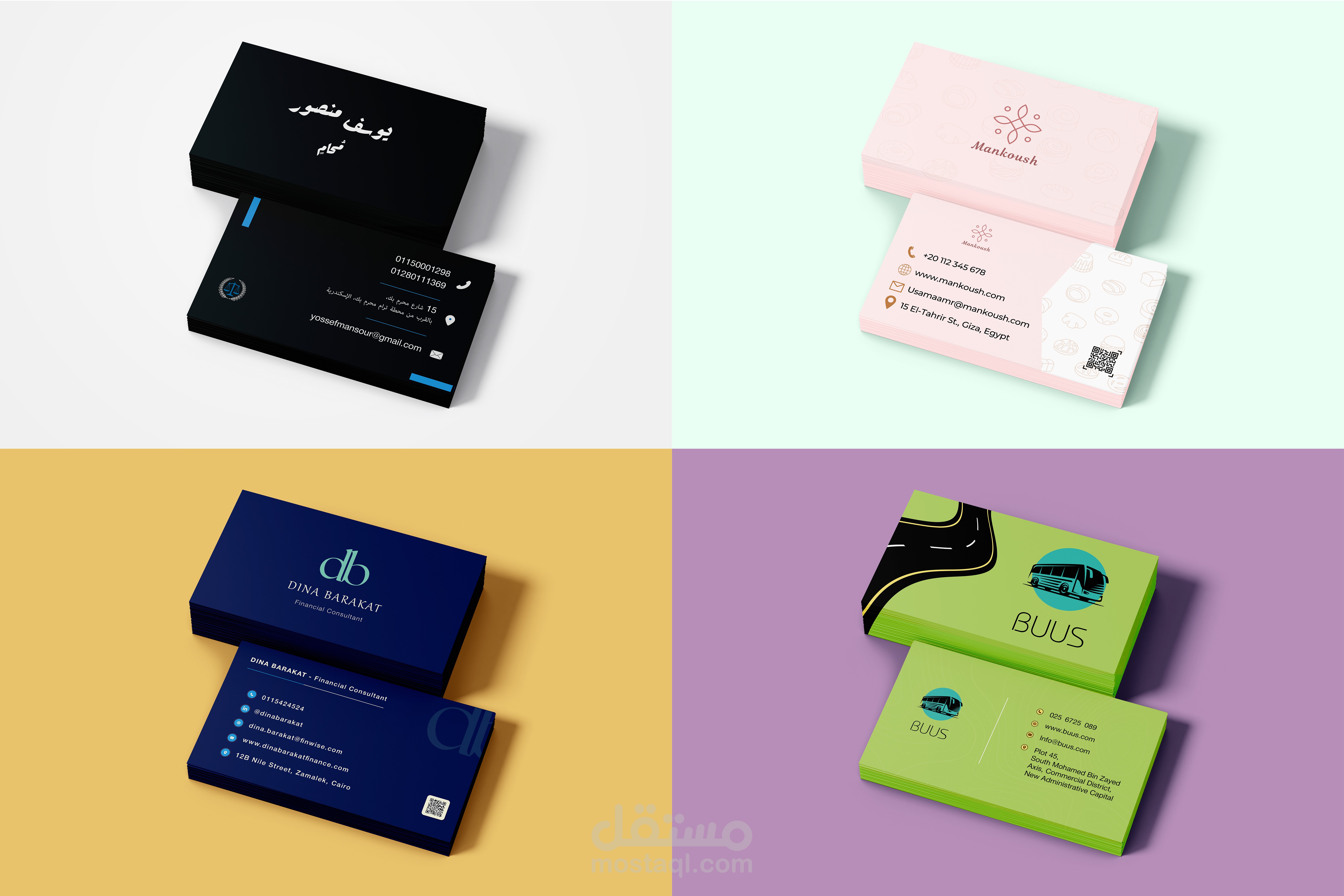 قمت بتصميم مجموعة من كروت الأعمال والكروت الشخصية لعملاء من مجالات مختلفة، مع التركيز على إبراز هوية كل علامة تجارية بشكل مميز واحترافي.