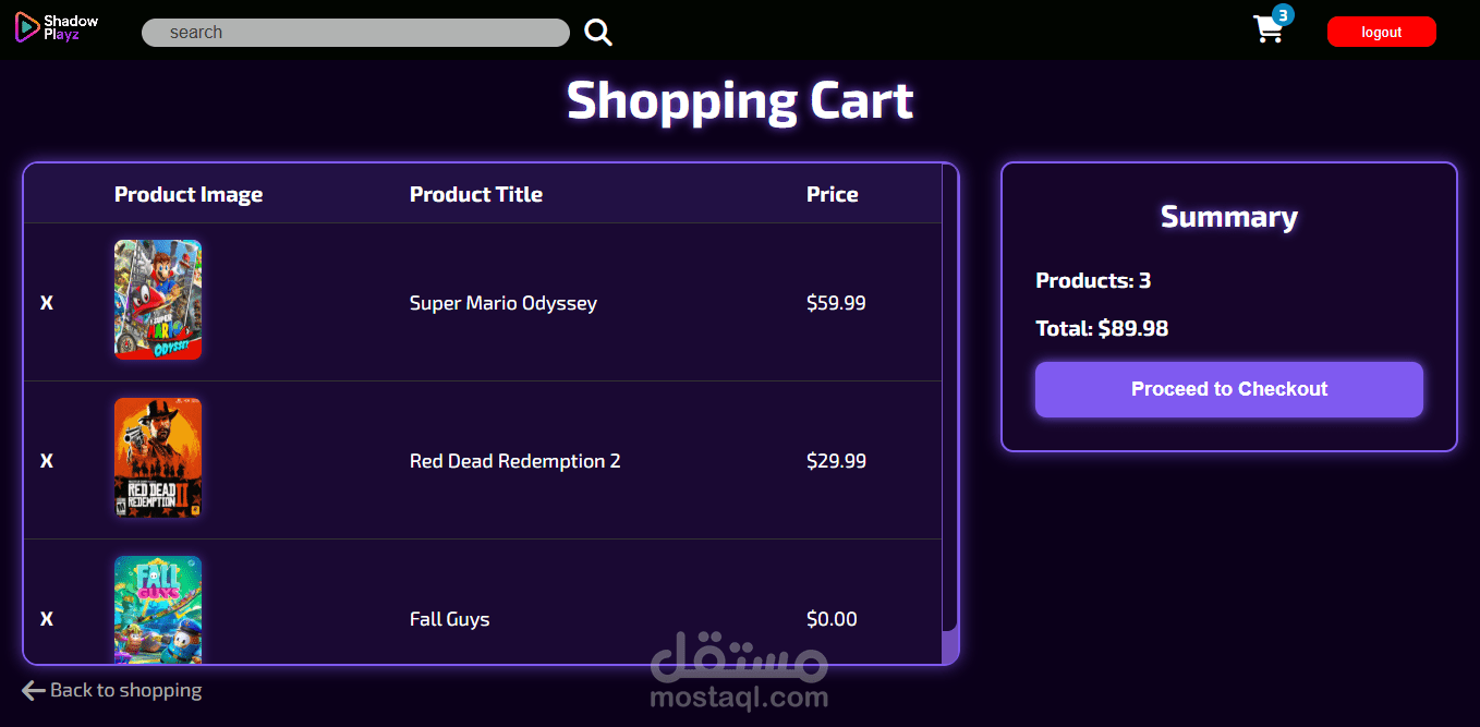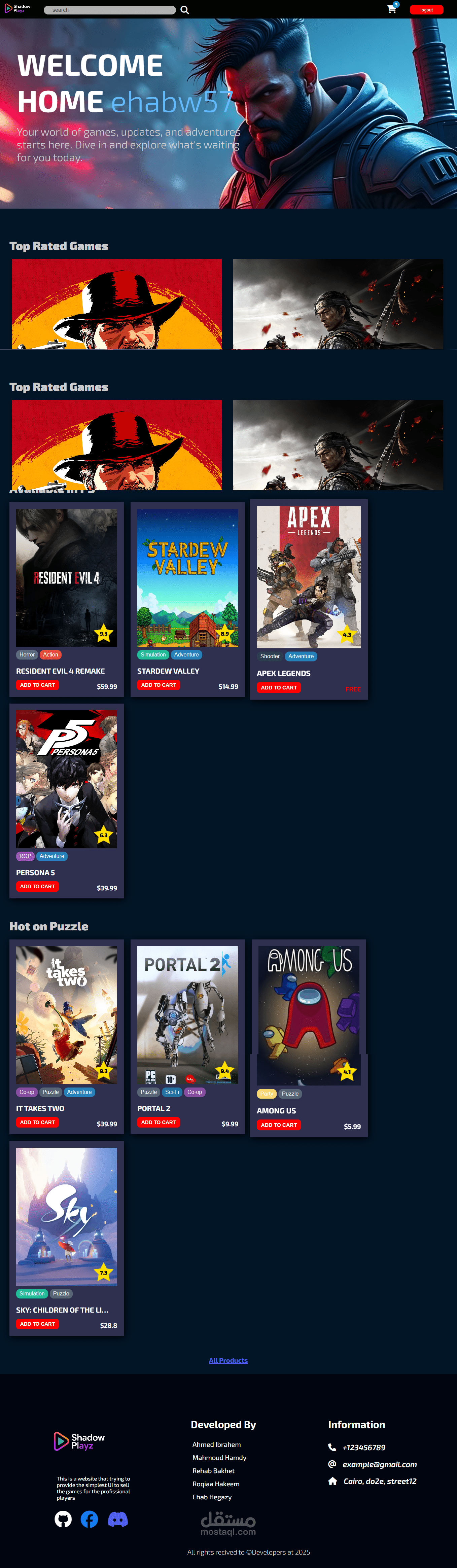 قمت بتصميم وتطوير واجهة متجر إلكتروني مخصص لبيع الألعاب تحت اسم Shadow Playz.