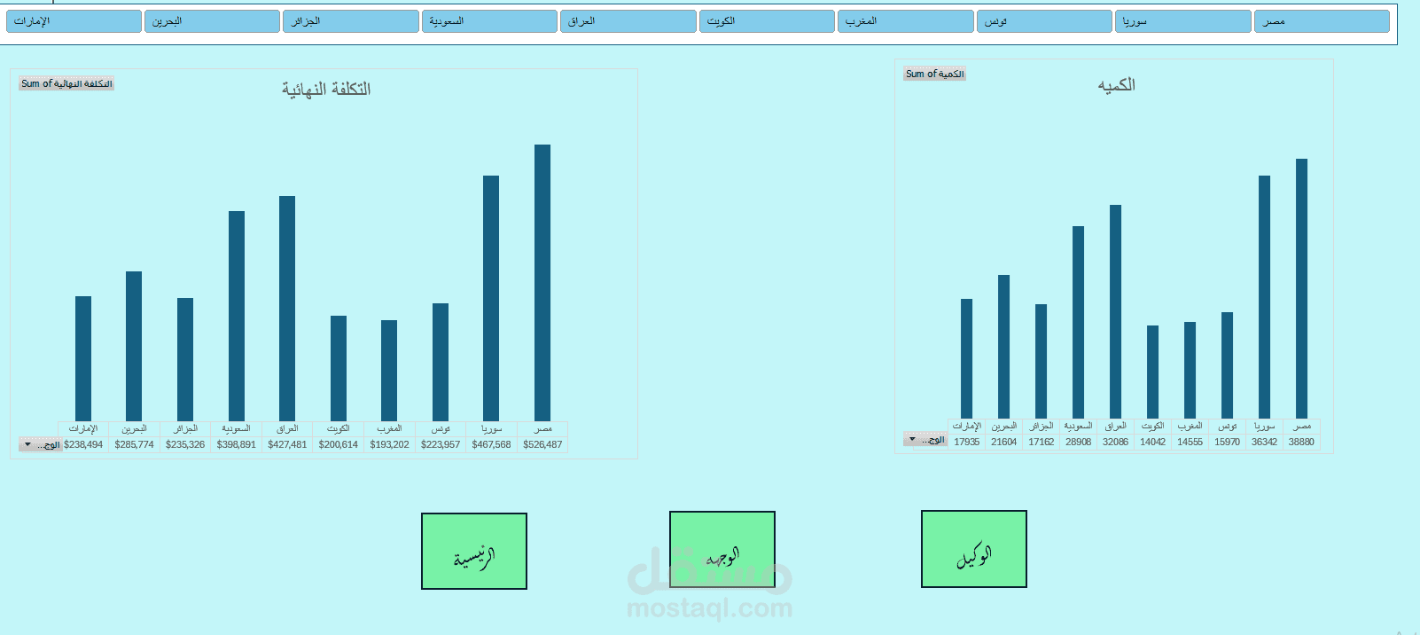 تقدم ملخصًا تنفيذيًا يقارن بين التكلفة الإجمالية وحجم الكميات في كل دولة. هي لوحة القيادة العليا التي تمنح نظرة سريعة على صحة العمليات المالية والتشغيلية في الأسواق المختلفة.