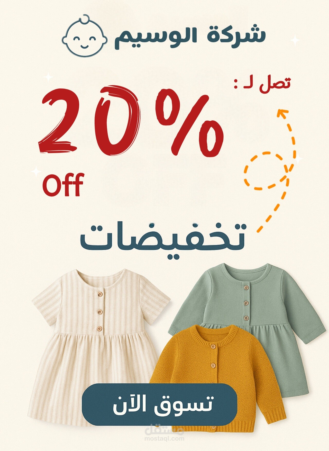 تم تصميم لوحة إعلانية لشركة تجارية لألبسة الأطفال وفقاً لتعليمات العميل، حول تخفيض أسعار.