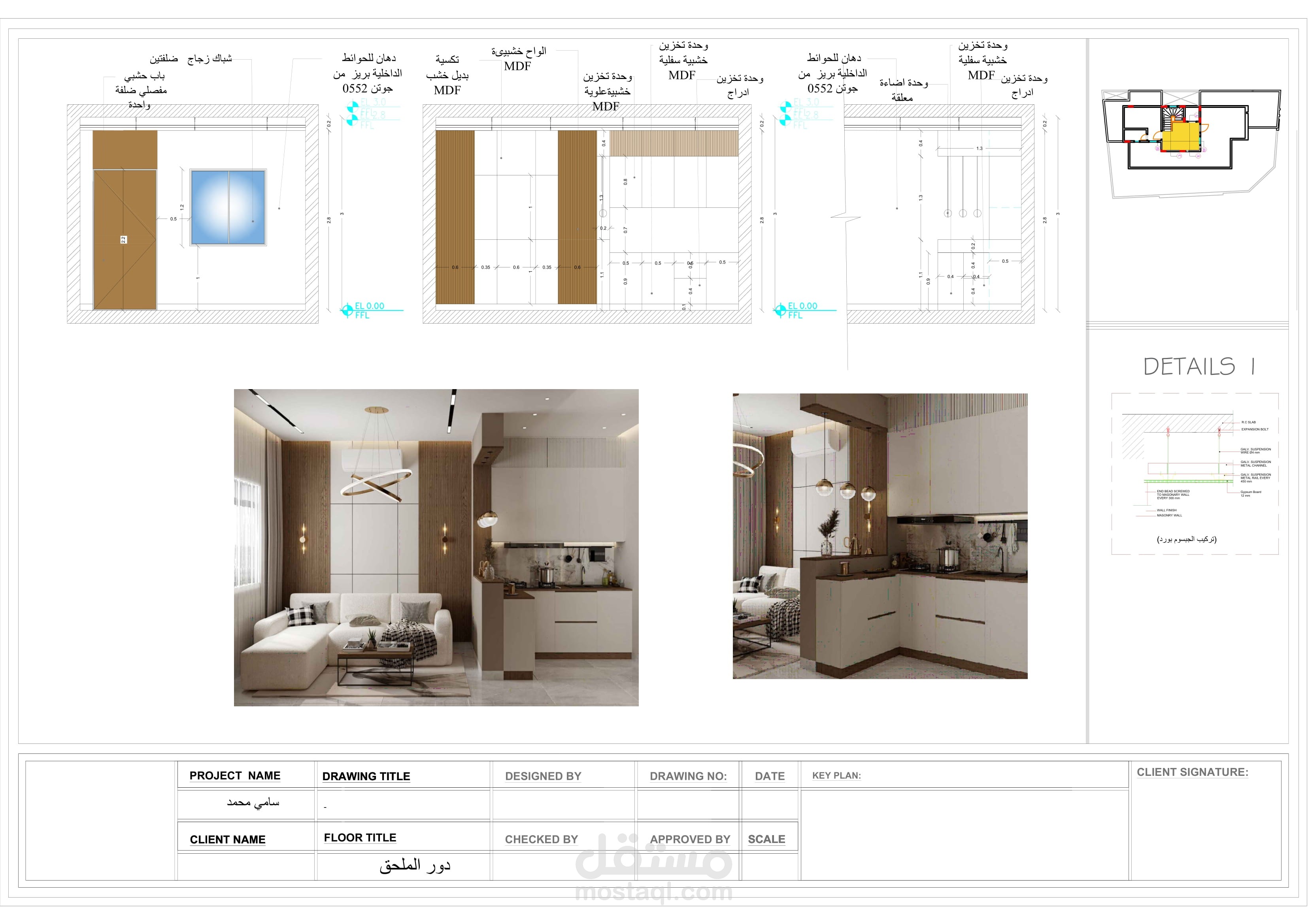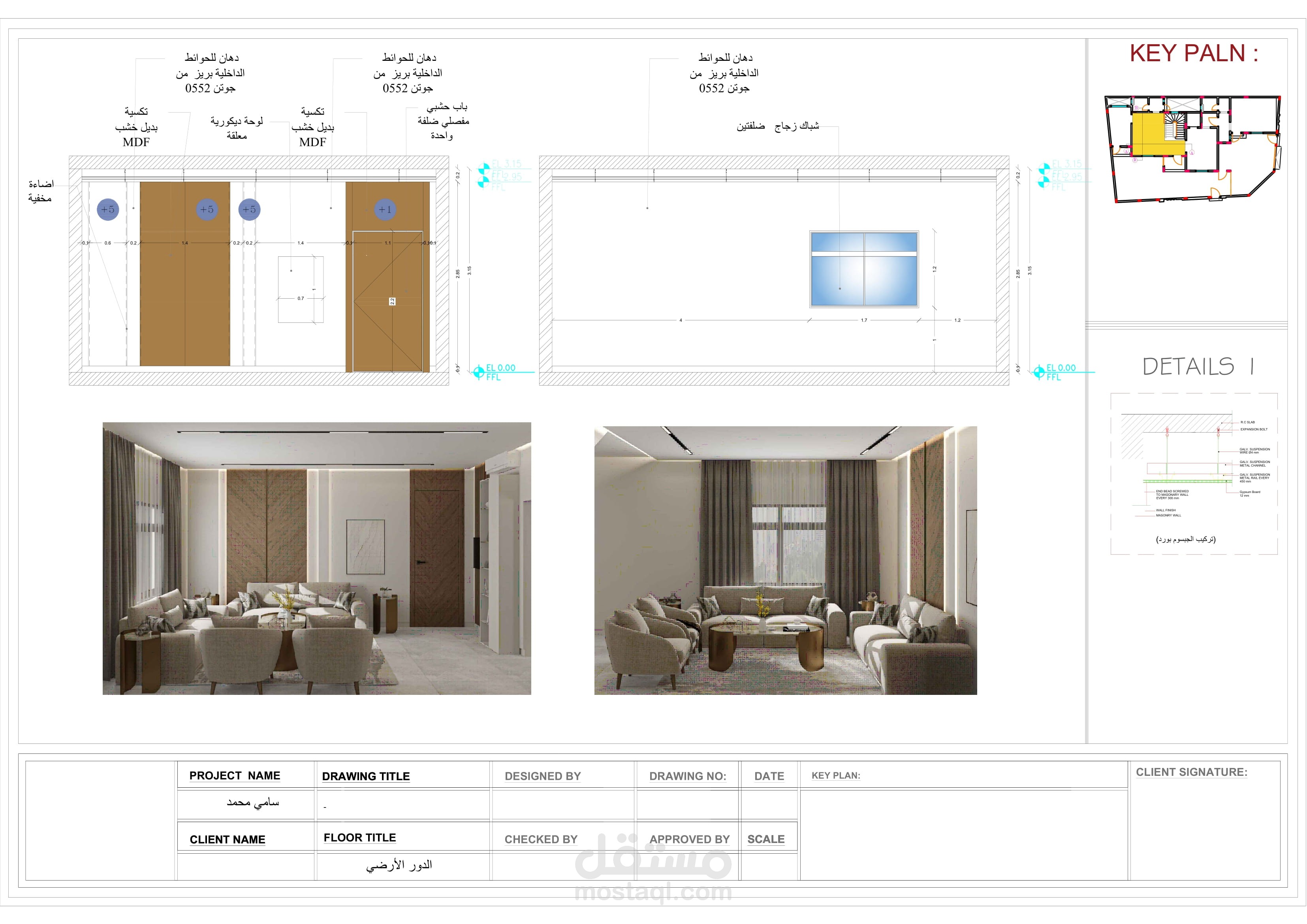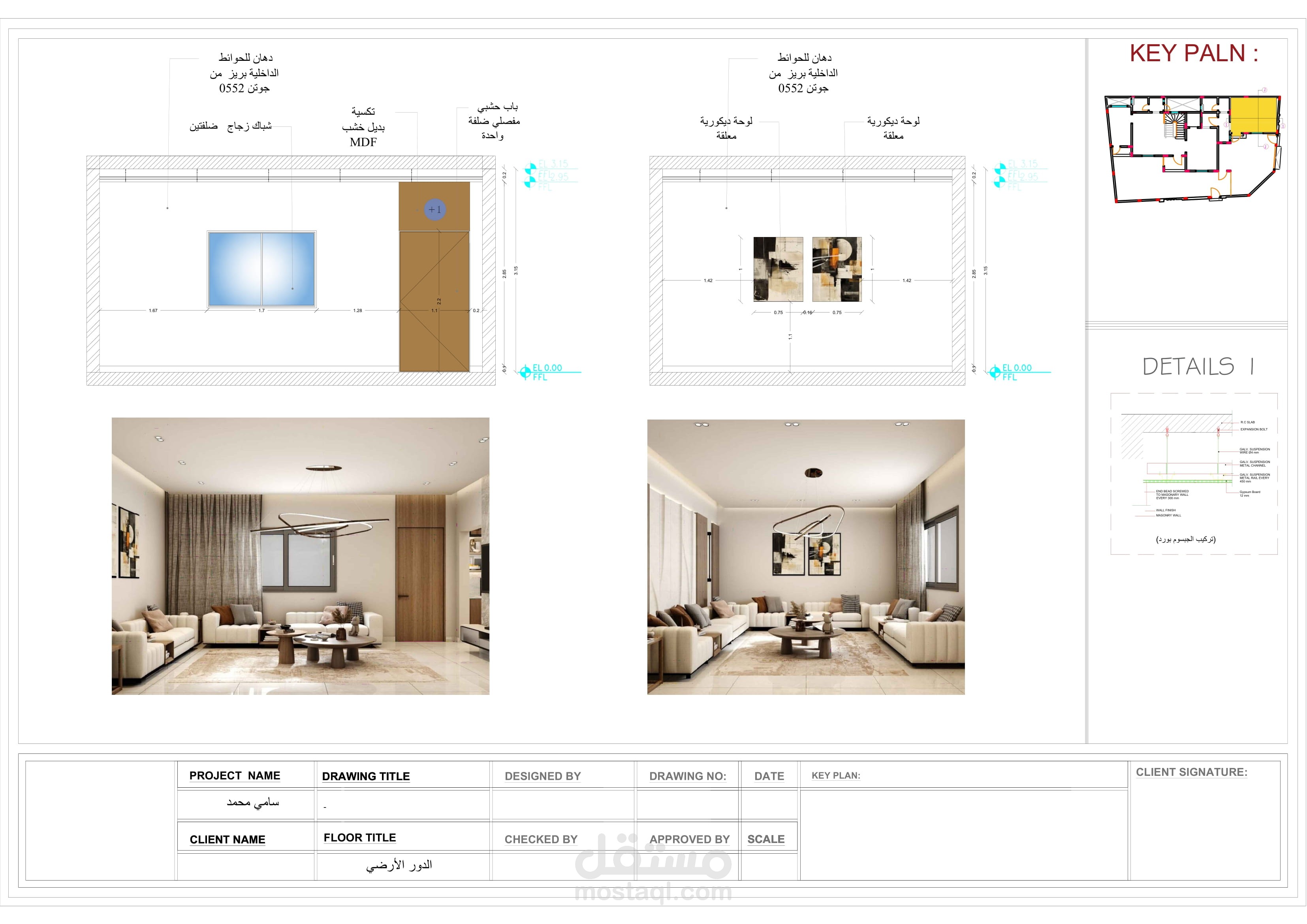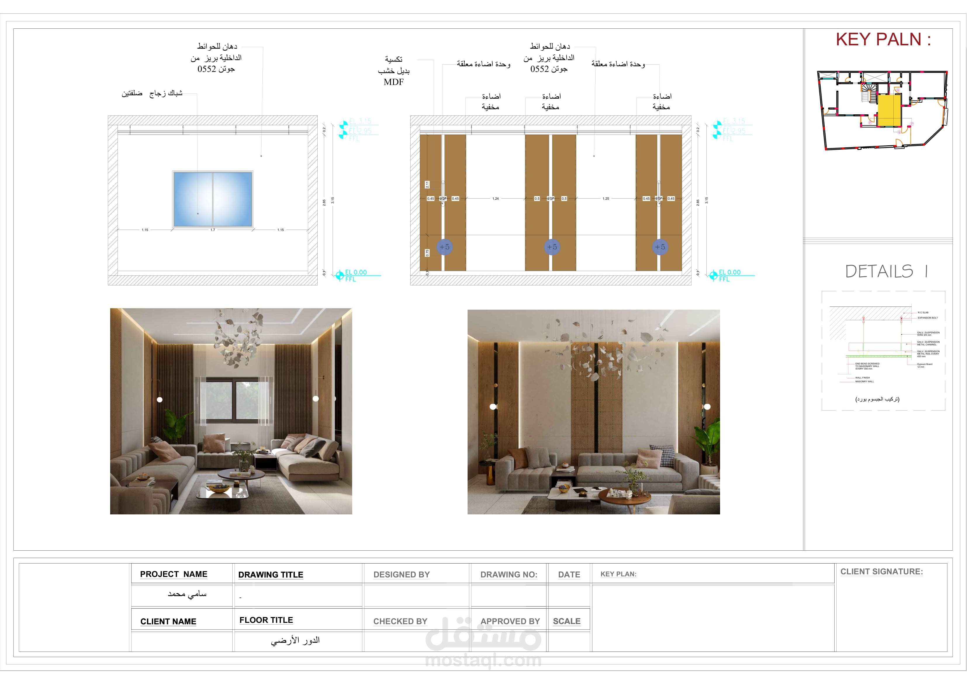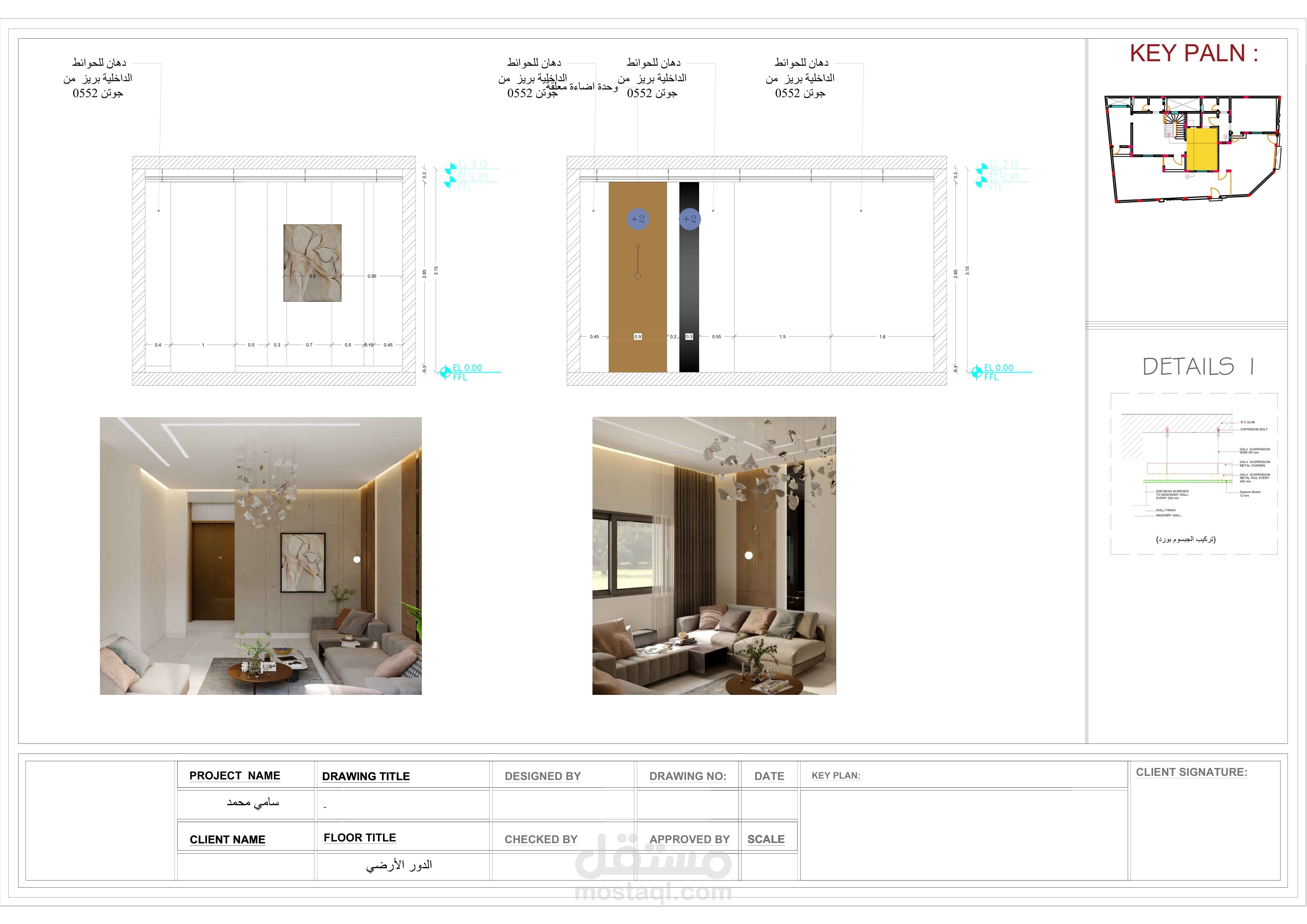 3- قطاع (section ) لكل جدار يوضح الديكورات الجدارية بالمقاسات التفصيلية . .