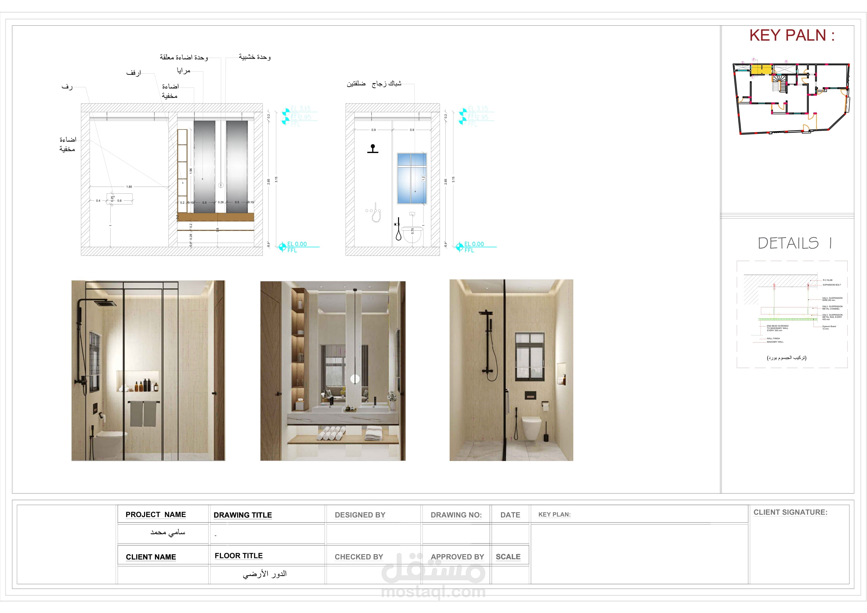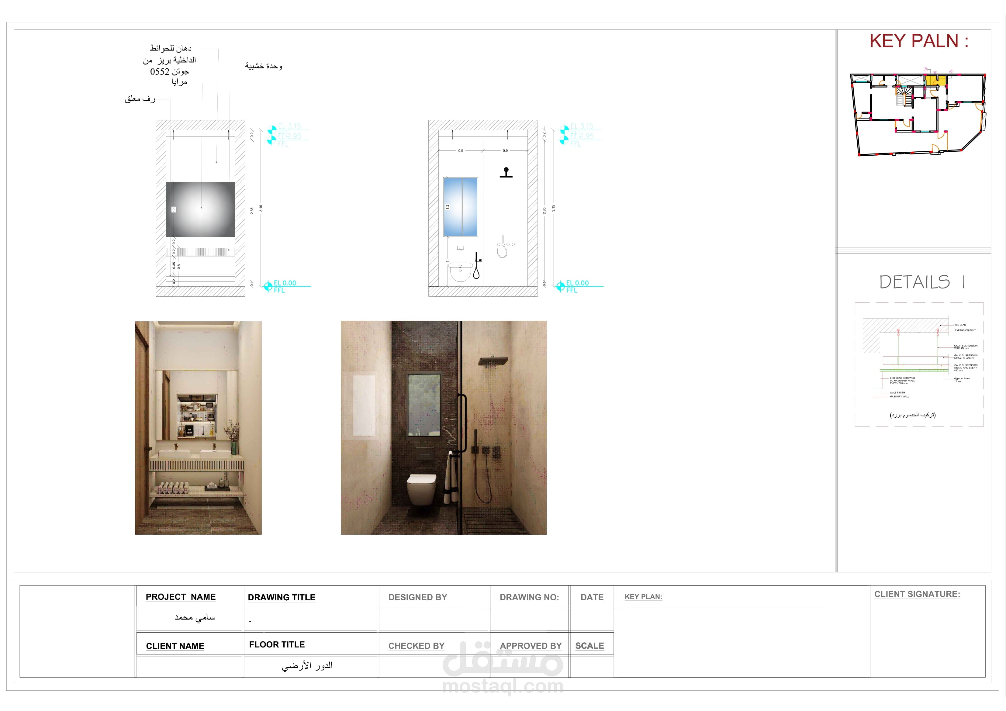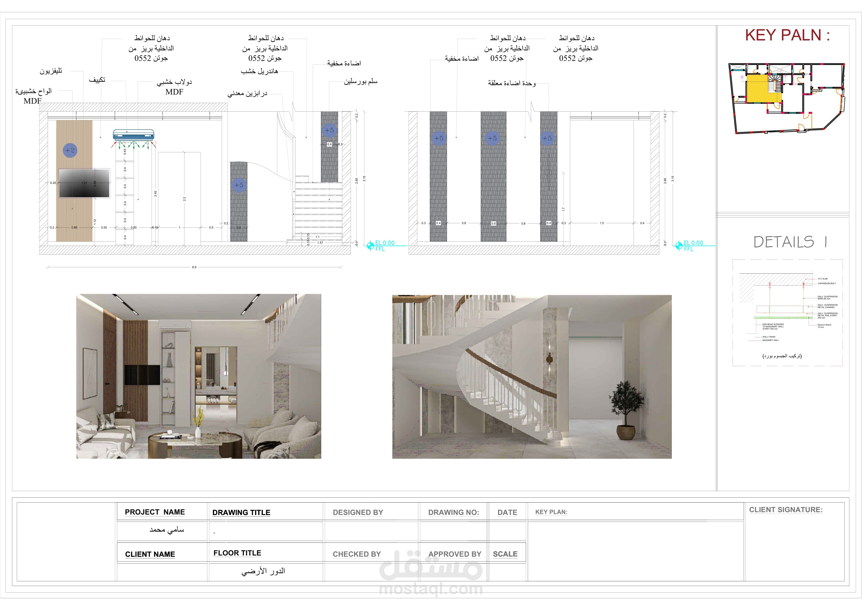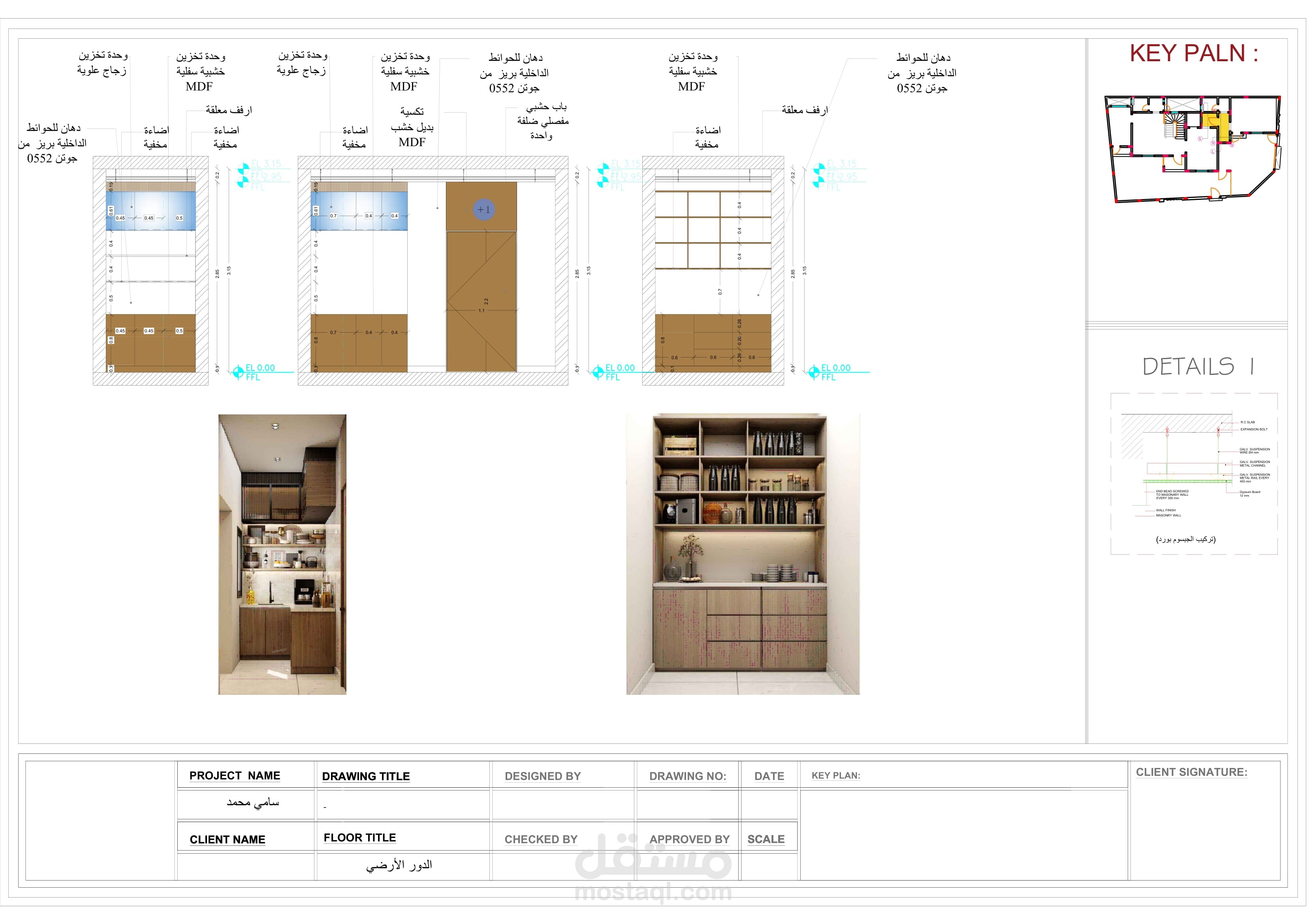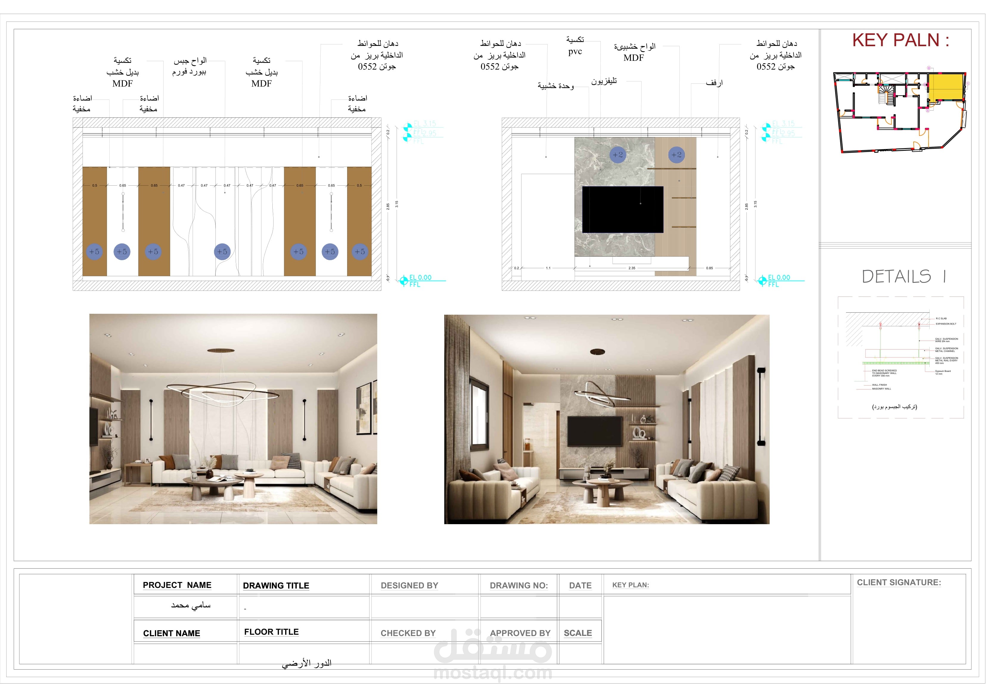 3- قطاع (section ) لكل جدار يوضح الديكورات الجدارية بالمقاسات التفصيلية . .