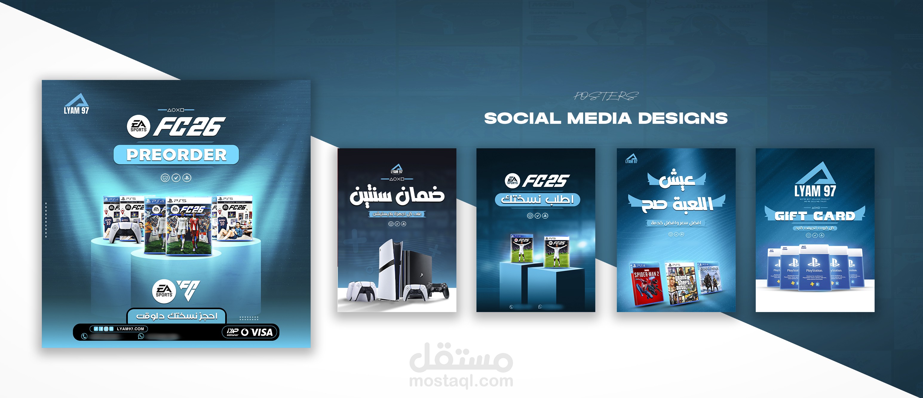 The projects are social media poster designs for PlayStation game stores. They were created using Photoshop and Illustrator, along with some AI tools and websites.