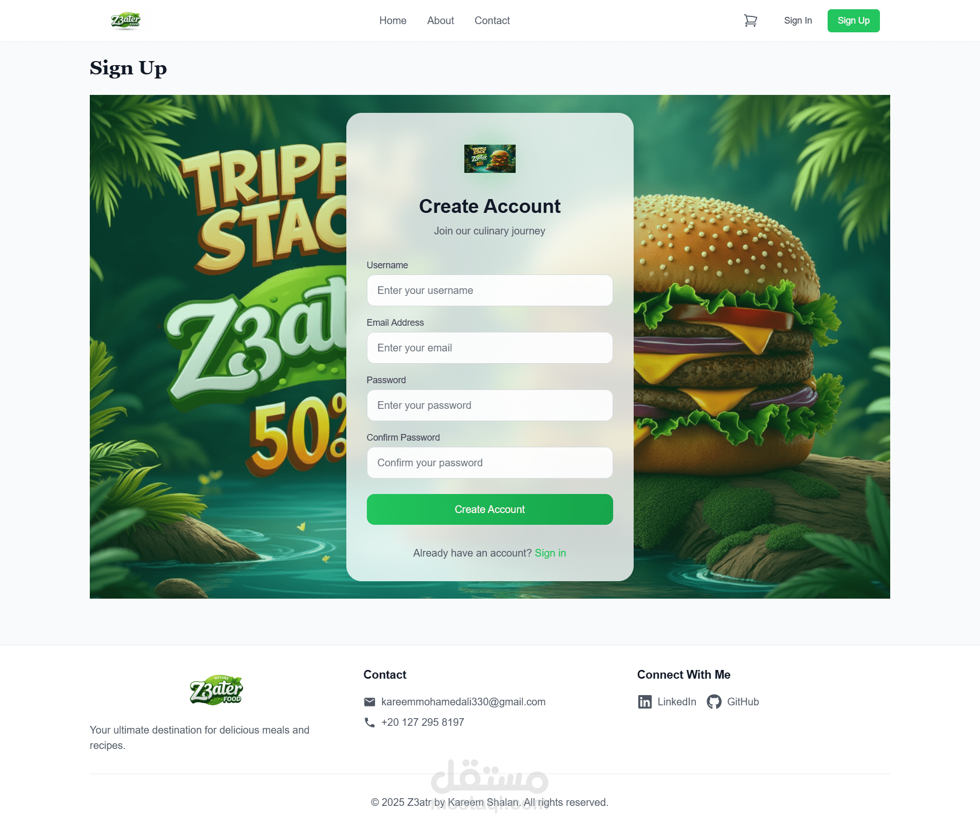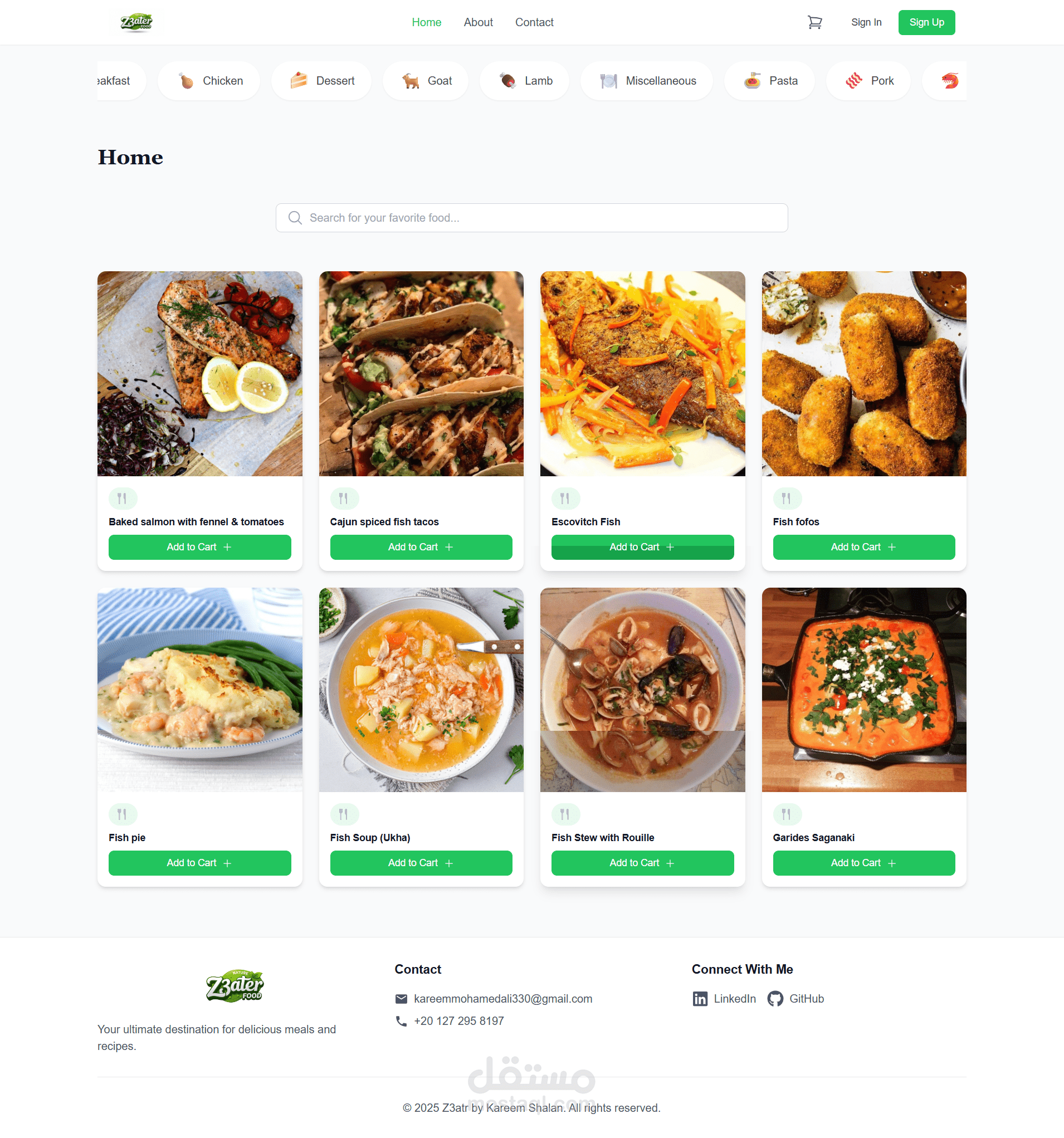 واجهة أمامية لموقع توصيل الطعام "Za3tr Food"، باستخدام React وTailwind CSS مع تصميم متجاوب ودعم للسلة وتصنيف الوجبات.