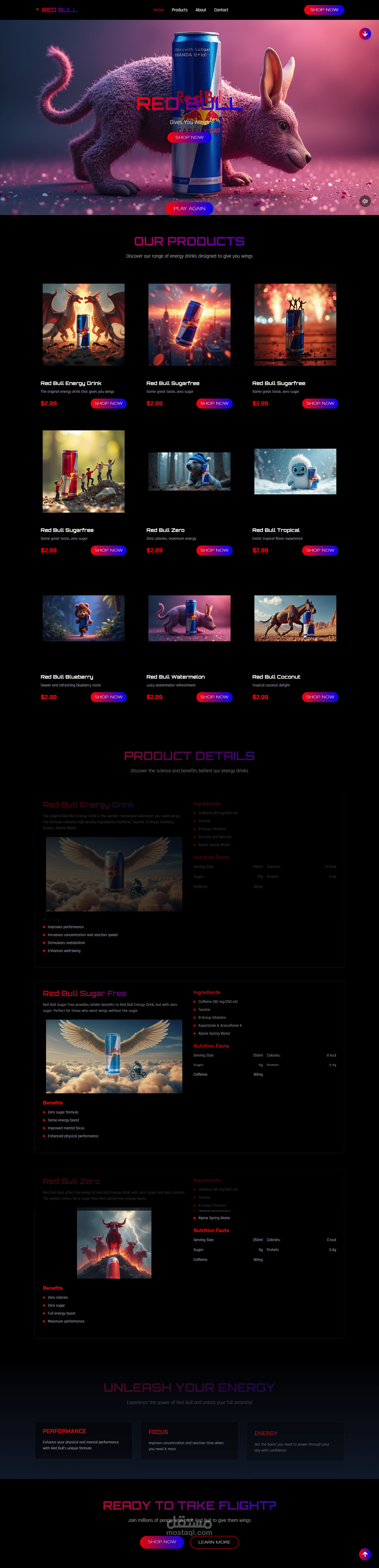 واجهة متاجر "Red Bull Store" مطوّرة باستخدام React وTailwind CSS. تحتوي على تصميم متجاوب لكل الشاشات، سهولة في التصفح، وعناصر تفاعلية جذابة مثل هيدر شبكي ونظام تصنيف للمنتجات.