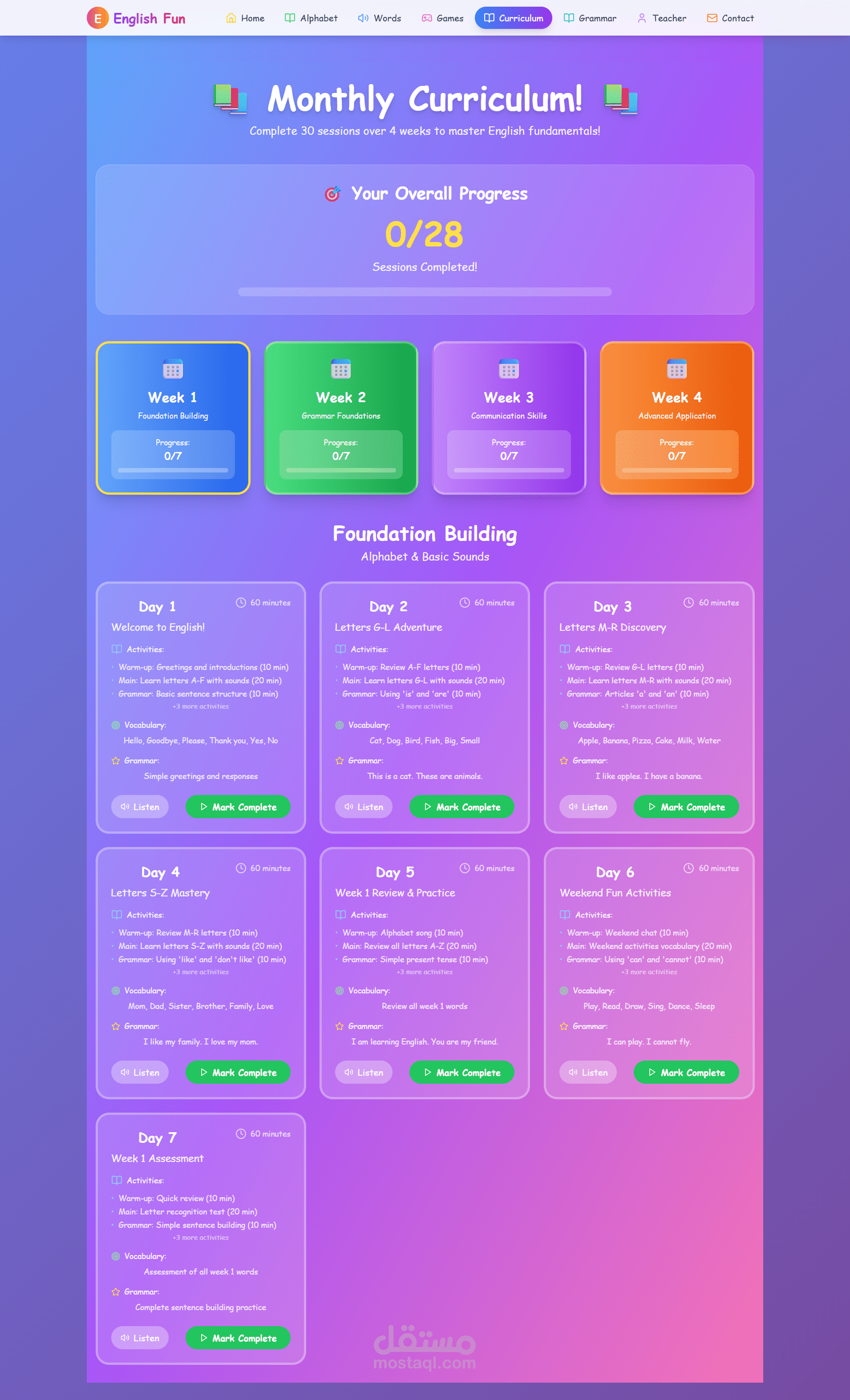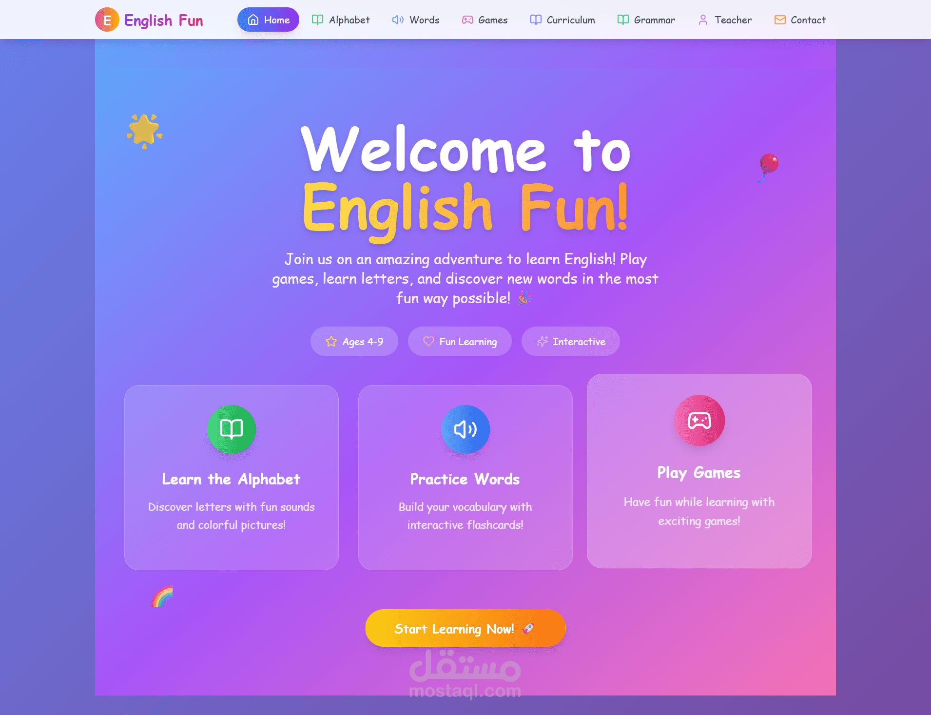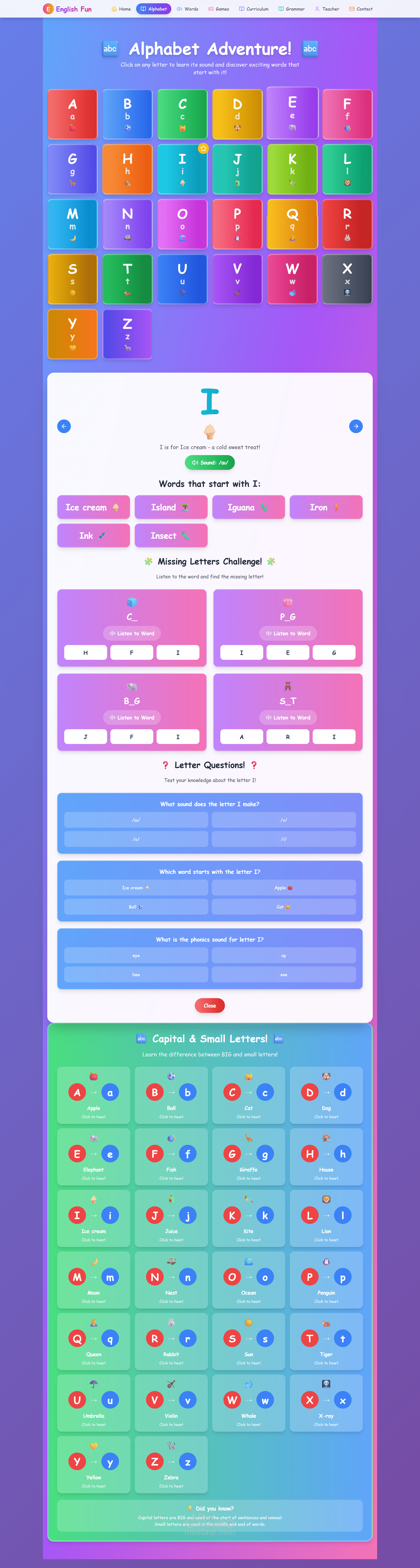 An interactive and fun frontend for "English Kids Kapapa" app, designed to teach English to children. Select letters, words, or educational games in a simple and colorful interface.