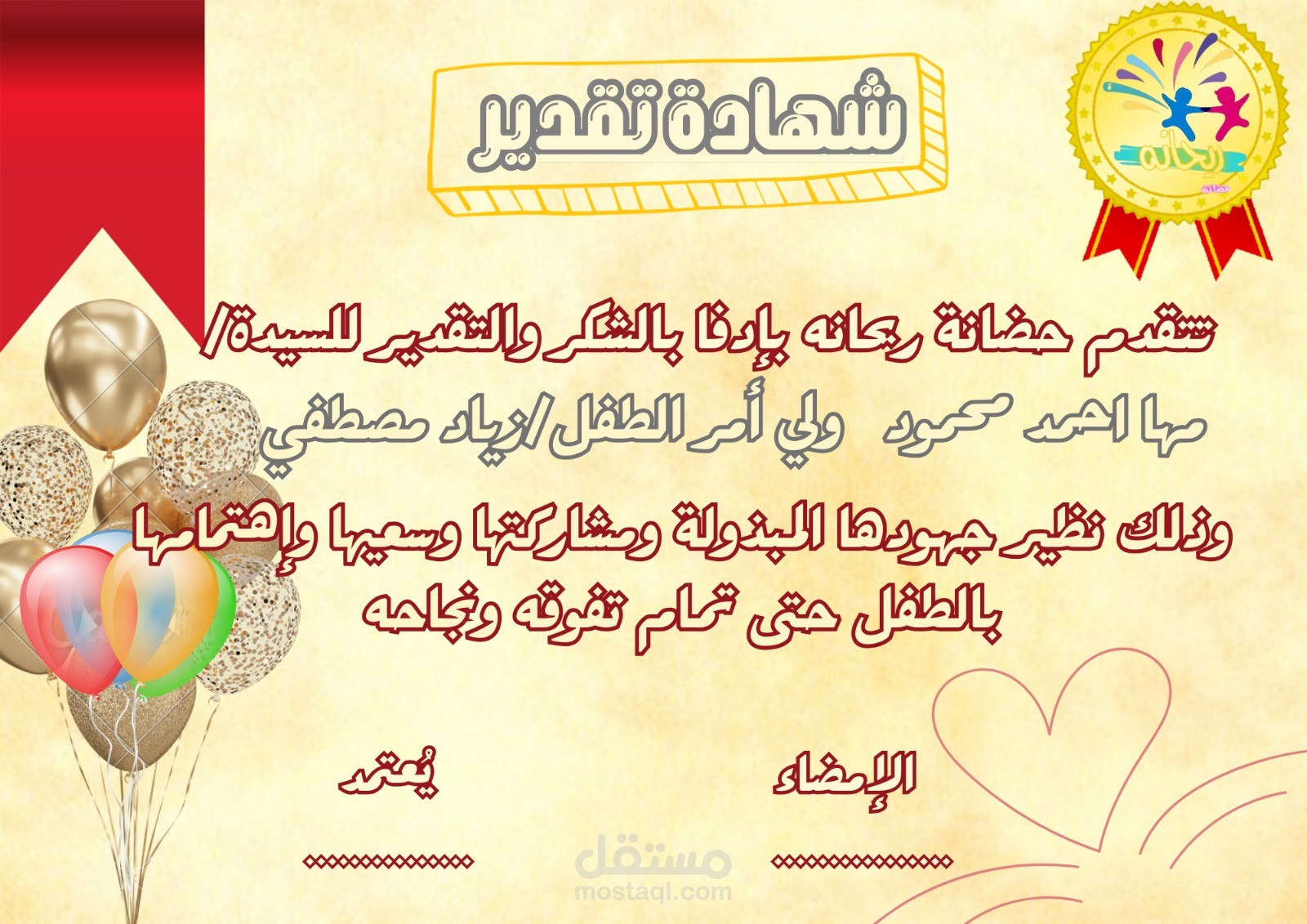 إنشاء وتصميم إبداعي لشهادة تقدير أو دعوة زفاف بشكل جميل يُظهر هوية بصرية جميلة مشّرفة لمصدر الشهادة.