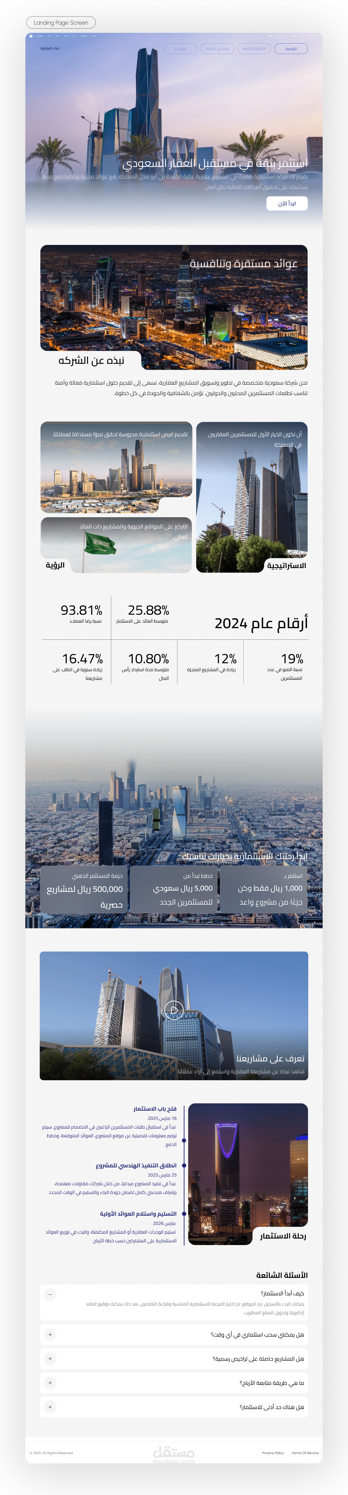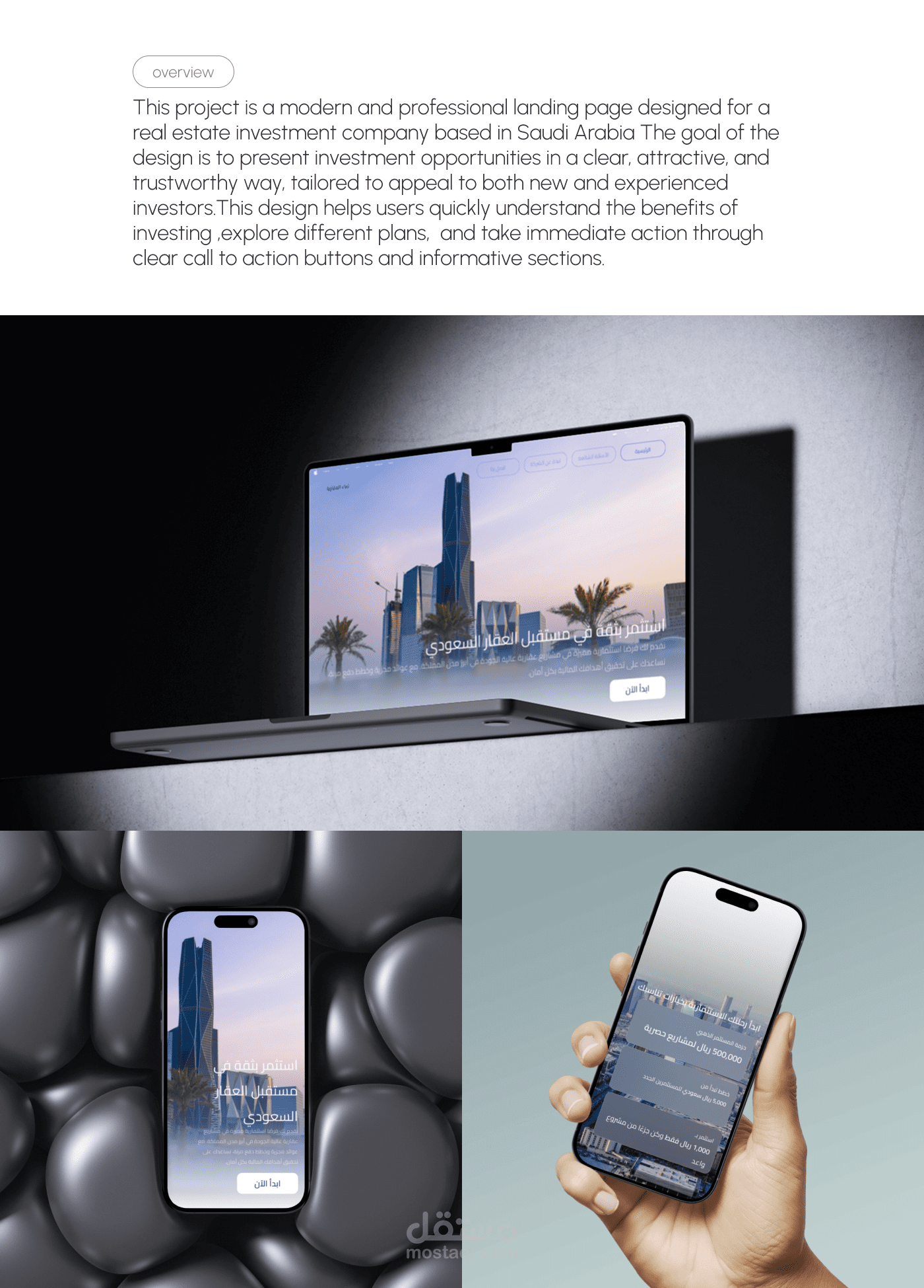 هذا المشروع عبارة عن تصميم صفحة هبوط (Landing Page) حديثة واحترافية لشركة استثمار عقاري في المملكة العربية السعودية.