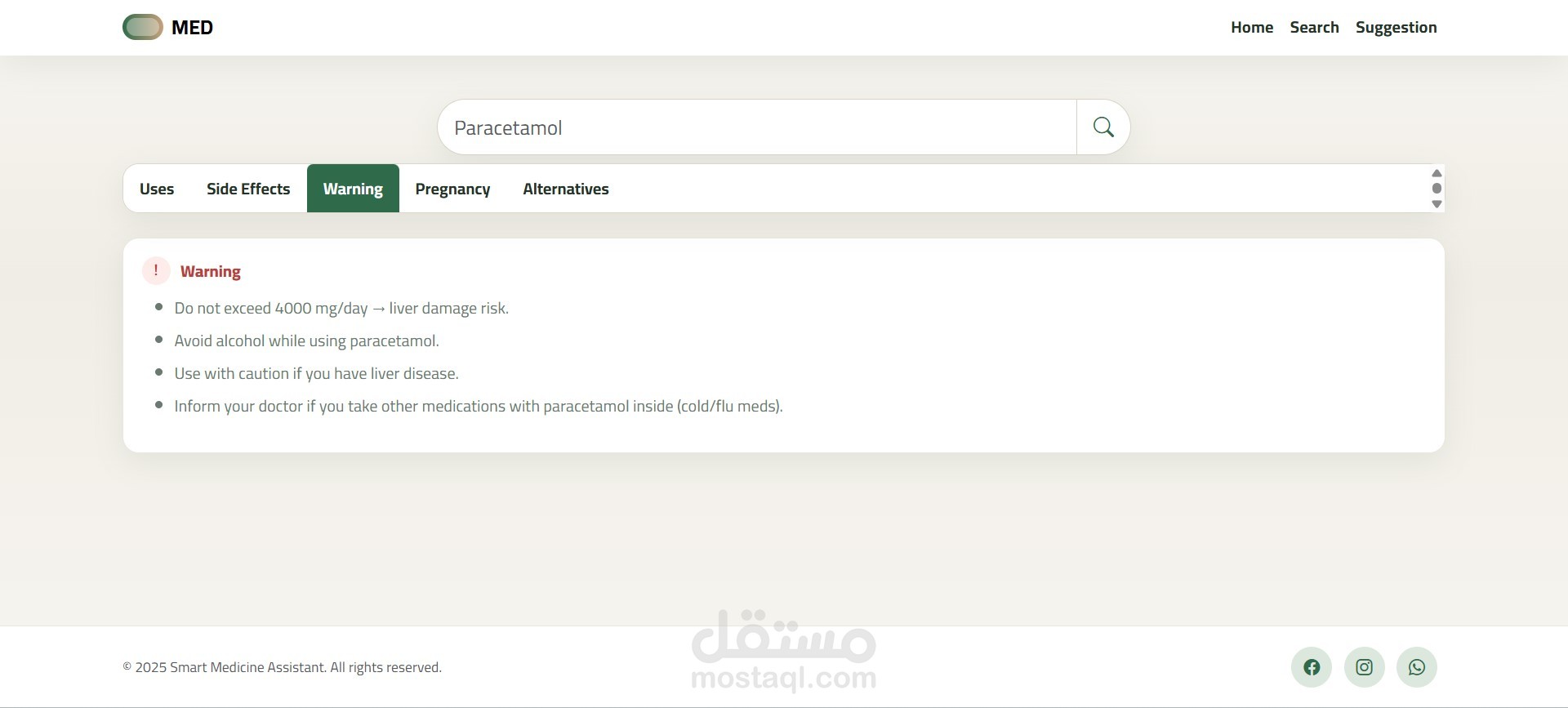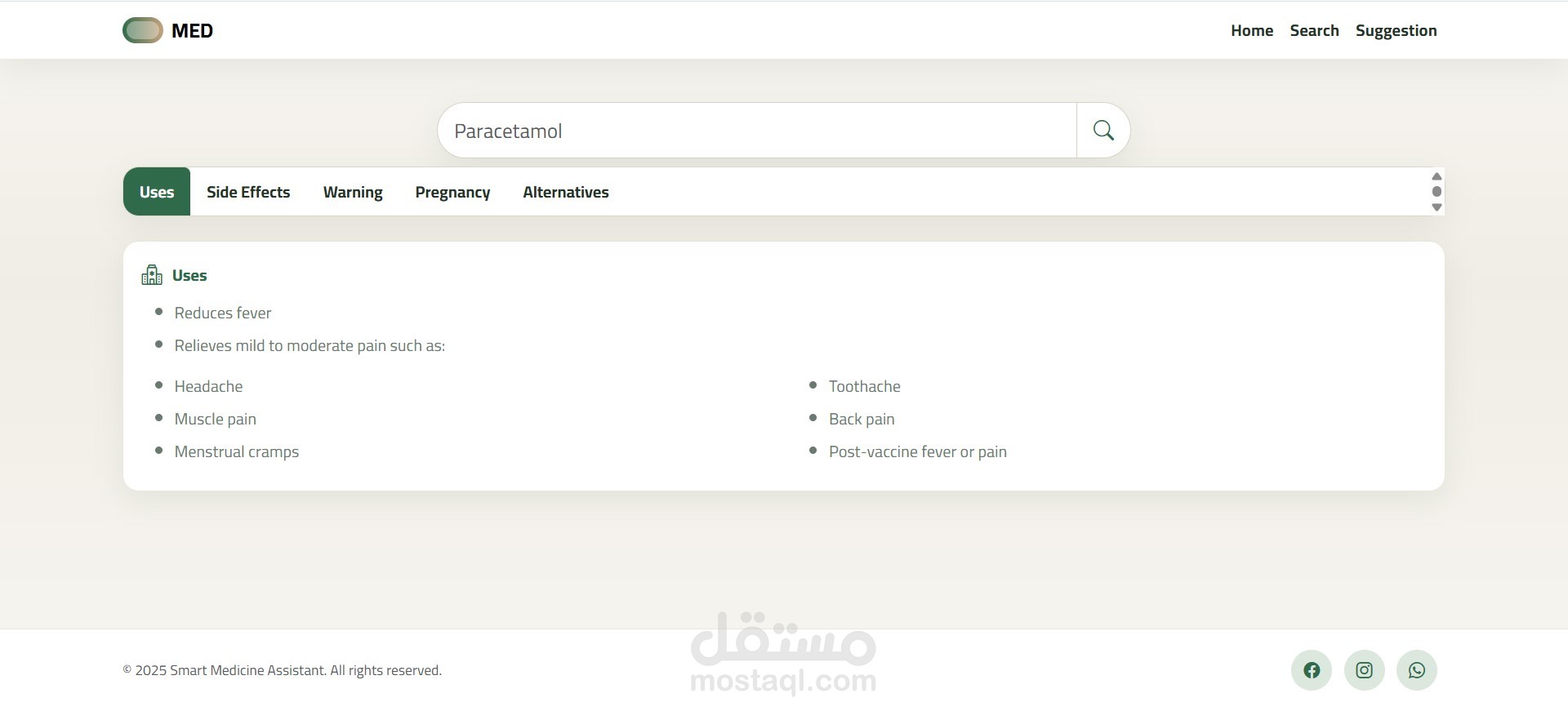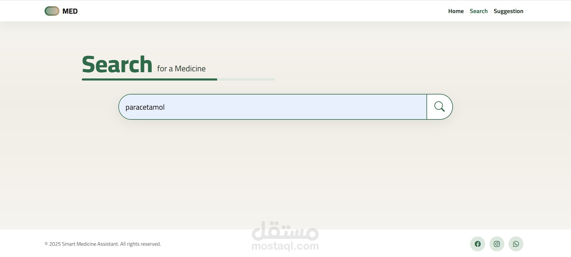 Smart Medicine Assistant is a responsive frontend web application designed to help users easily access trusted information about medications. The interface is clean, user-friendly, and built with HTML5, CSS3, JavaScript, and Bootstrap.