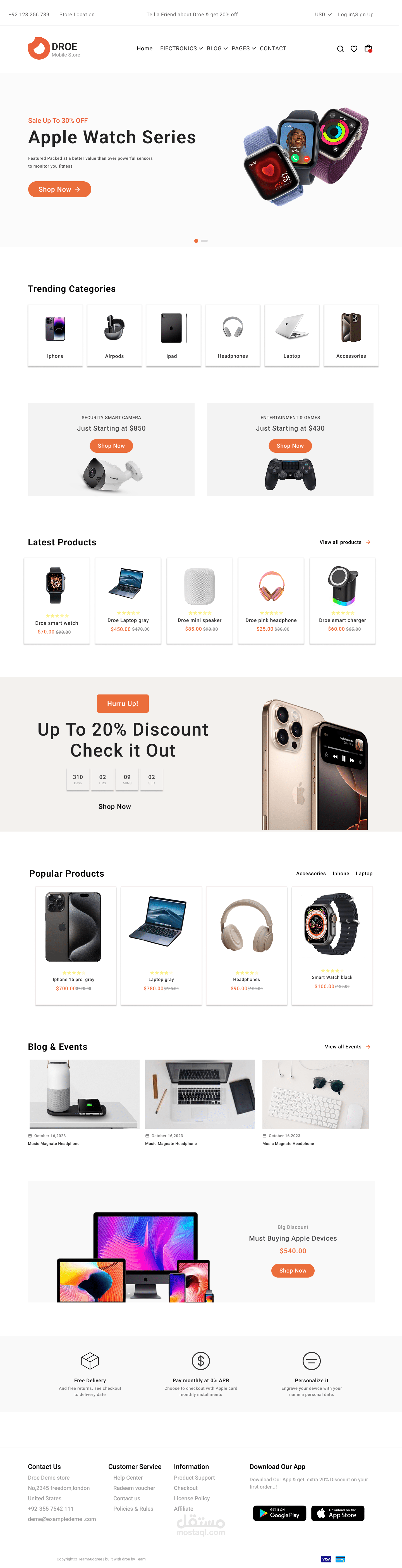 صفحات رئيسية مثل: الصفحة الرئيسية، صفحة المنتجات، تفاصيل المنتج، عربة التسوق، الدفع.