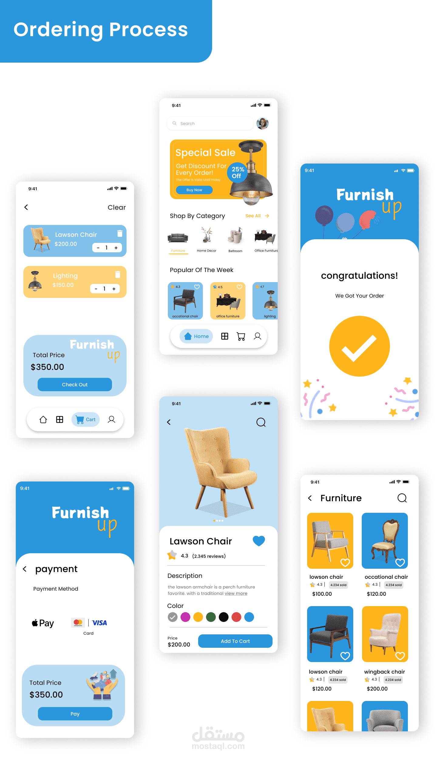تطبيق موبايل مخصص لبيع الأثاث والديكور أونلاين. يتيح للمستخدمين تصفح قطع الأثاث بسهولة، مشاهدة التفاصيل والصور، وإضافتها لعربة التسوق لإتمام عملية الشراء بشكل سريع وآمن. هدف التطبيق هو توفير تجربة سلسة ومريحة لشراء الأثاث دون الحاجة للذهاب للمعارض، مع واجهة مستخدم عصرية وسهلة الاستخدام.