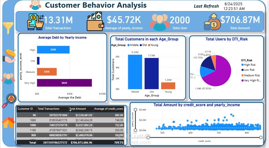 من خلال تحليل بيانات لأكثر من 13.3 مليون معاملة بقيمة إجمالية تتجاوز 706 مليون دولار لـ 2000 عميل، تمكنا من بناء لوحة تحكم شاملة تقدم نظرة عميقة على ثلاثة محاور رئيسية: