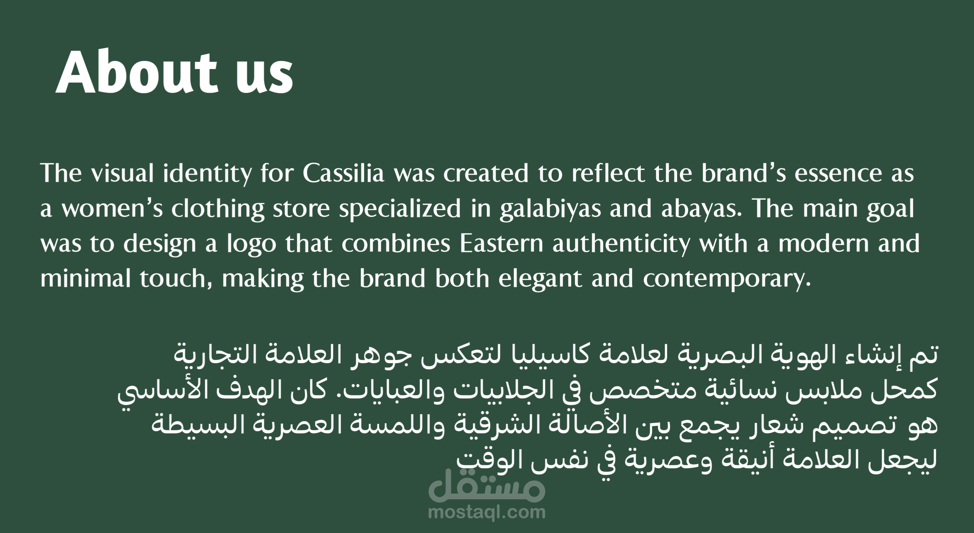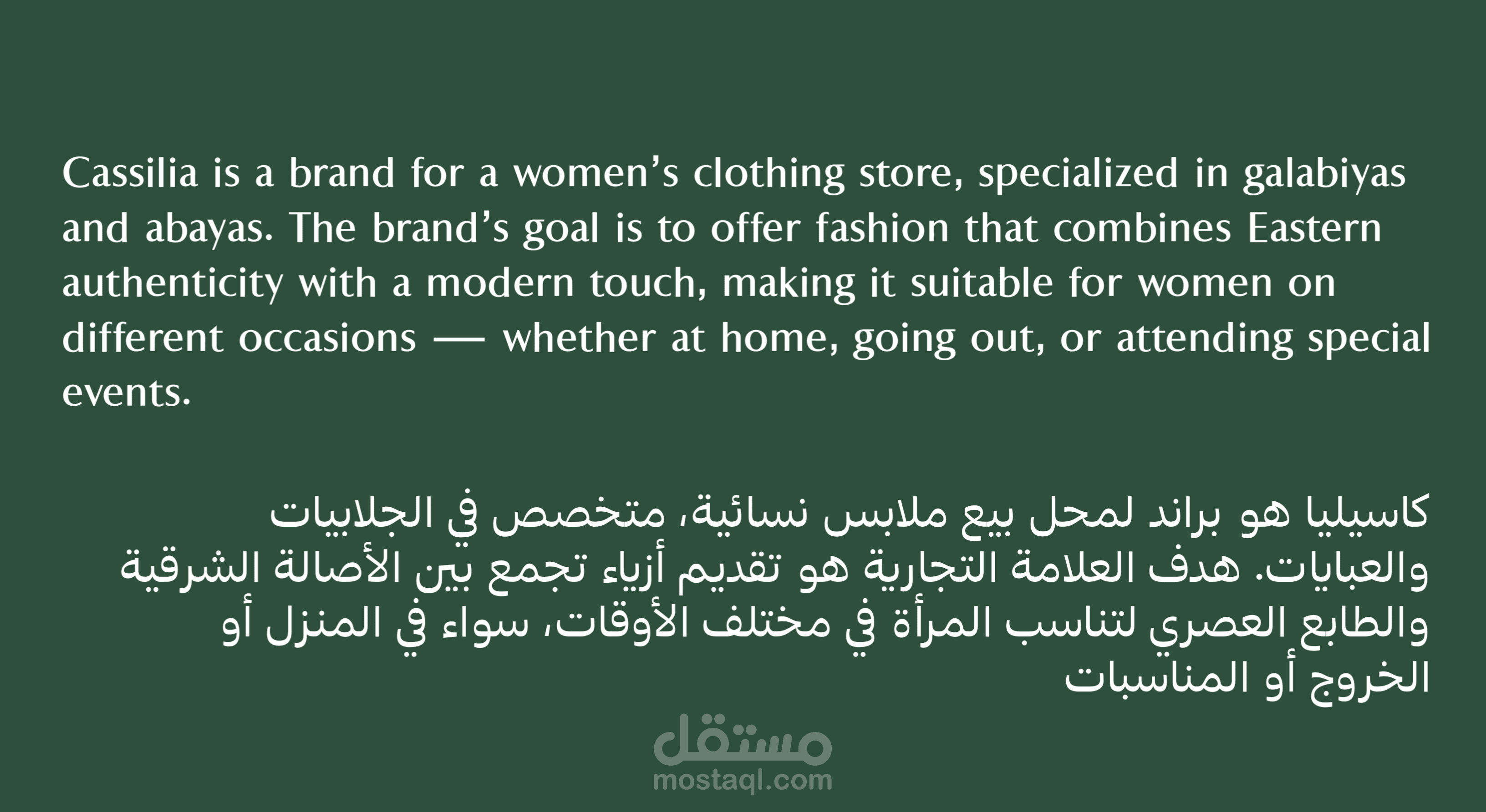 Casilia is a women’s clothing store specialized in abayas and galabiyas. The brand identity was designed to reflect elegance, authenticity, and modern fashion that suits women in different occasions. The visual identity combines a minimal logo, a balanced color palette, and clean applications to create a professional and attractive presence for the brand across packaging, stationery, and storefront.