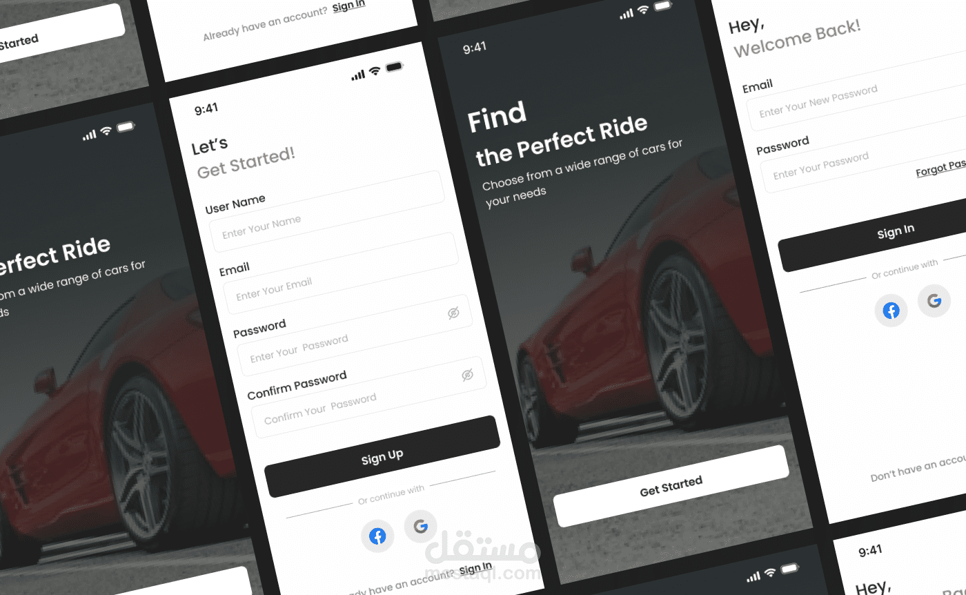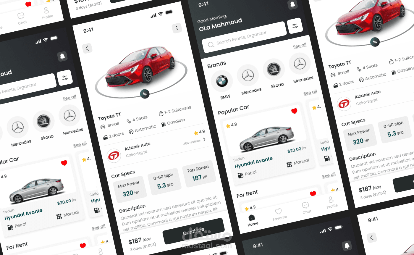 هذا التطبيق يتيح للمستخدمين استعراض السيارات المتاحة، اختيار الأنسب، وإتمام الحجز بسهولة. صممت واجهة مستخدم راقية وعصرية تشمل 5 شاشات رئيسية: Onboarding، Sign Up، Sign In، الشاشة الرئيسية، وصفحة كل سيارة تعرض المميزات والسعر والخصائص. ركزت على وضوح المعلومات وسهولة التفاعل وتجربة بصرية ممتعة في كل شاشة.