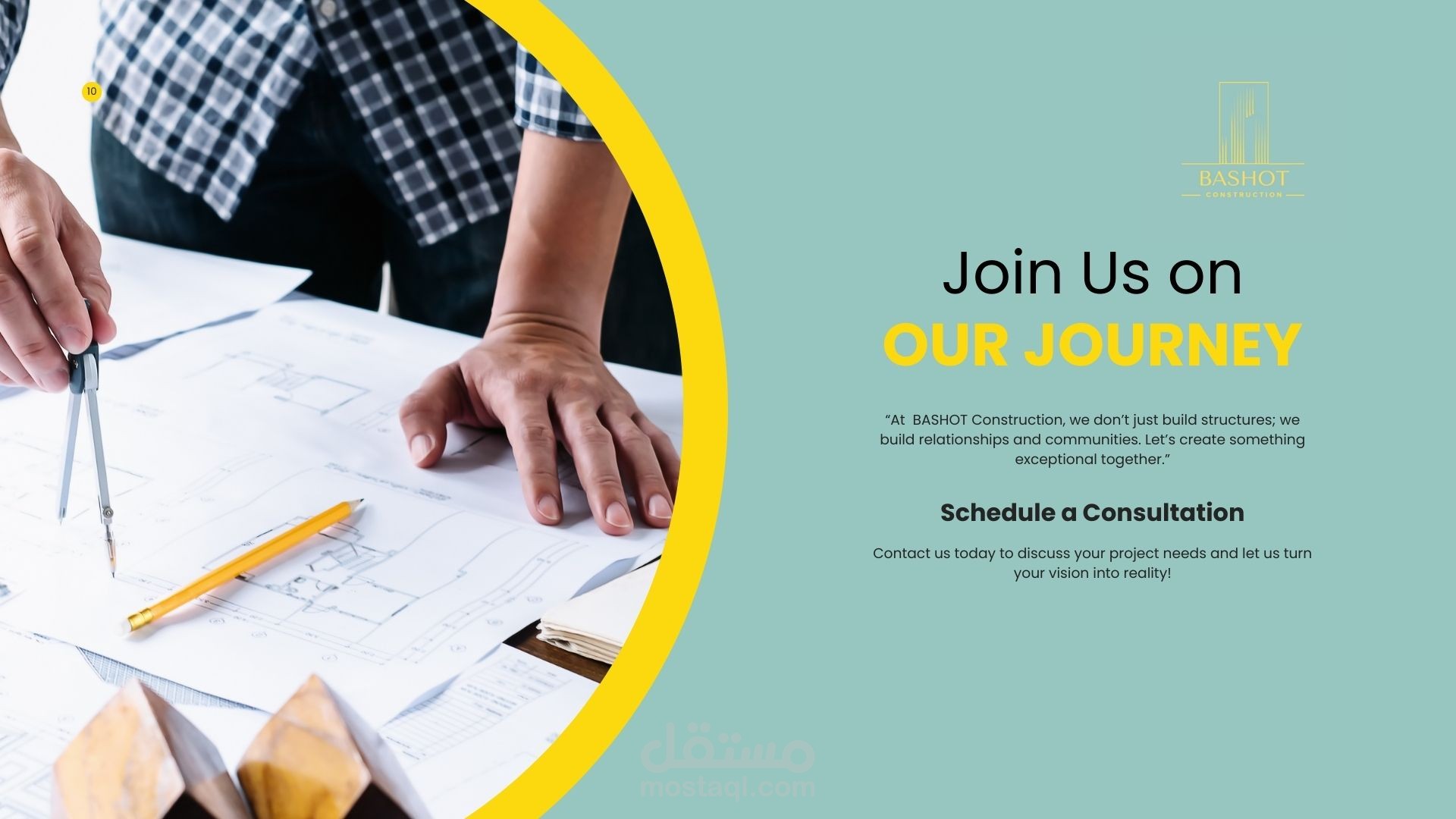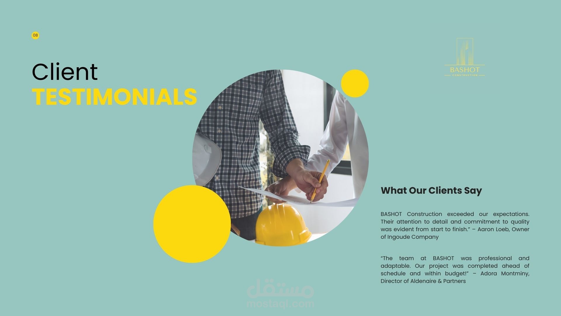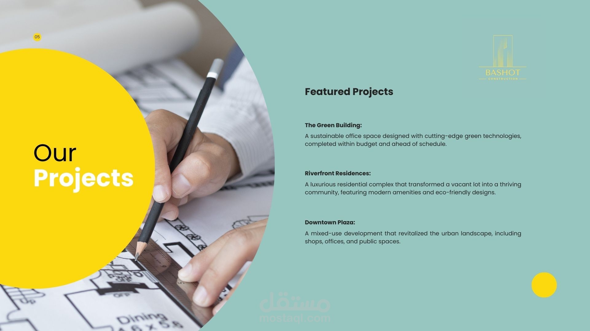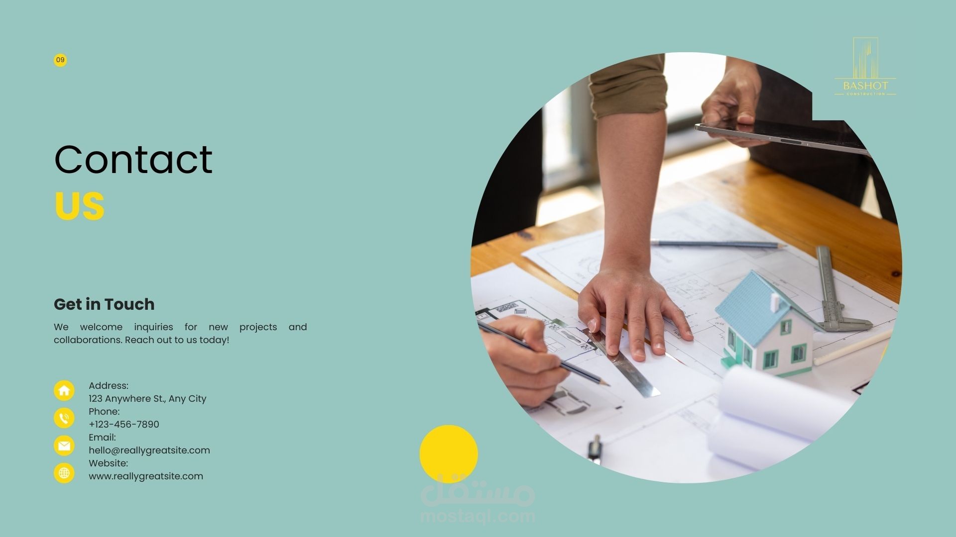 تم تصميم عرض تقديمي احترافي لشركة مقاولات (Canva) يشمل: غلاف، من نحن، الخدمات، المشاريع السابقة بالصور، العملاء، المميزات التنافسية، ووسائل التواصل.