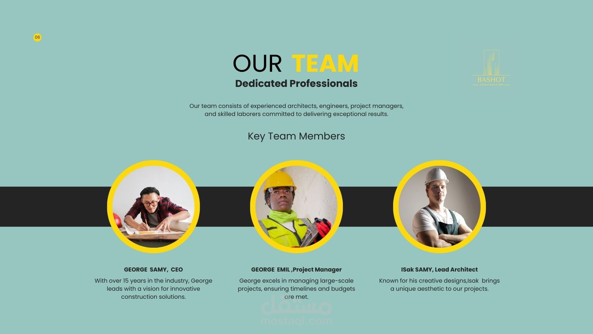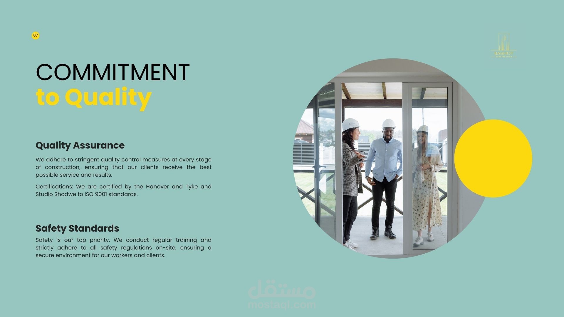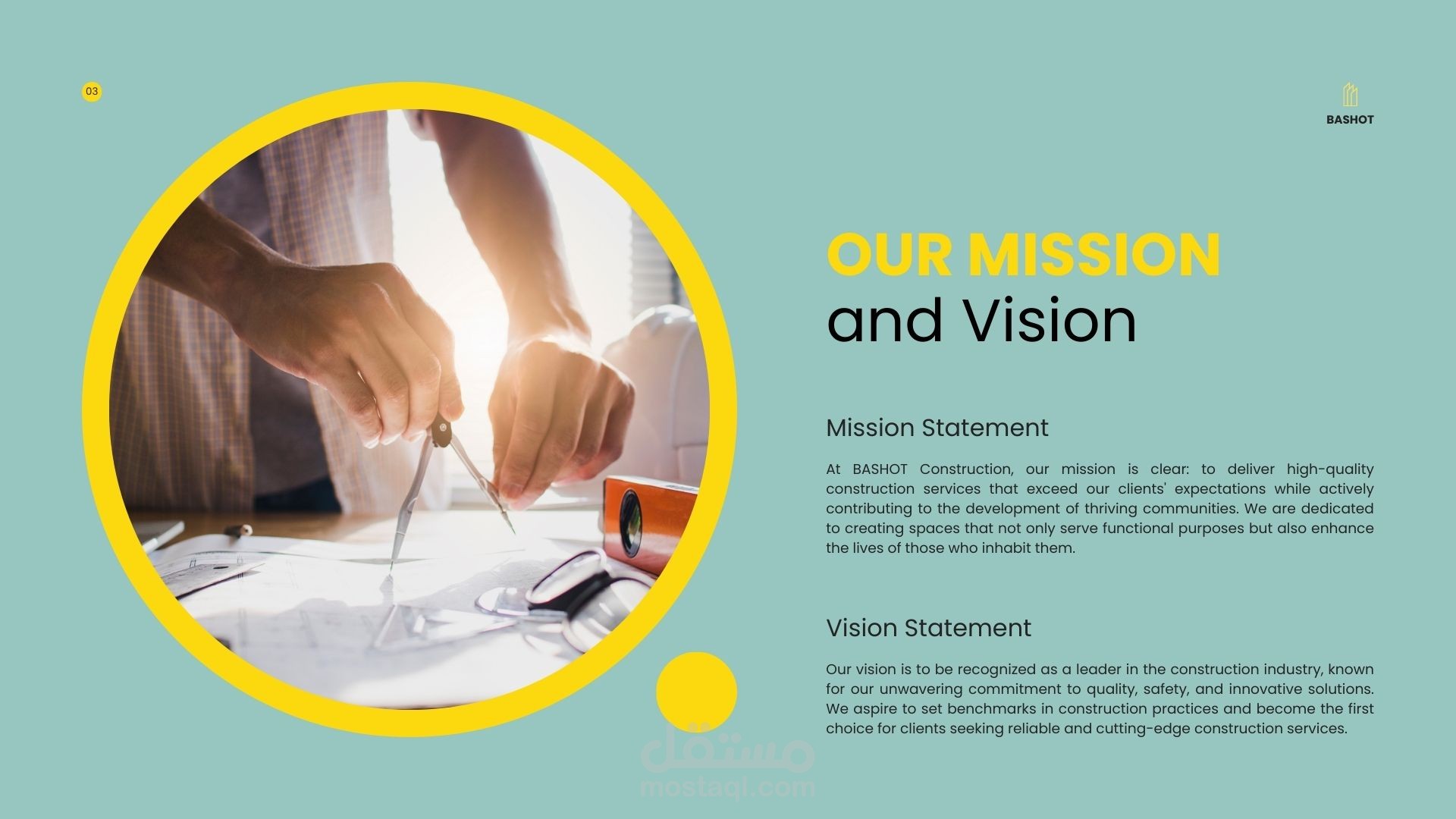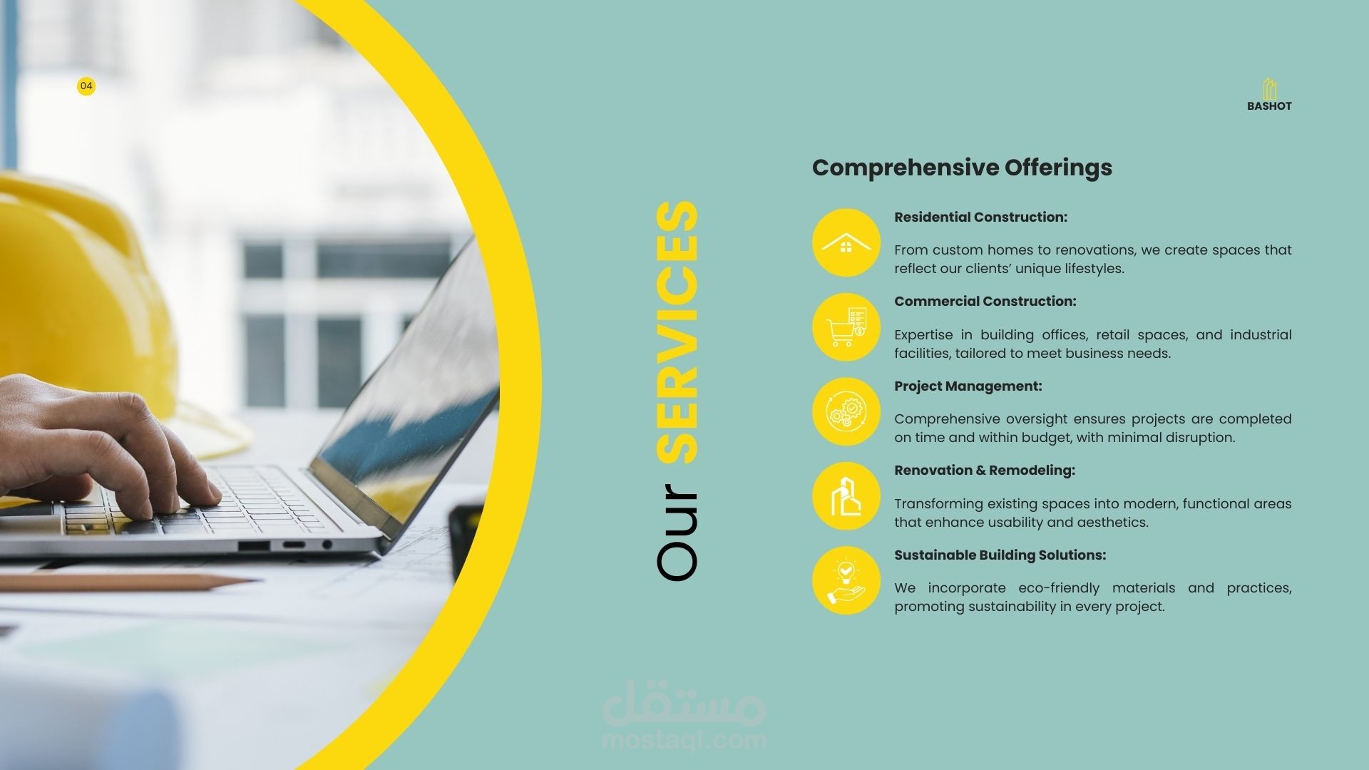 تم تصميم عرض تقديمي احترافي لشركة مقاولات (Canva) يشمل: غلاف، من نحن، الخدمات، المشاريع السابقة بالصور، العملاء، المميزات التنافسية، ووسائل التواصل.