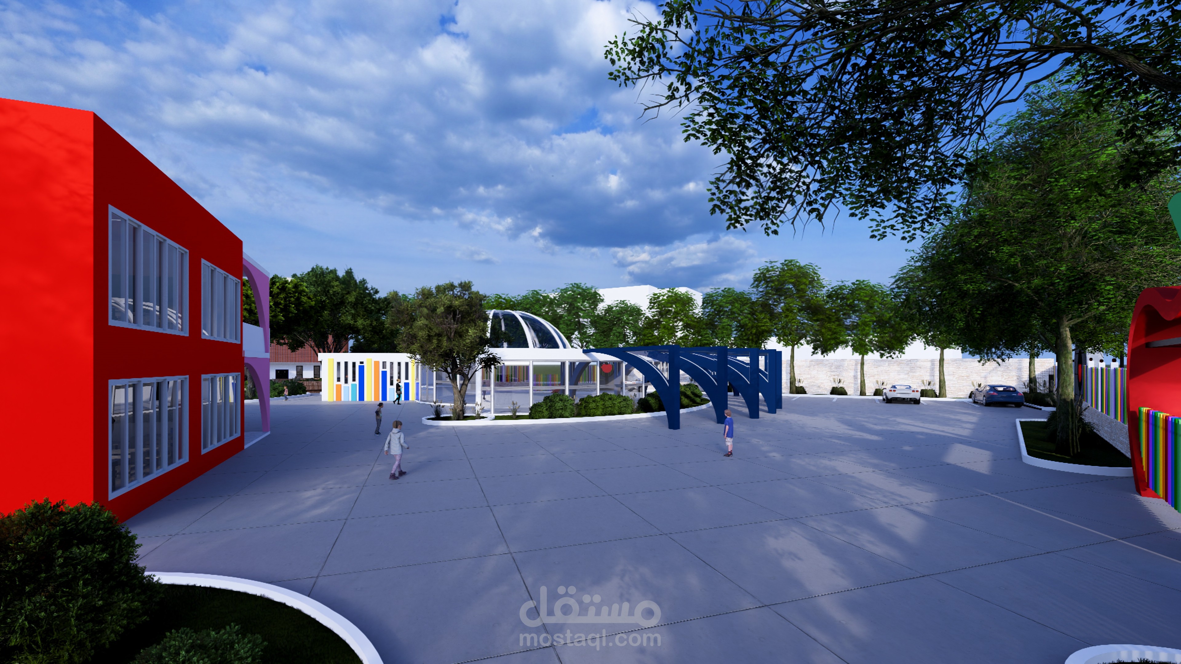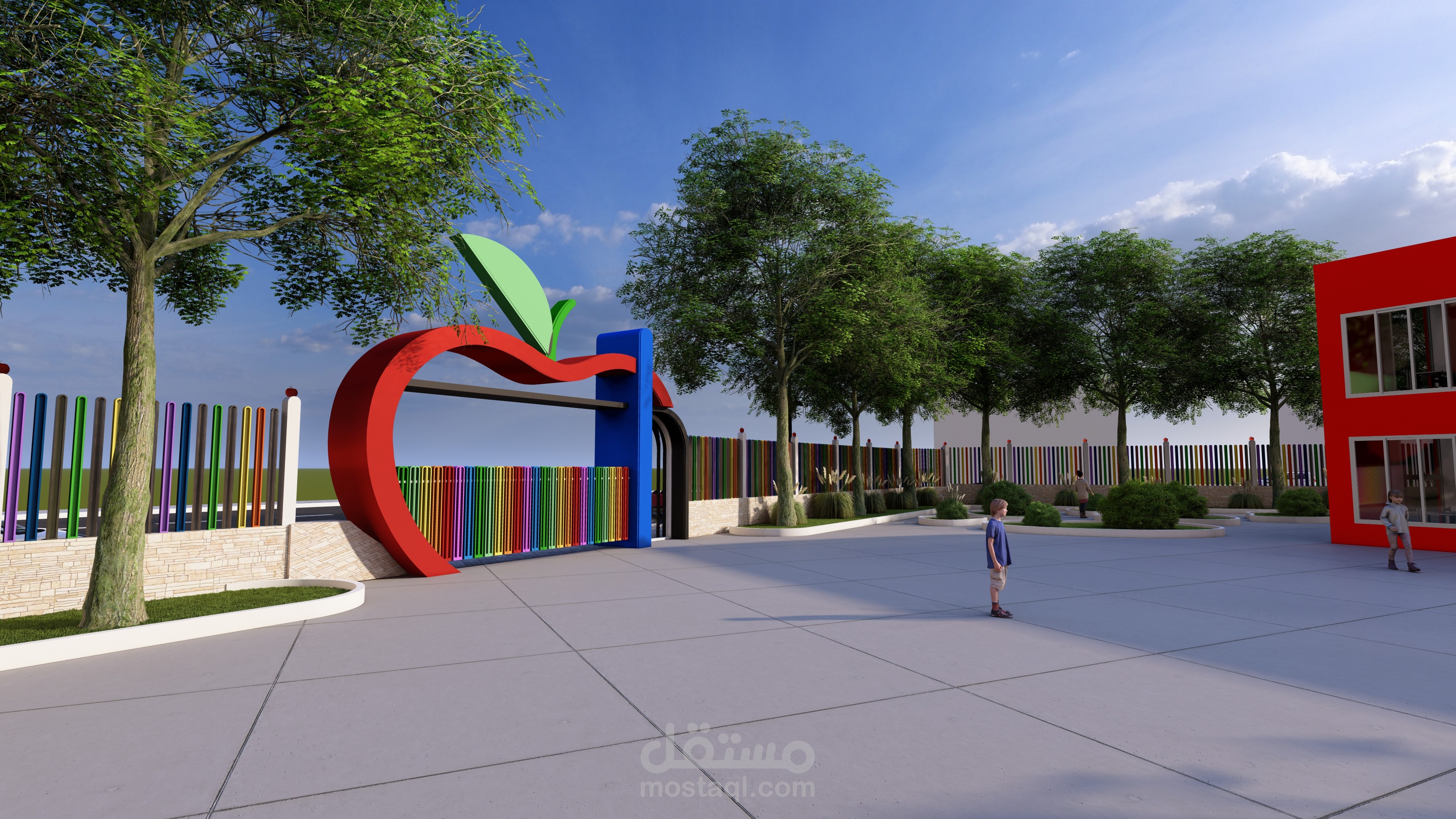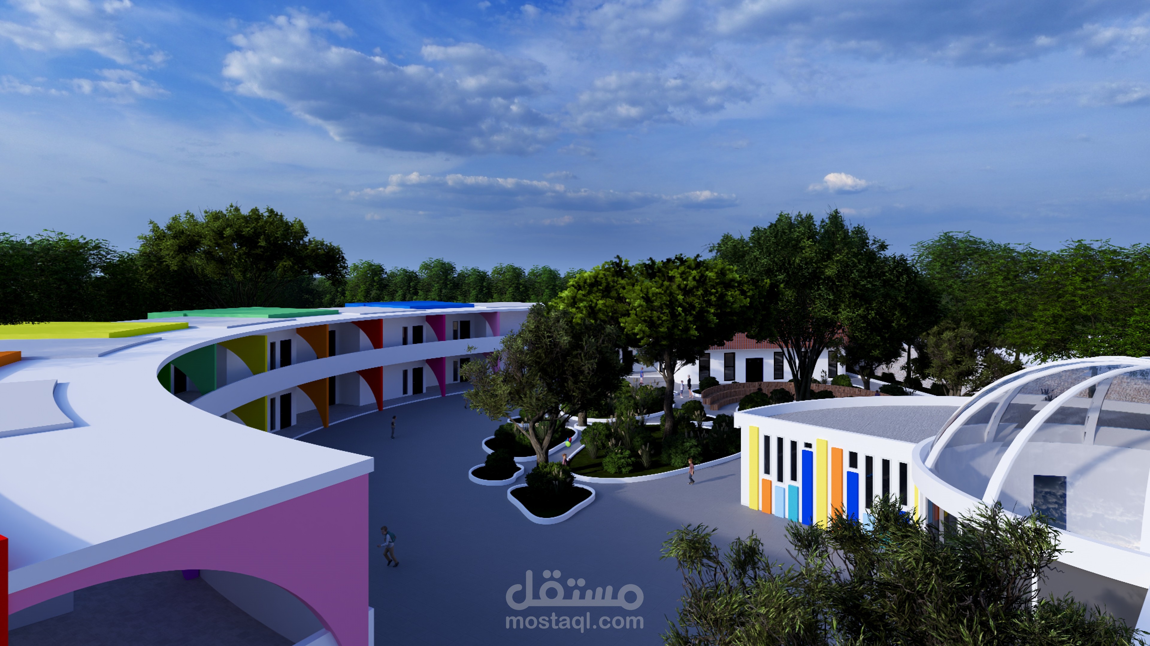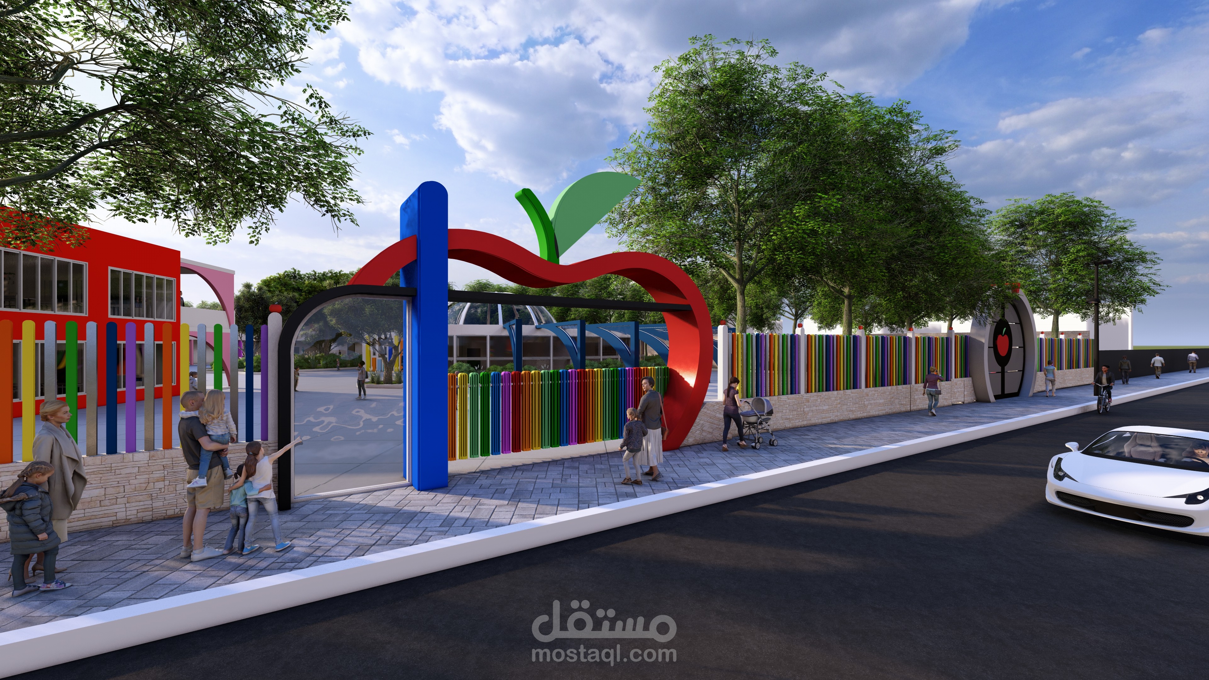 Ce complexe éducatif se distingue par une architecture ludique et accueillante, pensée pour stimuler l’imaginaire des enfants tout en assurant leur sécurité. L’entrée principale, marquée par une arche monumentale en forme de pomme aux couleurs vives, agit comme un repère visuel fort et symbolique. La clôture multicolore et les aménagements paysagers avec arbres et cheminements doux renforcent l’atmosphère chaleureuse et inclusive du lieu. La vue aérienne révèle une organisation spatiale rigoureuse : un bâtiment principal en courbe, segmenté en modules colorés, structure les fonctions pédagogiques, tandis qu’un bâtiment circulaire à toiture rayonnante, probablement dédié aux activités collectives, incarne le cœur du projet. Une cour centrale paysagée, un terrain de sport en gazon synthétique, une aire de jeux bleue et un parking bien intégré complètent l’ensemble, traduisant une vision globale de l’architecture éducative — fonctionnelle, sensorielle et profondément humaine.
