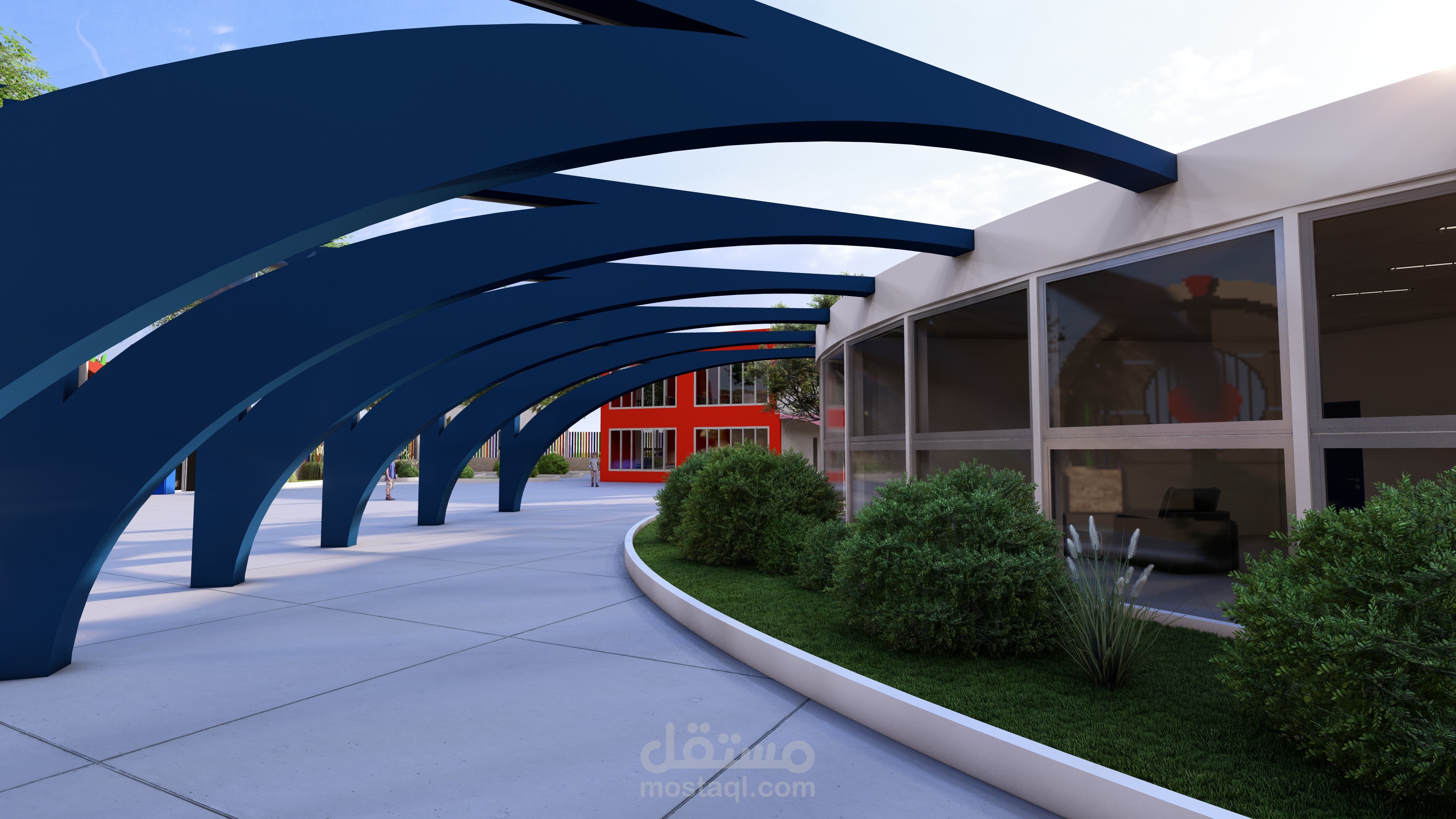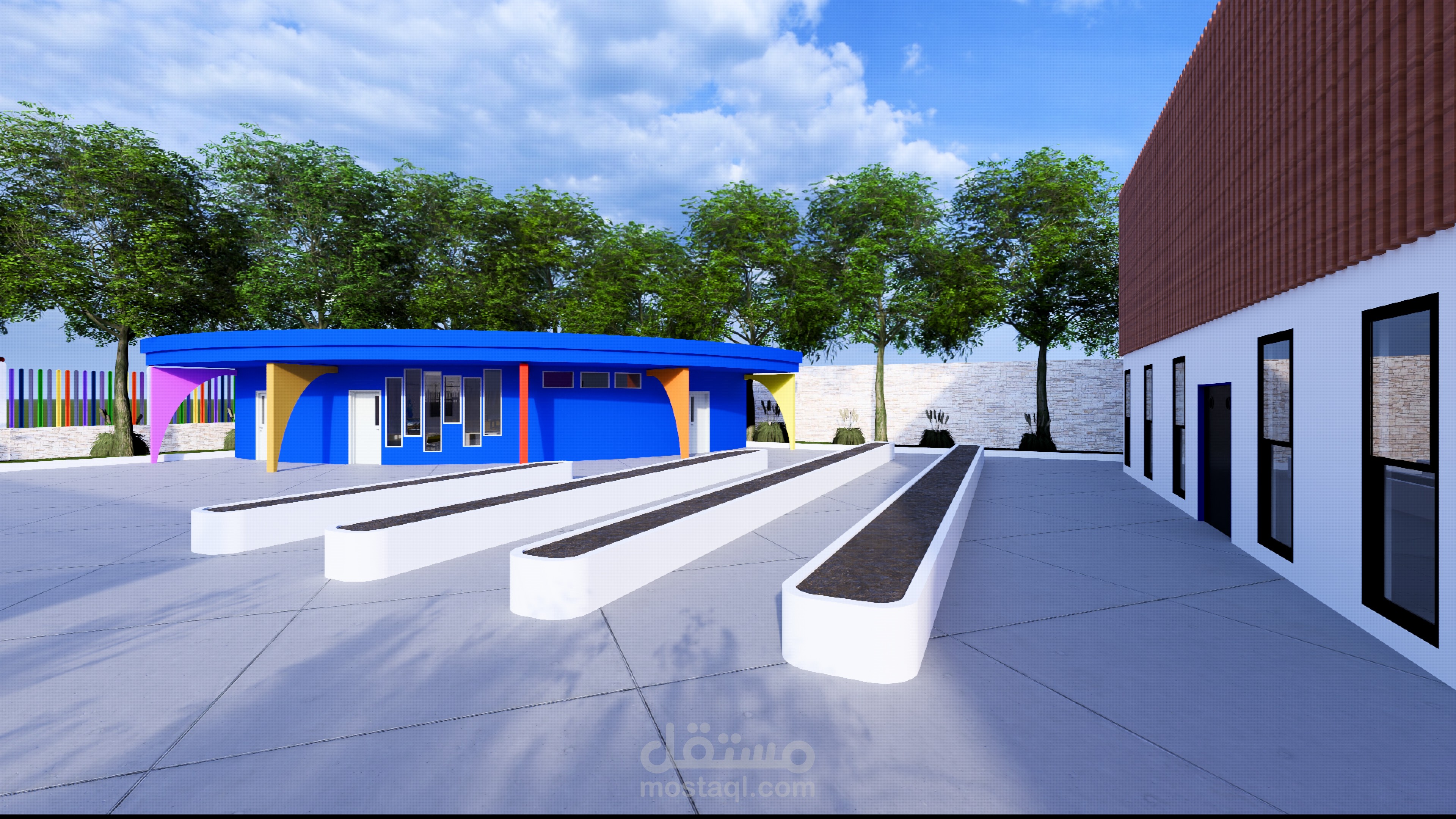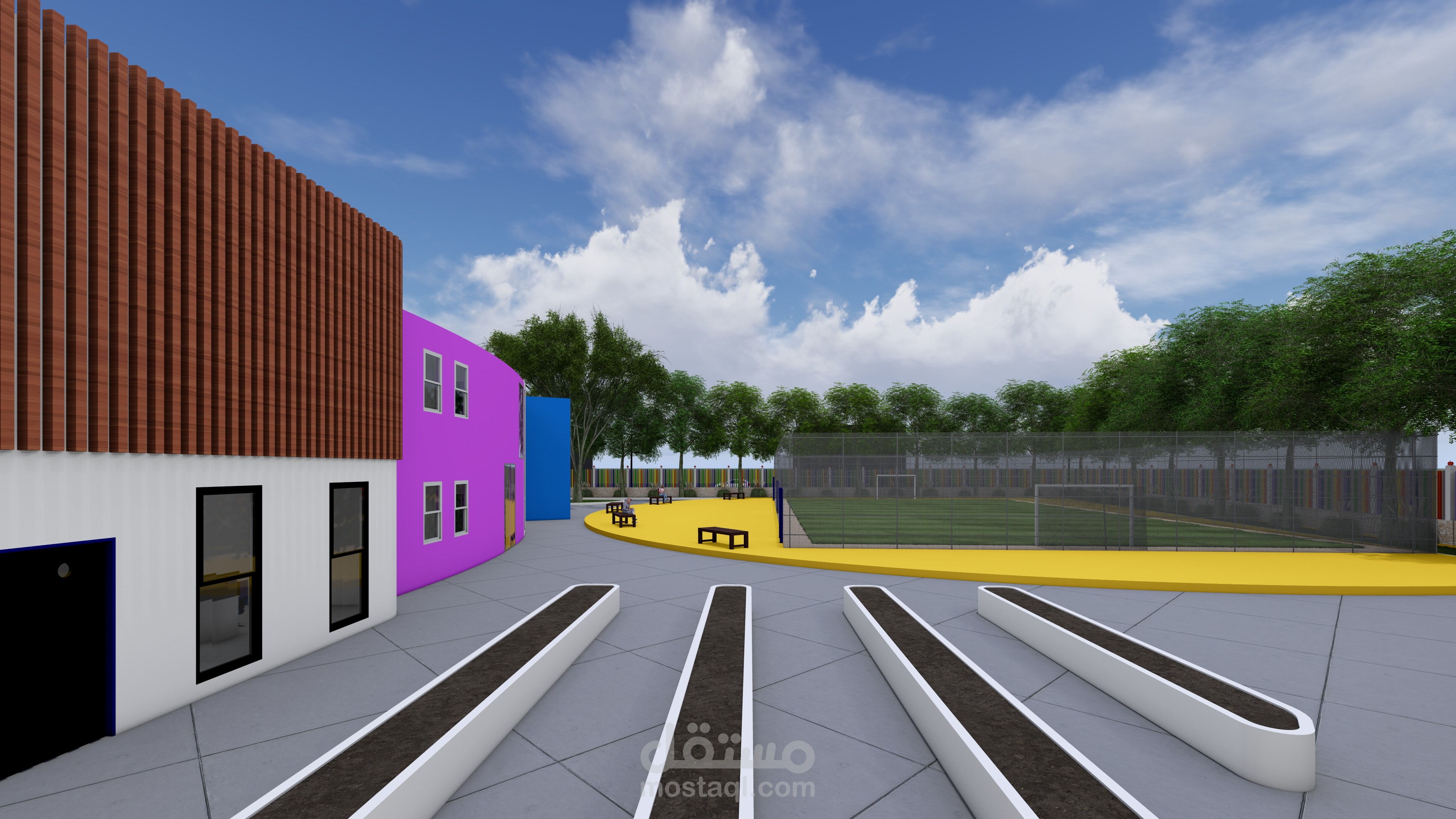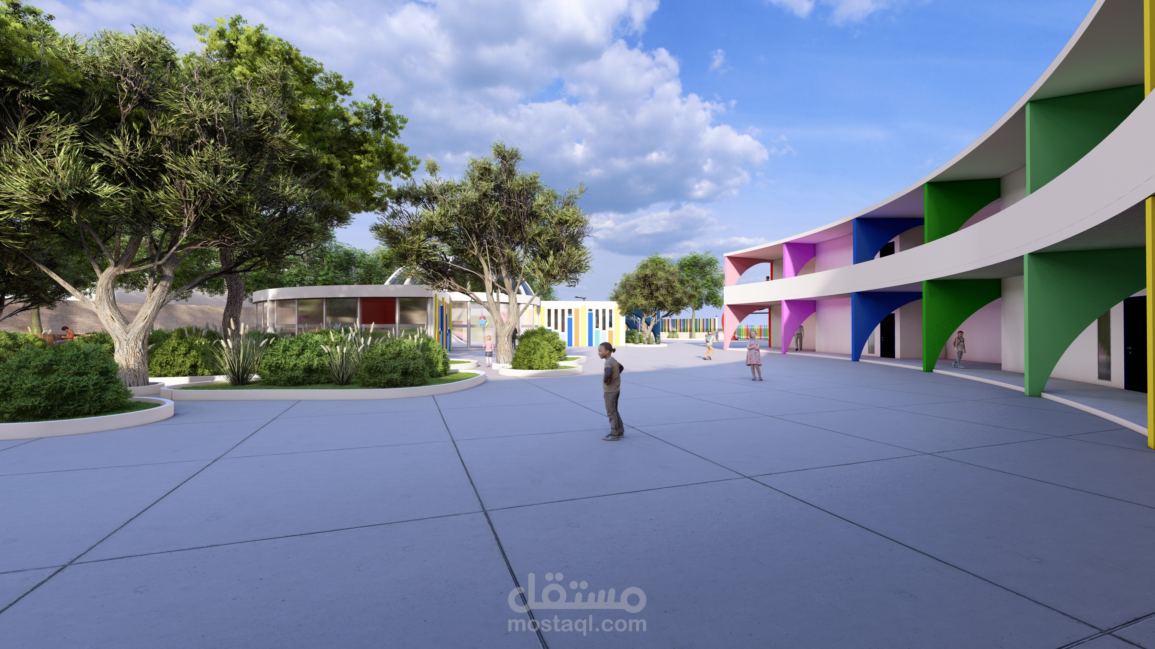 Ce complexe éducatif se distingue par une architecture ludique et accueillante, pensée pour stimuler l’imaginaire des enfants tout en assurant leur sécurité. L’entrée principale, marquée par une arche monumentale en forme de pomme aux couleurs vives, agit comme un repère visuel fort et symbolique. La clôture multicolore et les aménagements paysagers avec arbres et cheminements doux renforcent l’atmosphère chaleureuse et inclusive du lieu. La vue aérienne révèle une organisation spatiale rigoureuse : un bâtiment principal en courbe, segmenté en modules colorés, structure les fonctions pédagogiques, tandis qu’un bâtiment circulaire à toiture rayonnante, probablement dédié aux activités collectives, incarne le cœur du projet. Une cour centrale paysagée, un terrain de sport en gazon synthétique, une aire de jeux bleue et un parking bien intégré complètent l’ensemble, traduisant une vision globale de l’architecture éducative — fonctionnelle, sensorielle et profondément humaine.