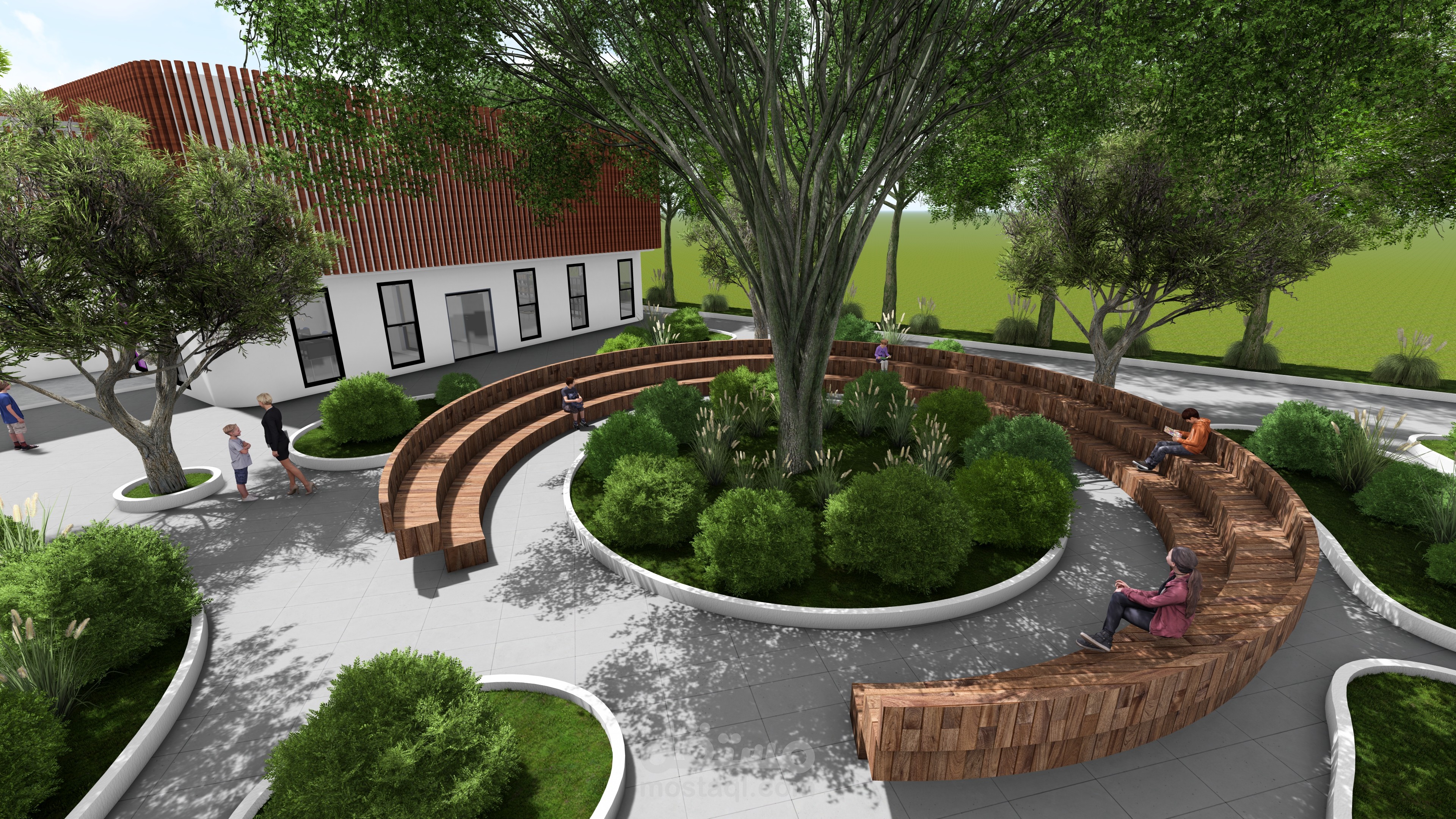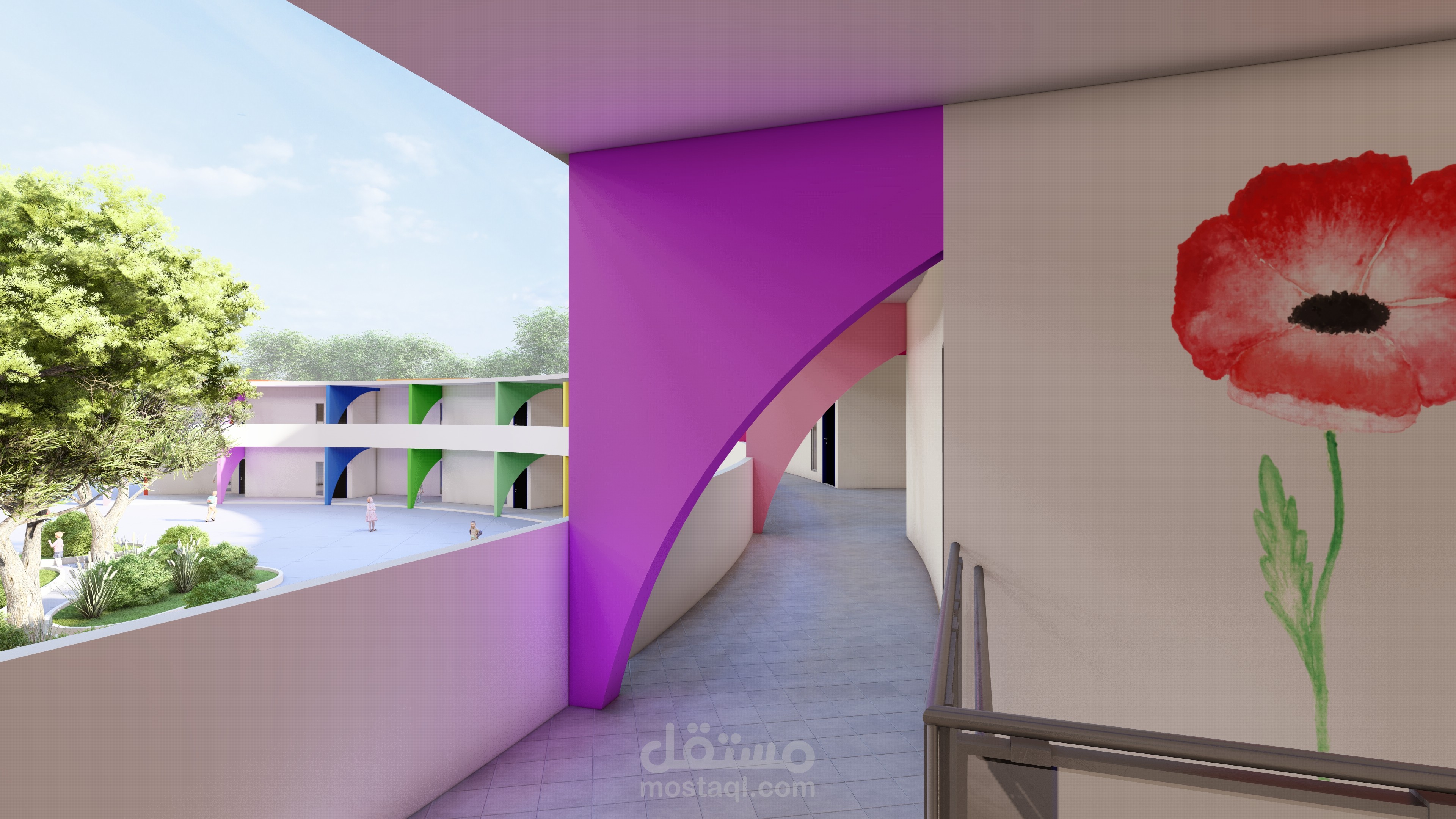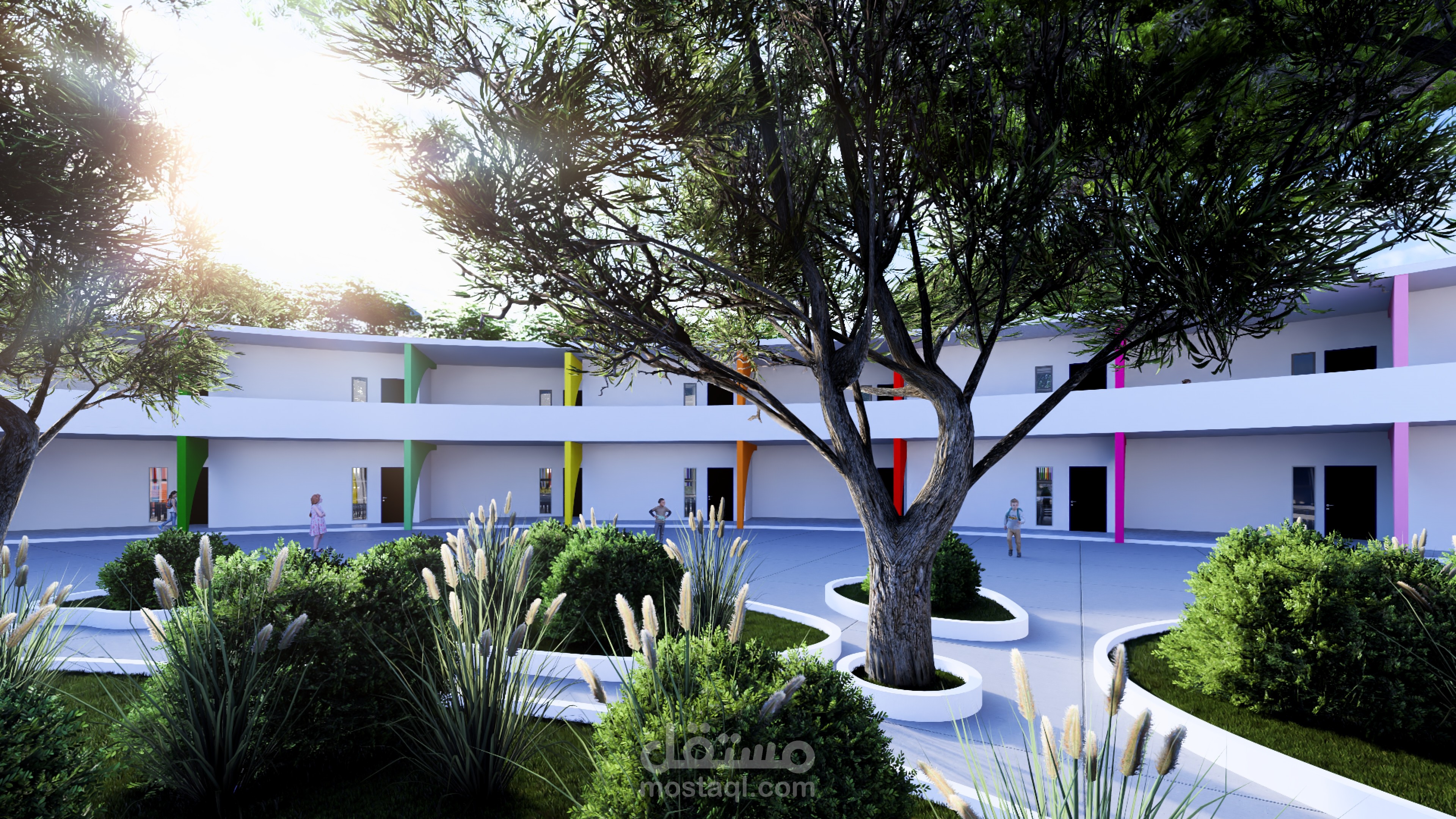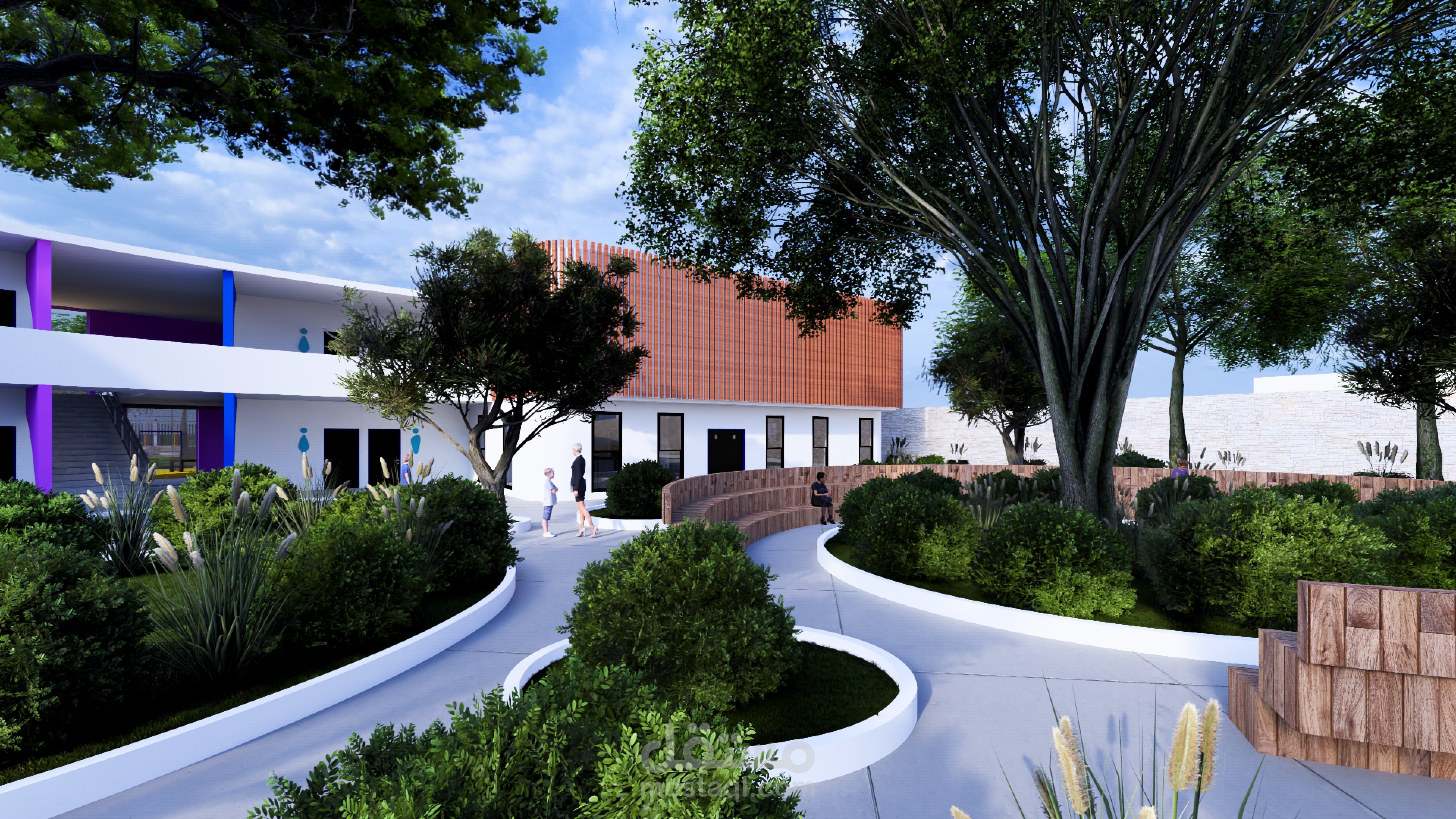 Ce complexe éducatif se distingue par une architecture ludique et accueillante, pensée pour stimuler l’imaginaire des enfants tout en assurant leur sécurité. L’entrée principale, marquée par une arche monumentale en forme de pomme aux couleurs vives, agit comme un repère visuel fort et symbolique. La clôture multicolore et les aménagements paysagers avec arbres et cheminements doux renforcent l’atmosphère chaleureuse et inclusive du lieu. La vue aérienne révèle une organisation spatiale rigoureuse : un bâtiment principal en courbe, segmenté en modules colorés, structure les fonctions pédagogiques, tandis qu’un bâtiment circulaire à toiture rayonnante, probablement dédié aux activités collectives, incarne le cœur du projet. Une cour centrale paysagée, un terrain de sport en gazon synthétique, une aire de jeux bleue et un parking bien intégré complètent l’ensemble, traduisant une vision globale de l’architecture éducative — fonctionnelle, sensorielle et profondément humaine.