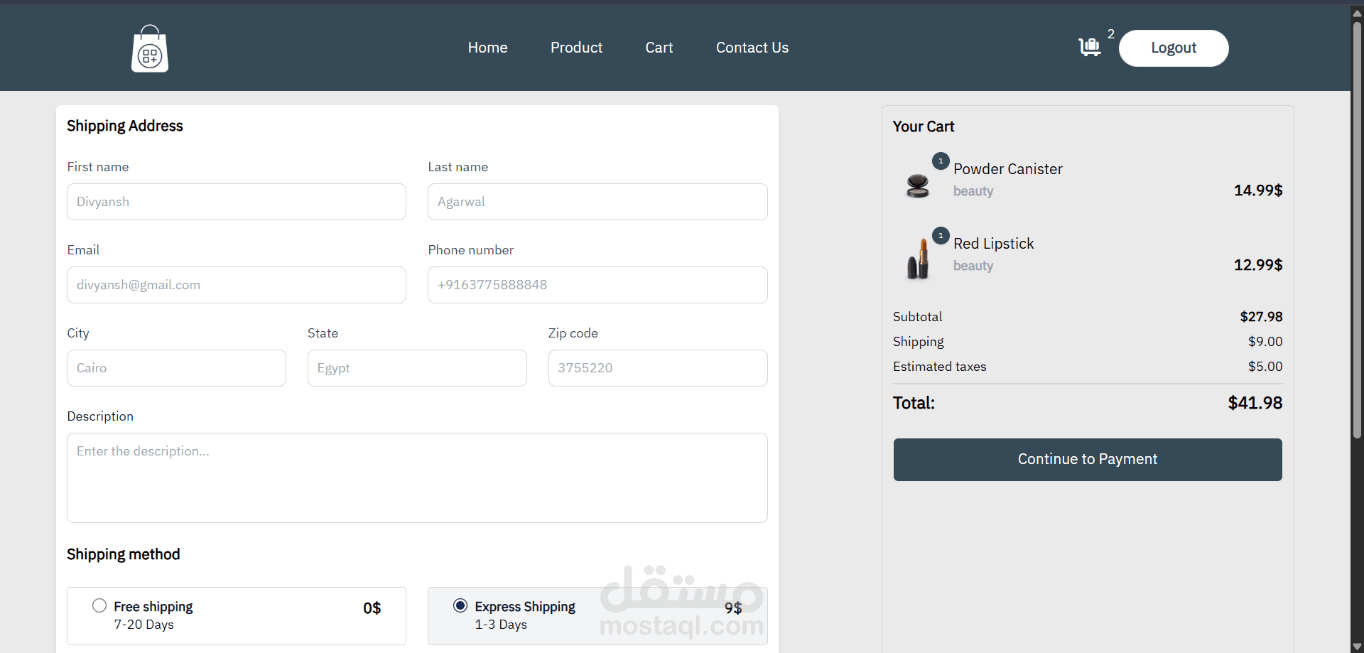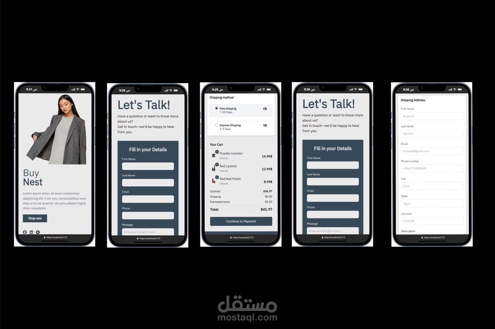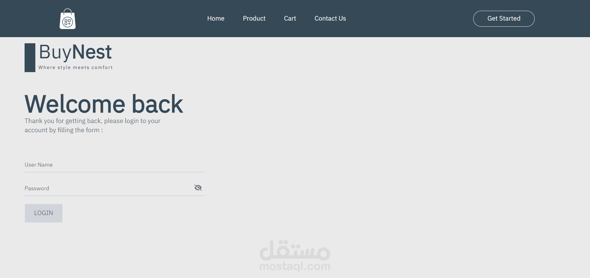قمت بتطوير موقع BuyNest للتجارة الإلكترونية باستخدام React مع TailwindCSS و HTML، حيث قمت بتصميم الواجهات بالكامل بنفسي بما يتناسب مع تجربة المستخدم وسهولة التصفح.