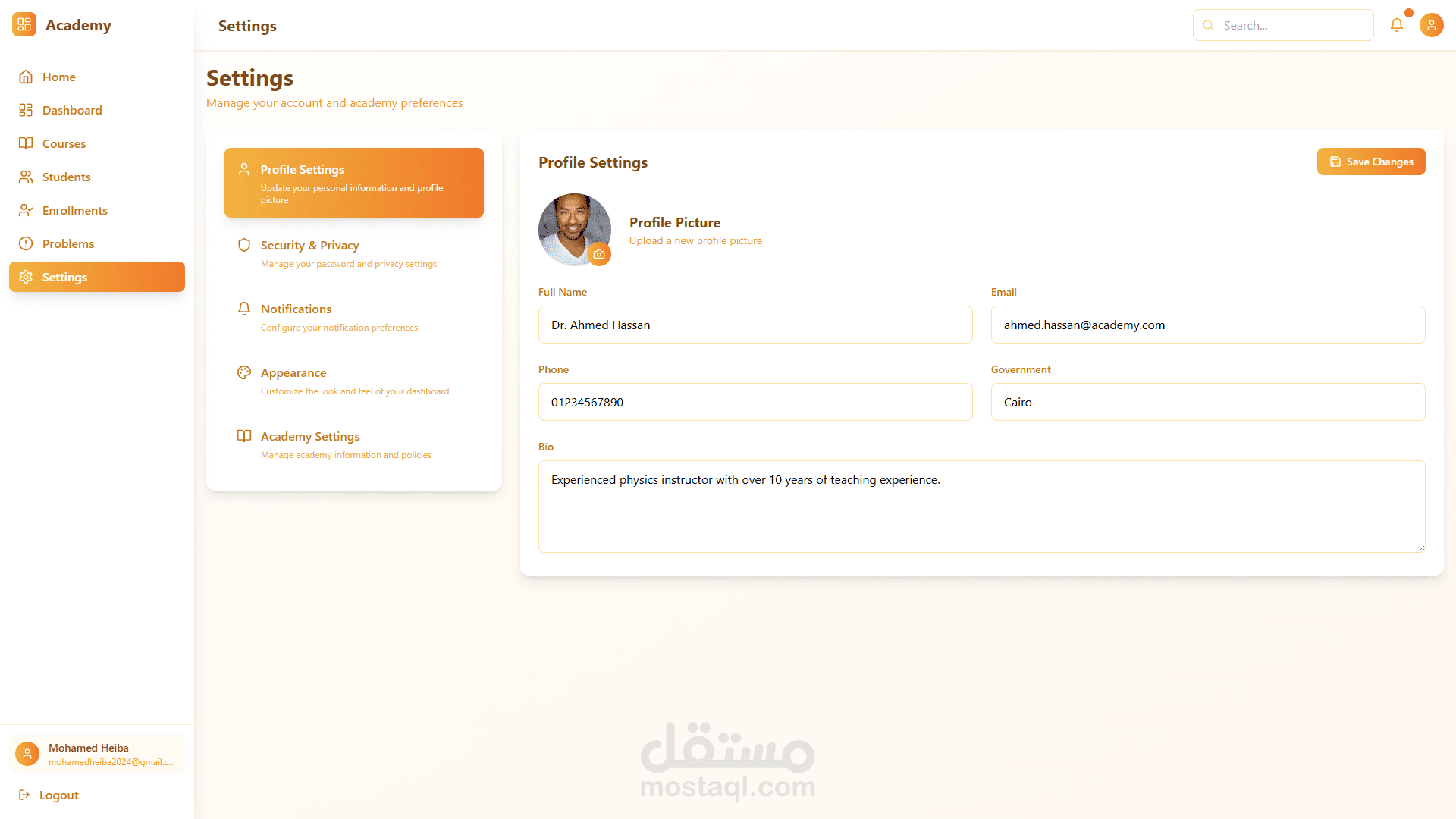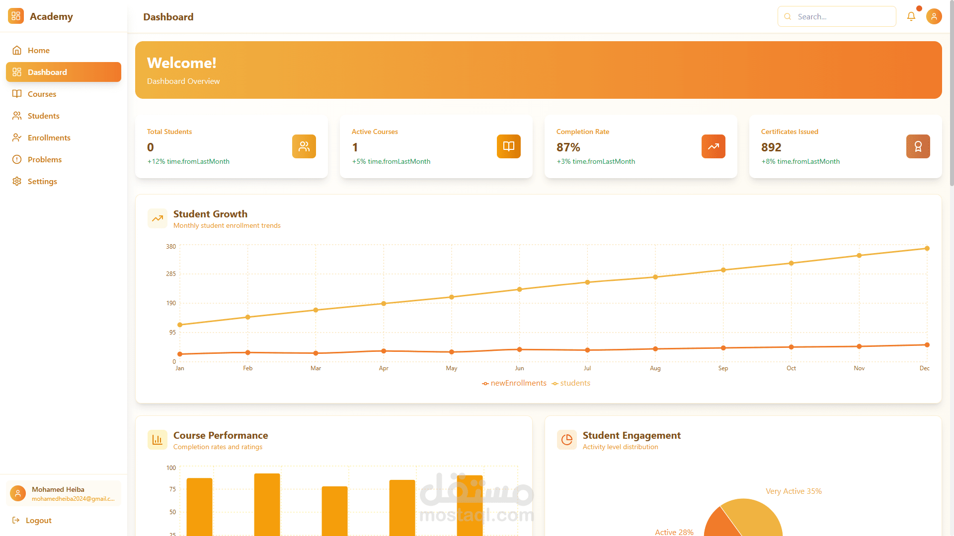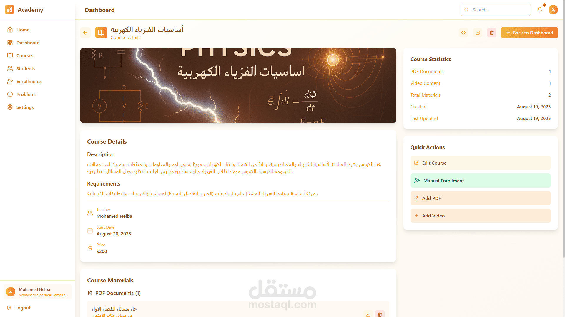 لوحات تحكم للمدرسين لمتابعة تقدّم الطلاب، رفع الدروس، وإدارة الكورسات.