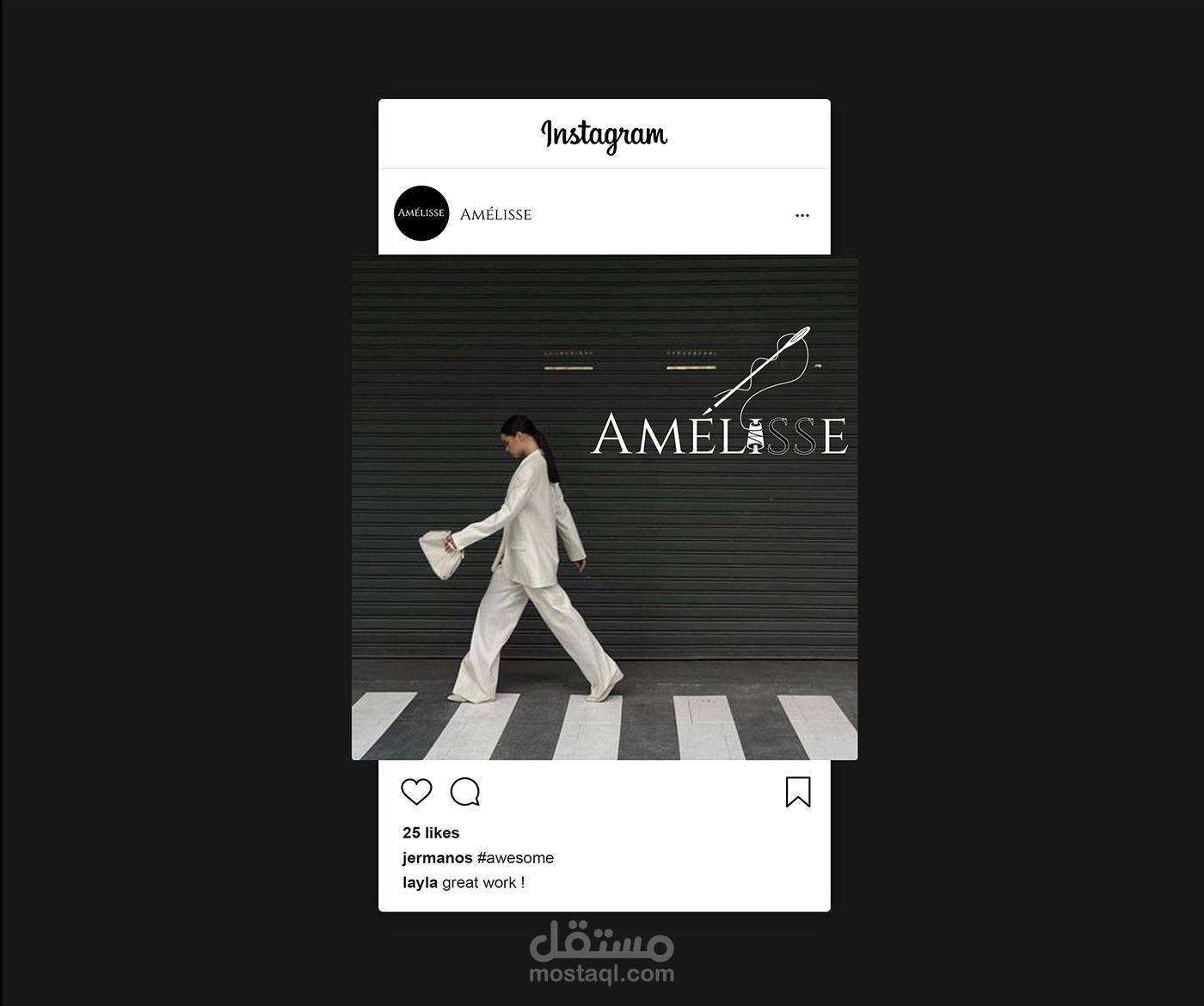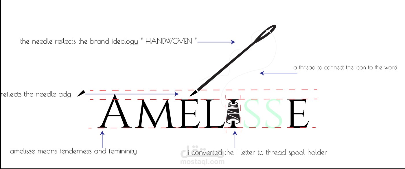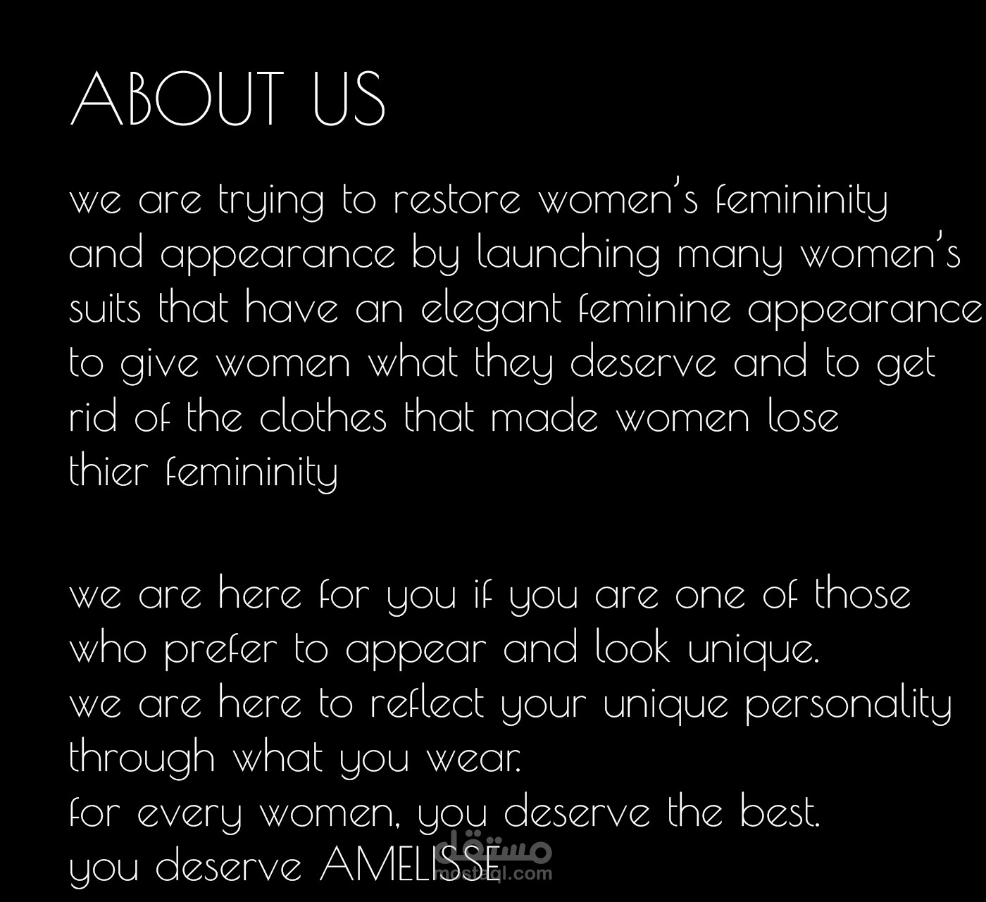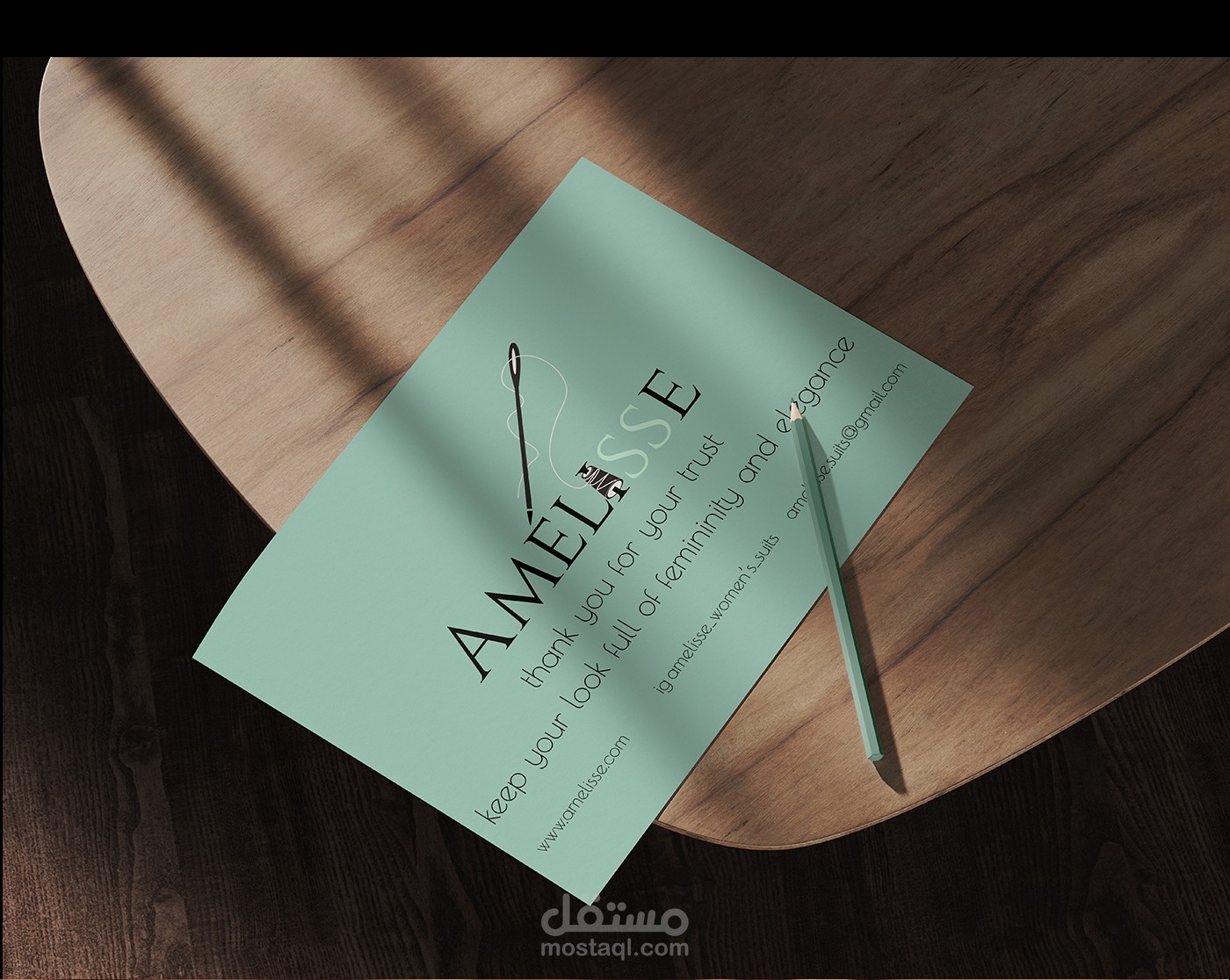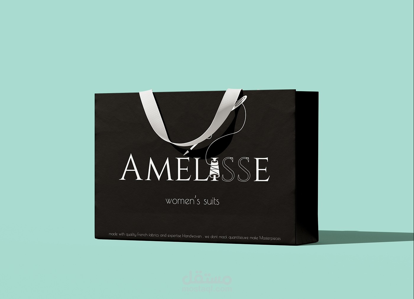 انه عبارة عن علامة تجارية جديدة اسستها مجموعة من النساء حتى يتمكنون من تقديم الملابس الرسميه المناسبه للنساء و ينتجون البدل النسائية و بعض الازياء الرسمية ل سهرات العمل و غيره و قمت بالعمل على هذا المشروع في توليد شعار يعبر عن ما يقومون به و الفكرة الرئيسية للعلامة و هي الحياكة اليدويه و الاهتمام بالتفاصيل لذا اتخذت الابرة و الخيط ك فكرة و قمت بدمجهم مع الاسم النسائي amelisse الذي يعبر عن الانوثة و كما قمت ايضا بالعمل على الهويه ك كل من حيث الالوان و الشعار و الخطوط و التغليف و ليبول الملابس
