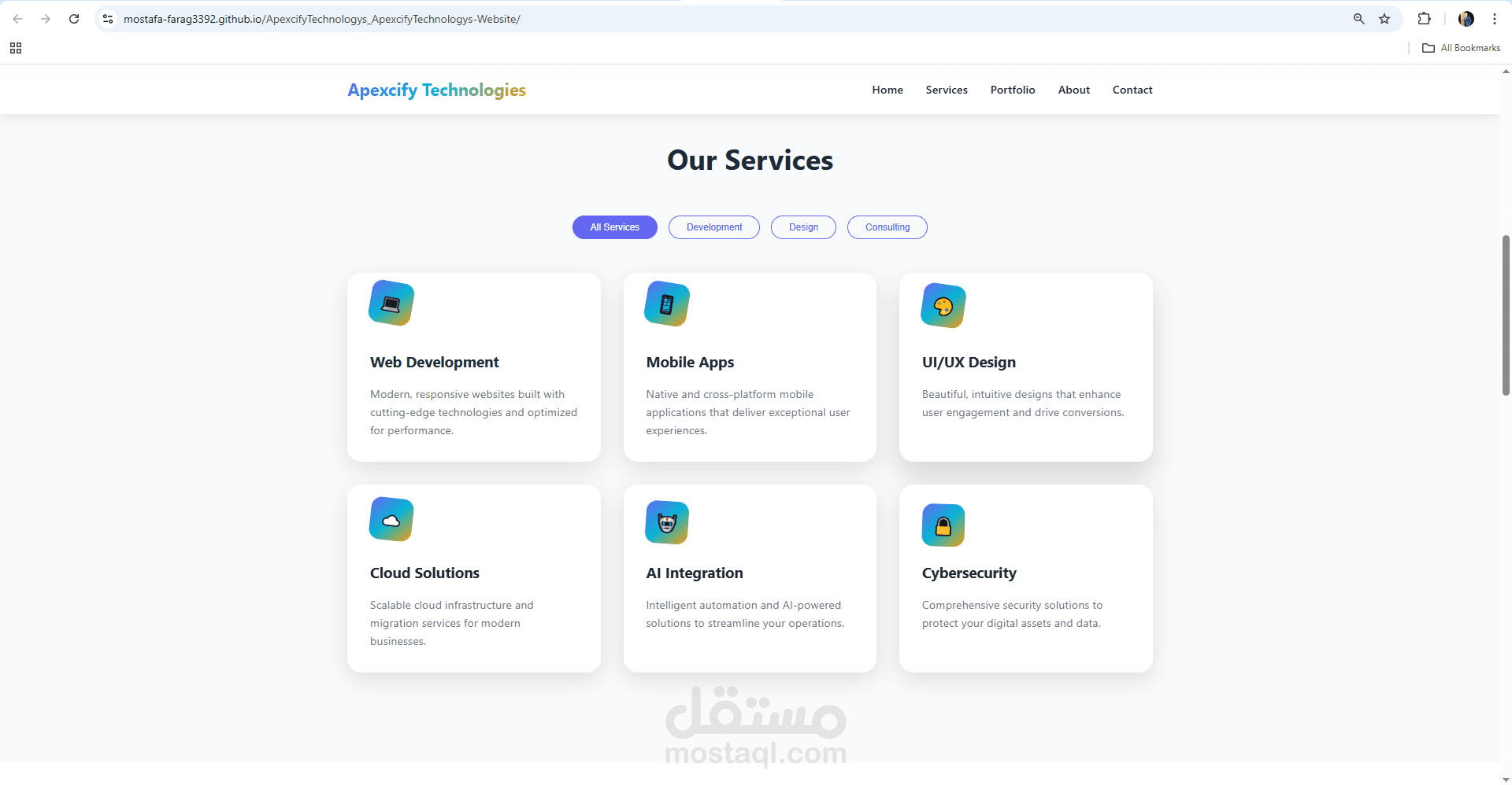Services: عرض شامل لخدمات الشركة مثل Web Development، Mobile Apps، UI/UX Design، Cloud Solutions، AI Integration، Cybersecurity.
