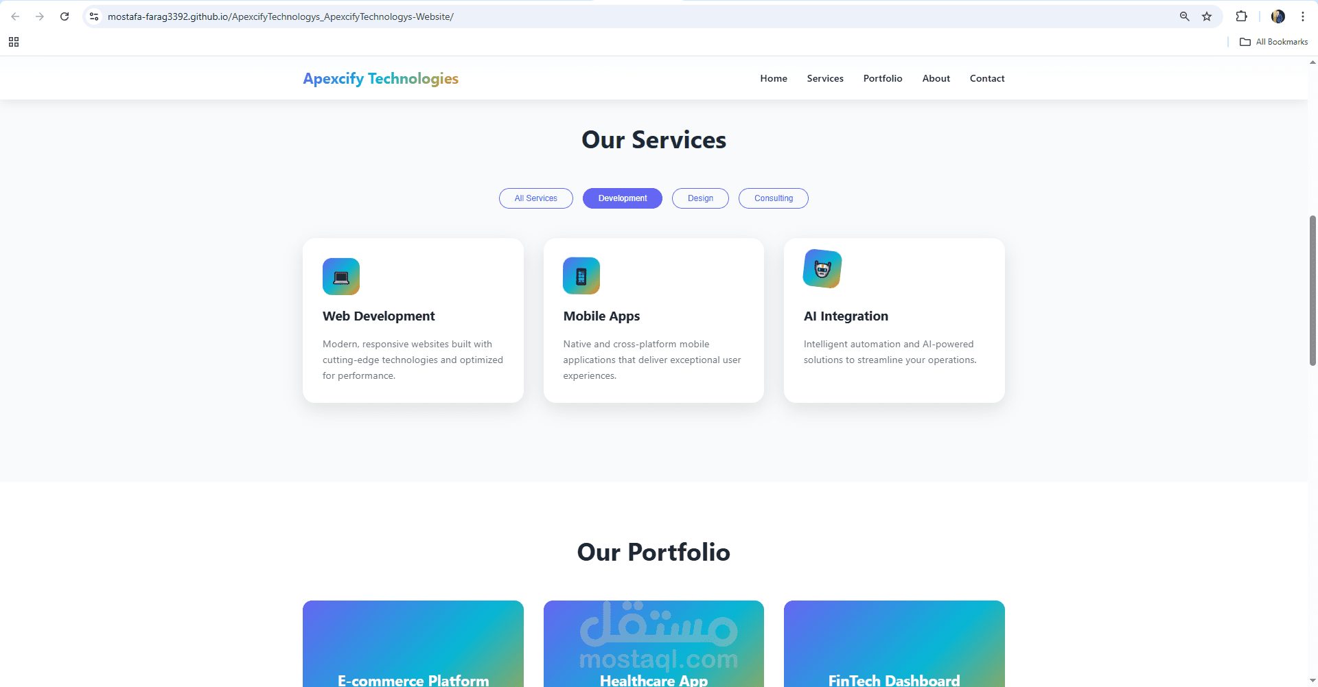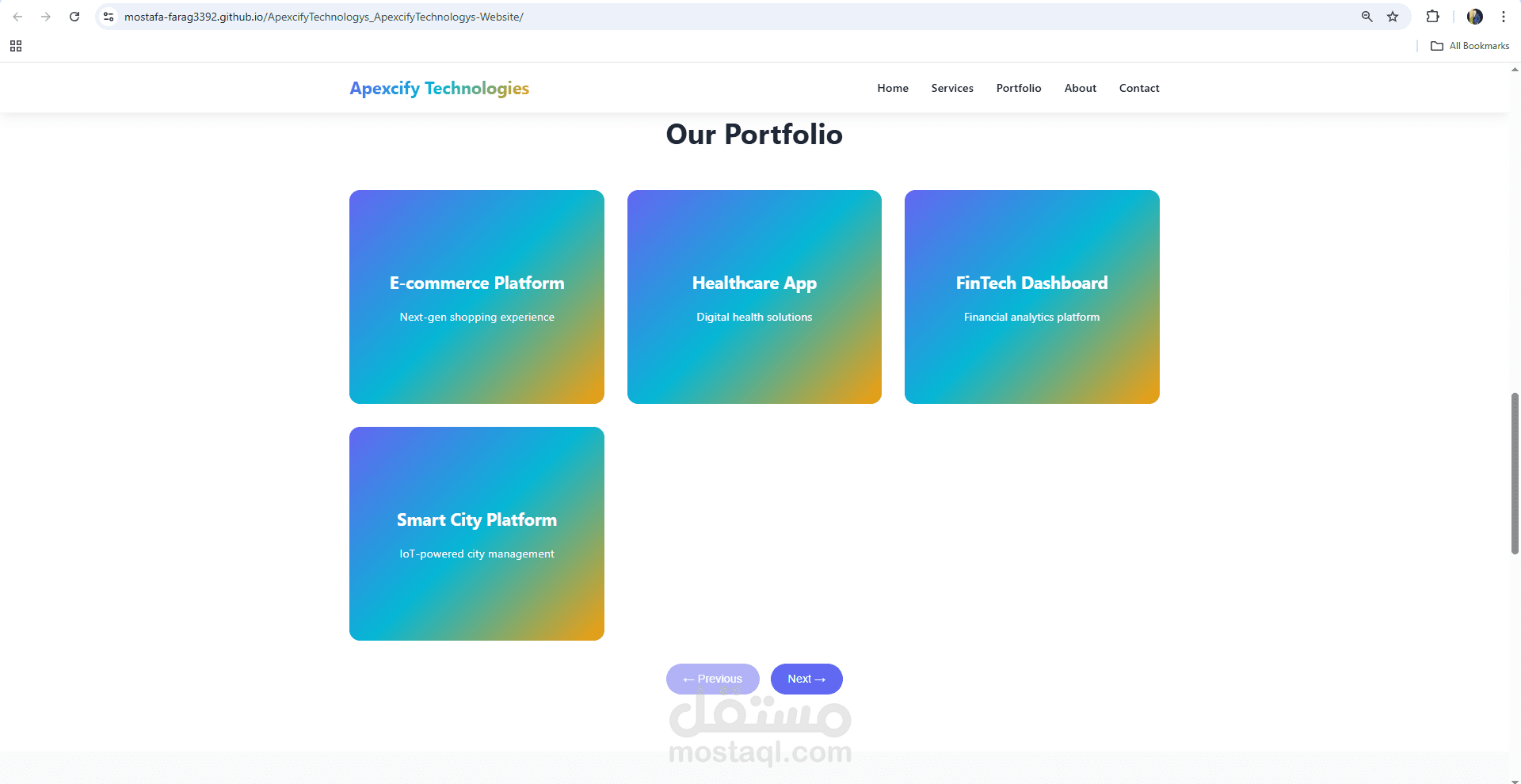 Portfolio: عرض نماذج مشاريع مثل E-commerce Platform، Healthcare App، FinTech Dashboard، Smart City Platform، مع تصميم عرض متكرر.