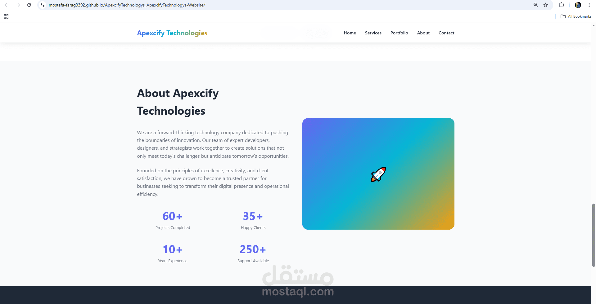 شريط تنقل (Navbar) واضح يحتوى على أقسام مثل: Home، Services، Portfolio، About، Contact.