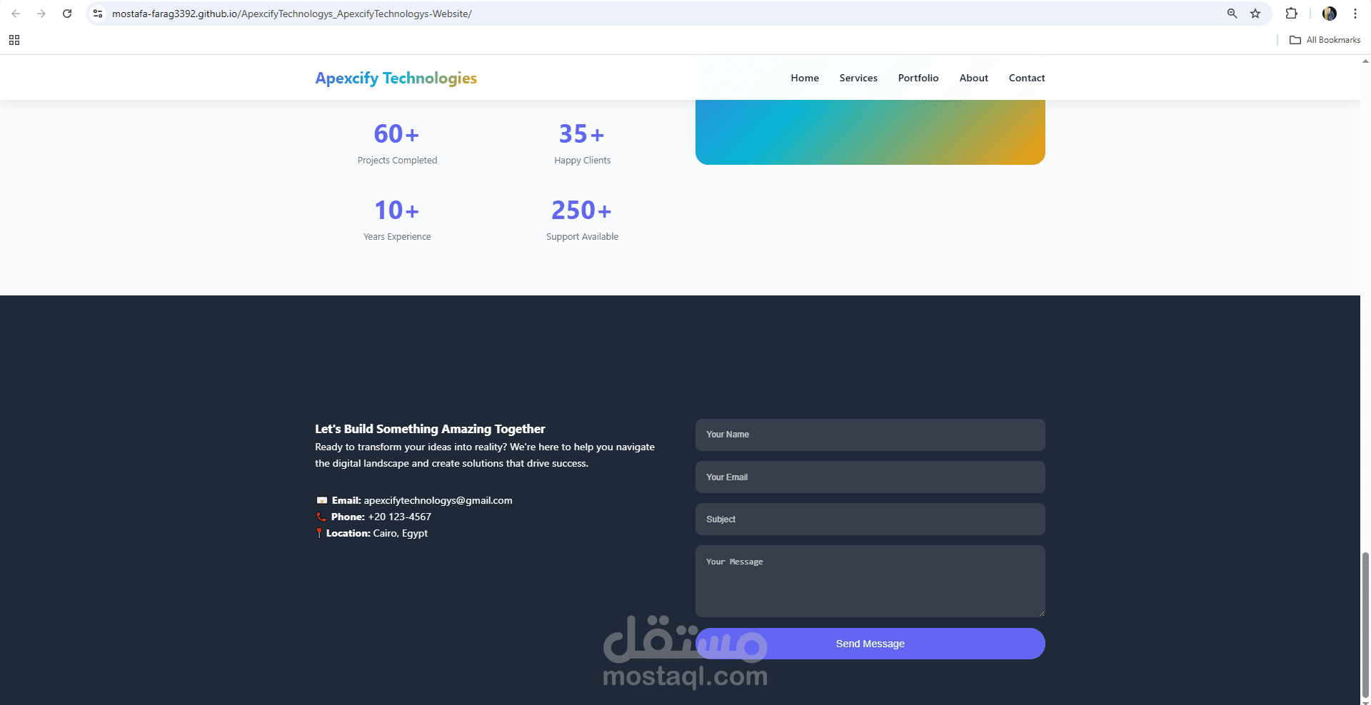 Contact: يوفر البريد الإلكتروني، رقم الهاتف، موقع الشركة (القاهرة – مصر)، بالإضافة إلى نموذج للتواصل المباشر.