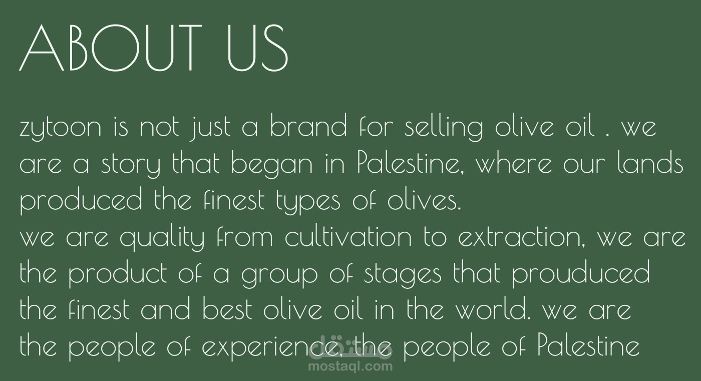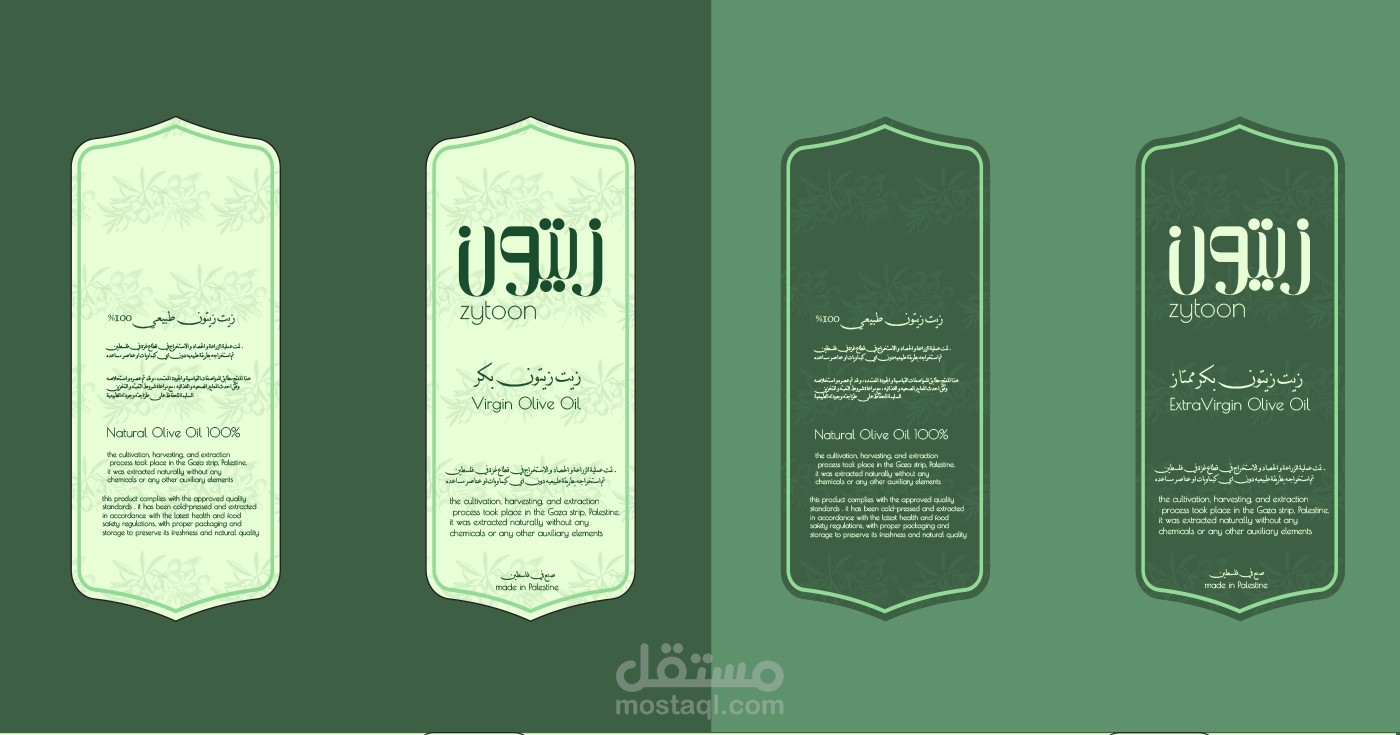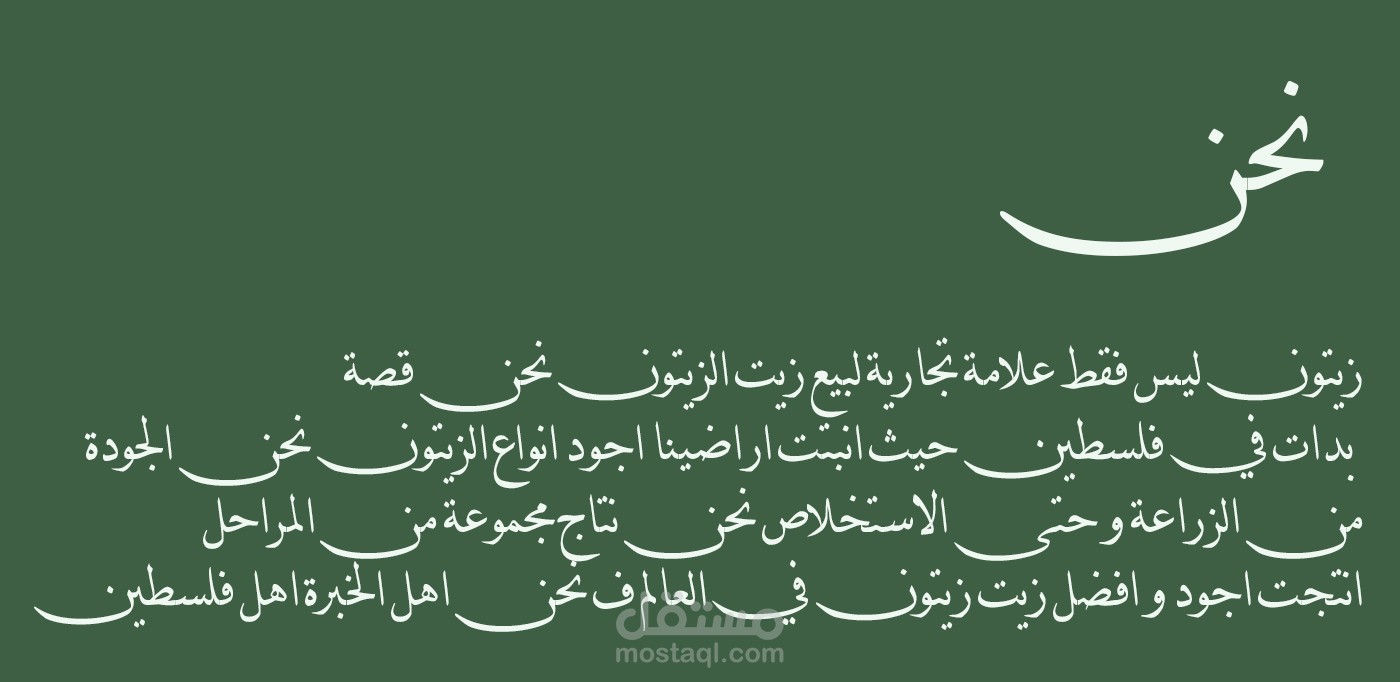 زيتون هو علامة تجارية فلسطينية متخصصة في زيت الزيتون العمل على هذه العلامة التجارية كان من امتع الاعمال التي قمت بها فط ف لقد قمت بالعمل على شعار تيبوغرافي عربي اصيل يعكس روح الجوده و المرونه و الاهتمام بالتفاصيل ف هم يهتمون بكل شئ من الزراعة و حتى الاستخلاص و كذلك قمت بتصميم الاغلفة و الملصقات التي ستوضع على المنتجات و تصميم الهويه البصريه كاملة