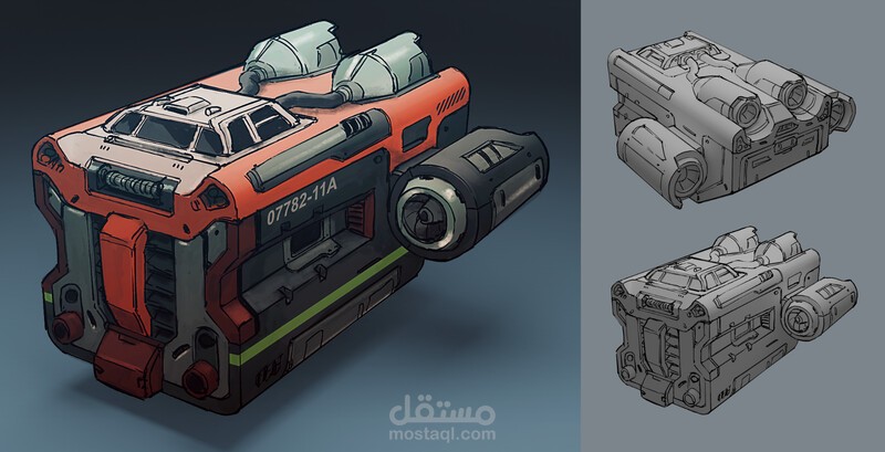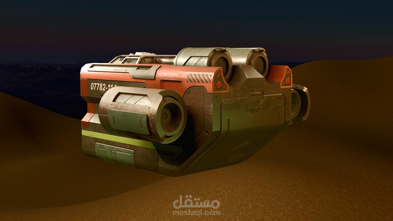 High-quality sci-fi spaceship vehicle design. The model was built with clean topology for optimal detail and performance, textured in Substance Painter with attention to realistic materials, and rendered with a strong focus on lighting and presentation to showcase the overall design.