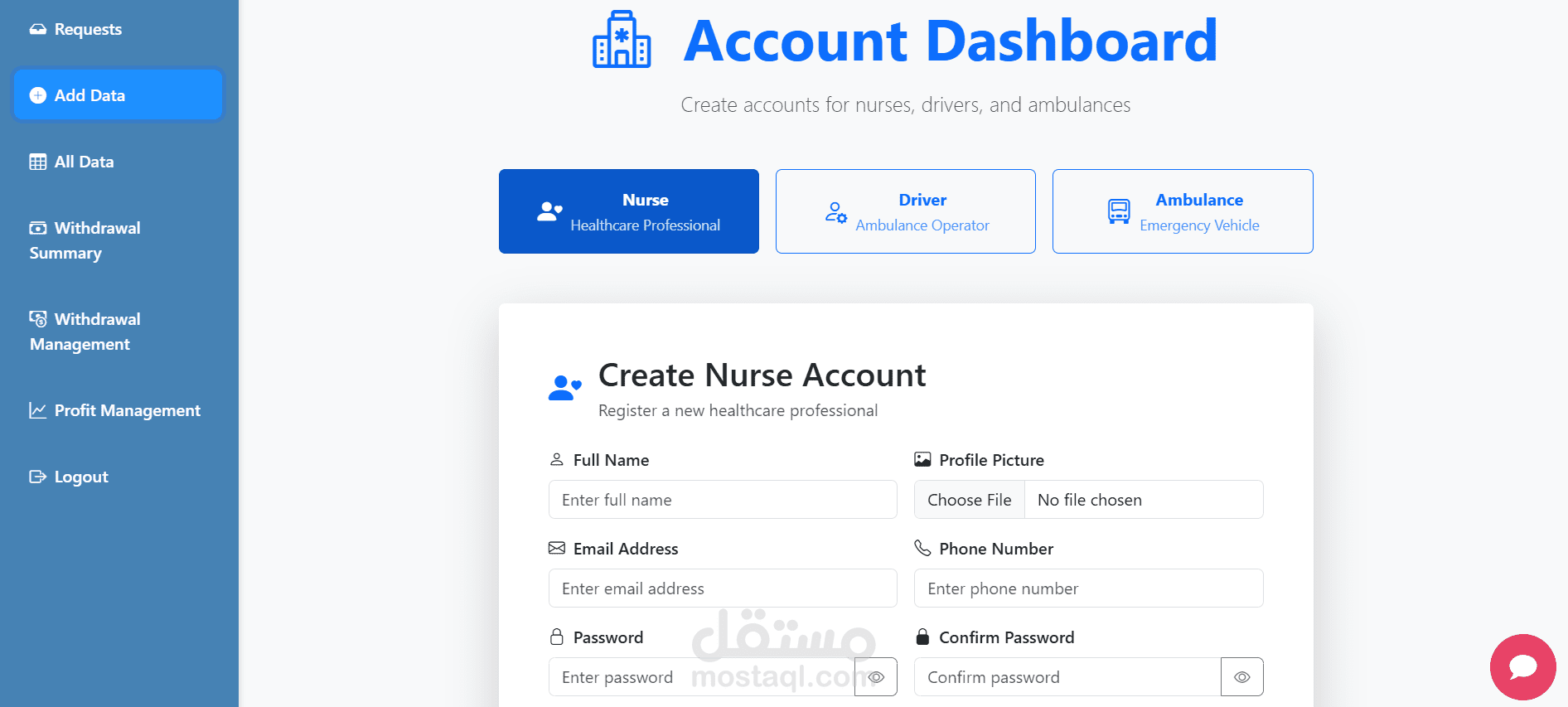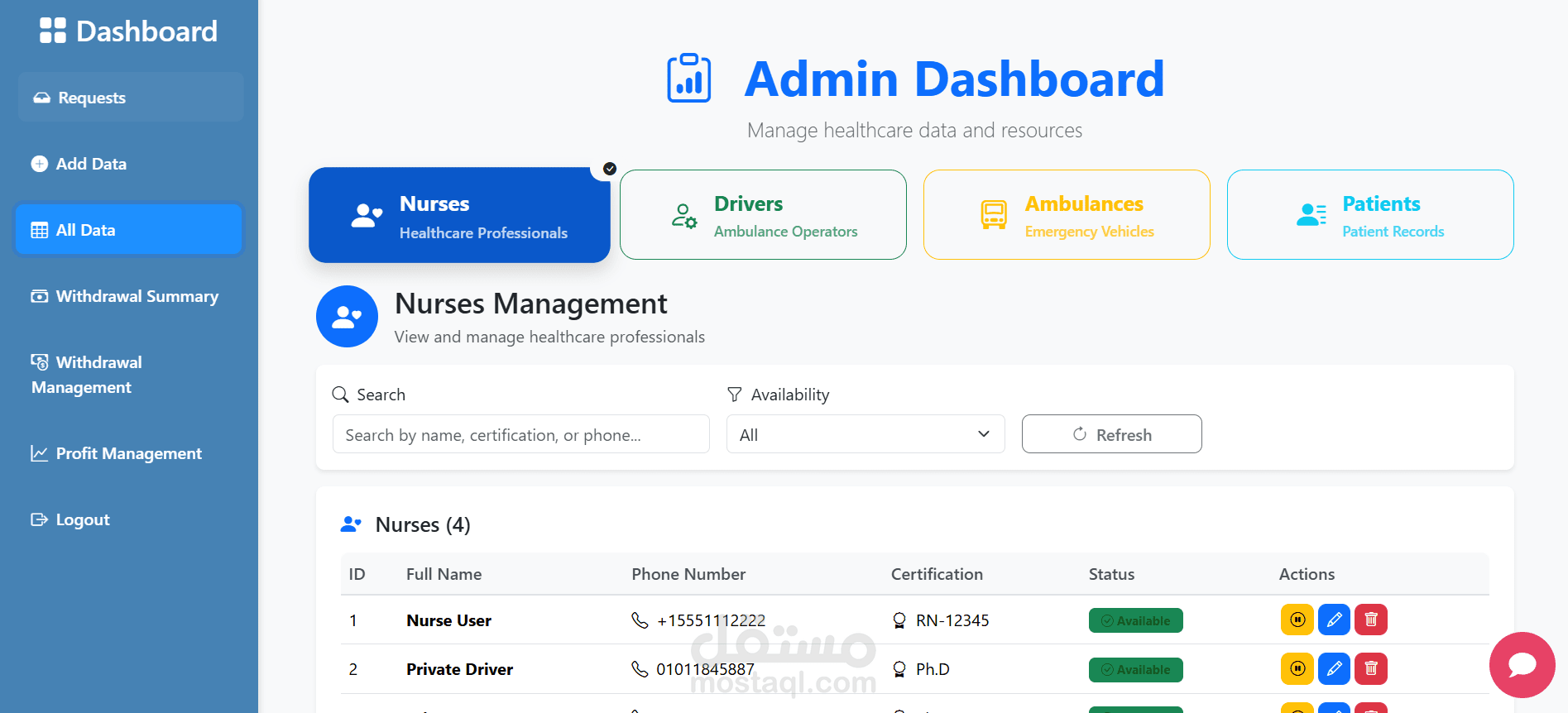 الادمن : ليتابع الموقع بشكل كامل والمسؤول عن اضافة ممرضة او سائق وايضا متابعة الرحلات وتوزيع الارباح علي المستخدمين