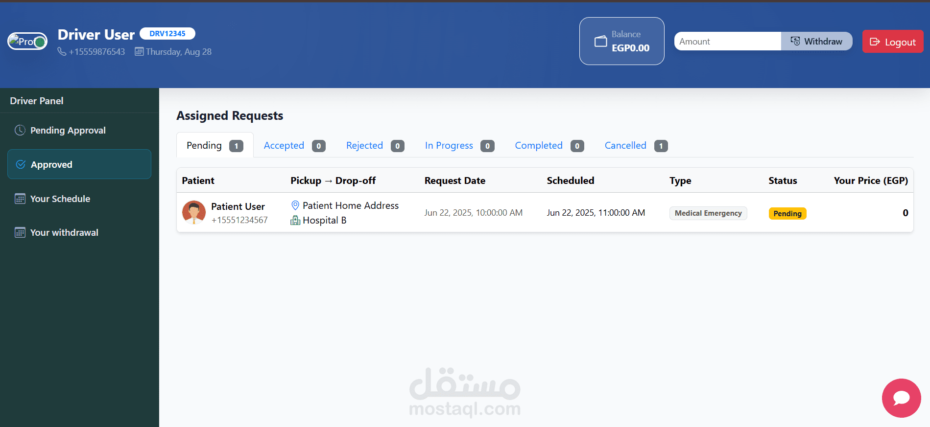 المريض: تقديم طلب رحلة والموافقة عليها بعد اختيار الممرضة والسائق