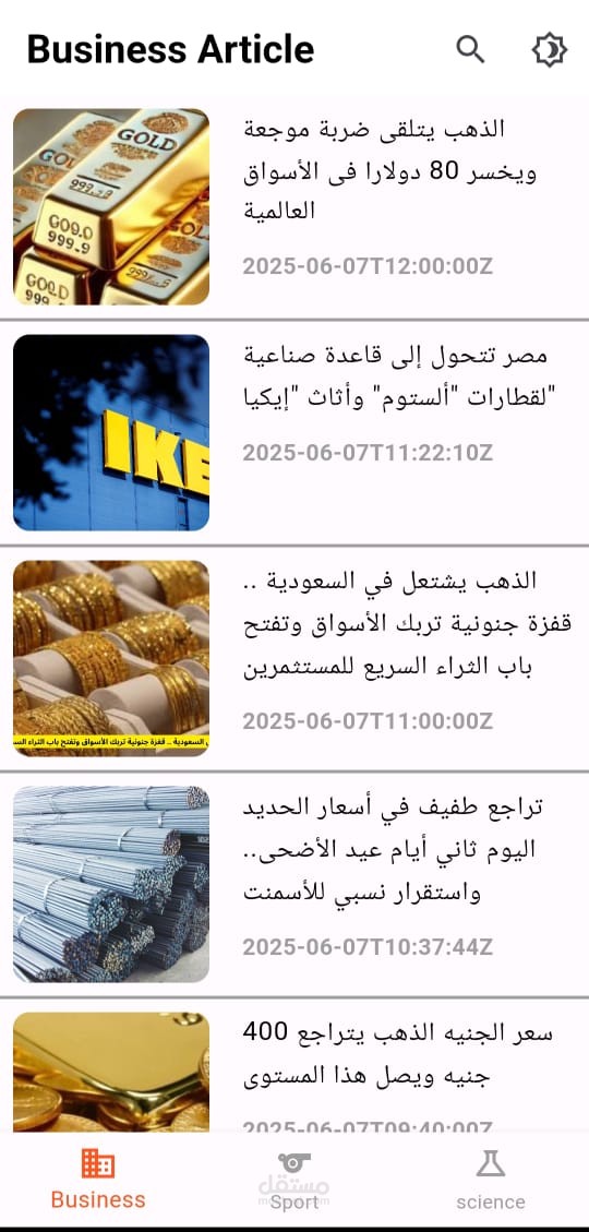 تطبيق موبايل بسيط لعرض الأخبار في أقسام مختلفة مثل الأعمال، الرياضة، والعلوم.