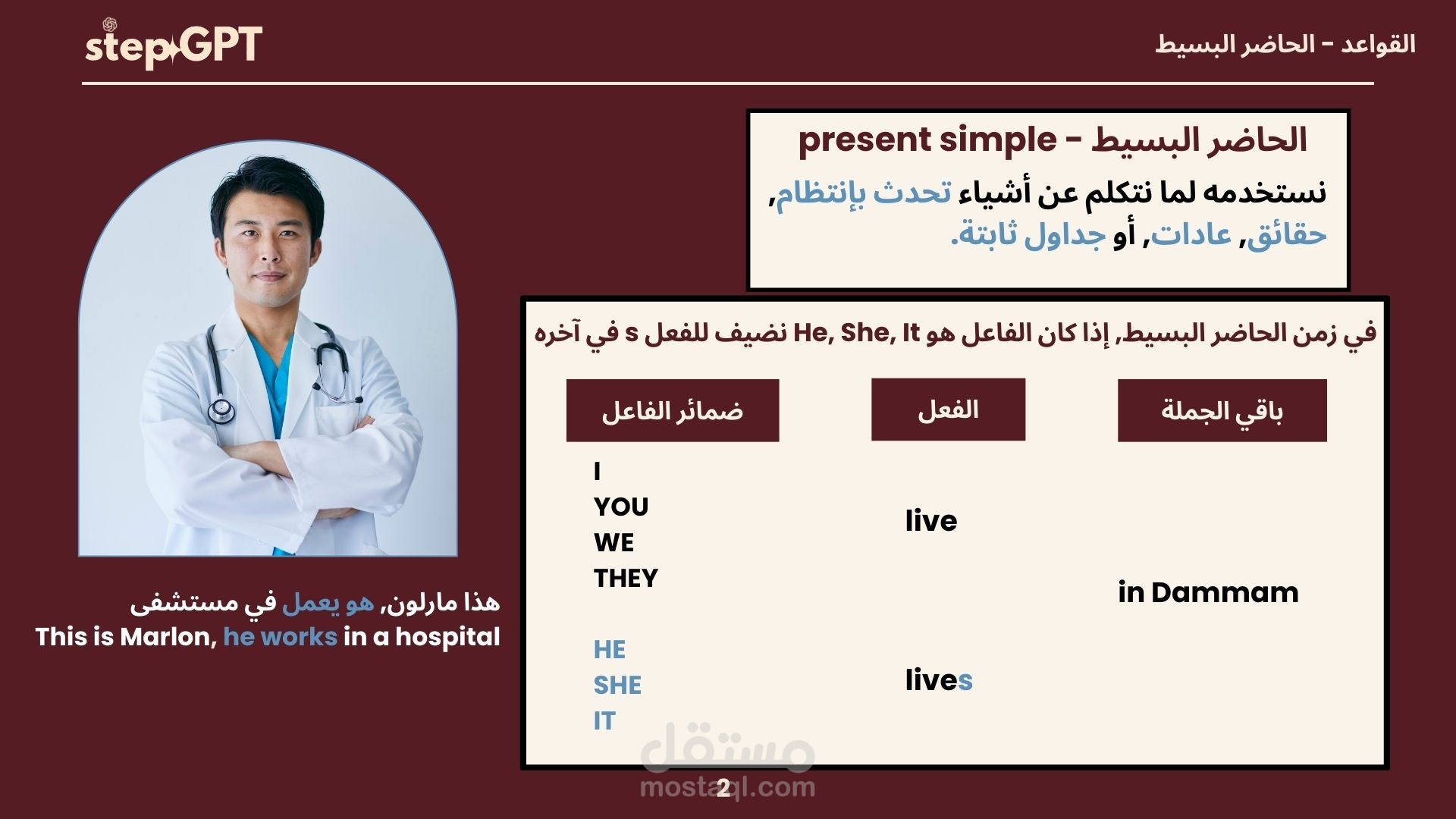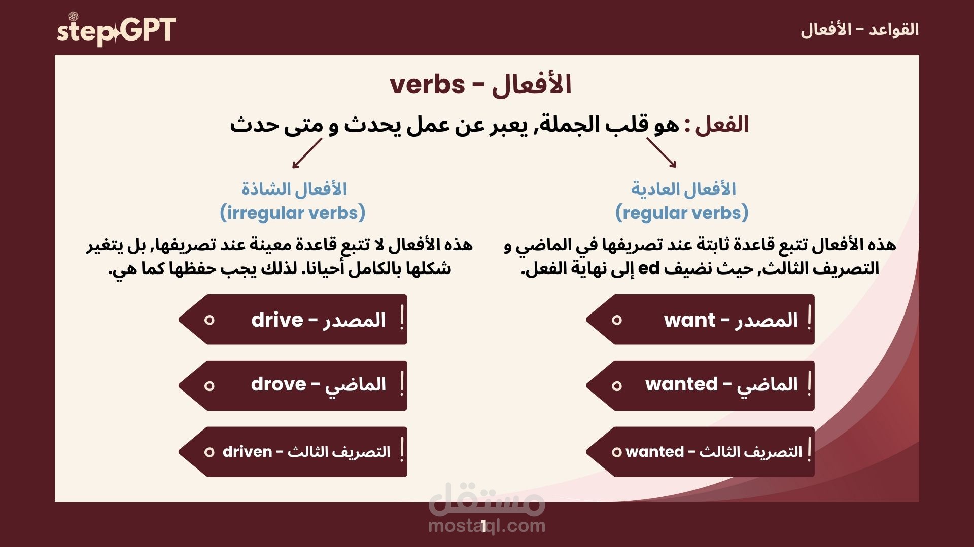 العمل عبارة عن slide لبرنامج PowerPoint لدرس إنجليزي مصممة ببرنامج كانفا، تم استعمال ألوان جذابة و متناسقة تعبر عن قيمة العمل