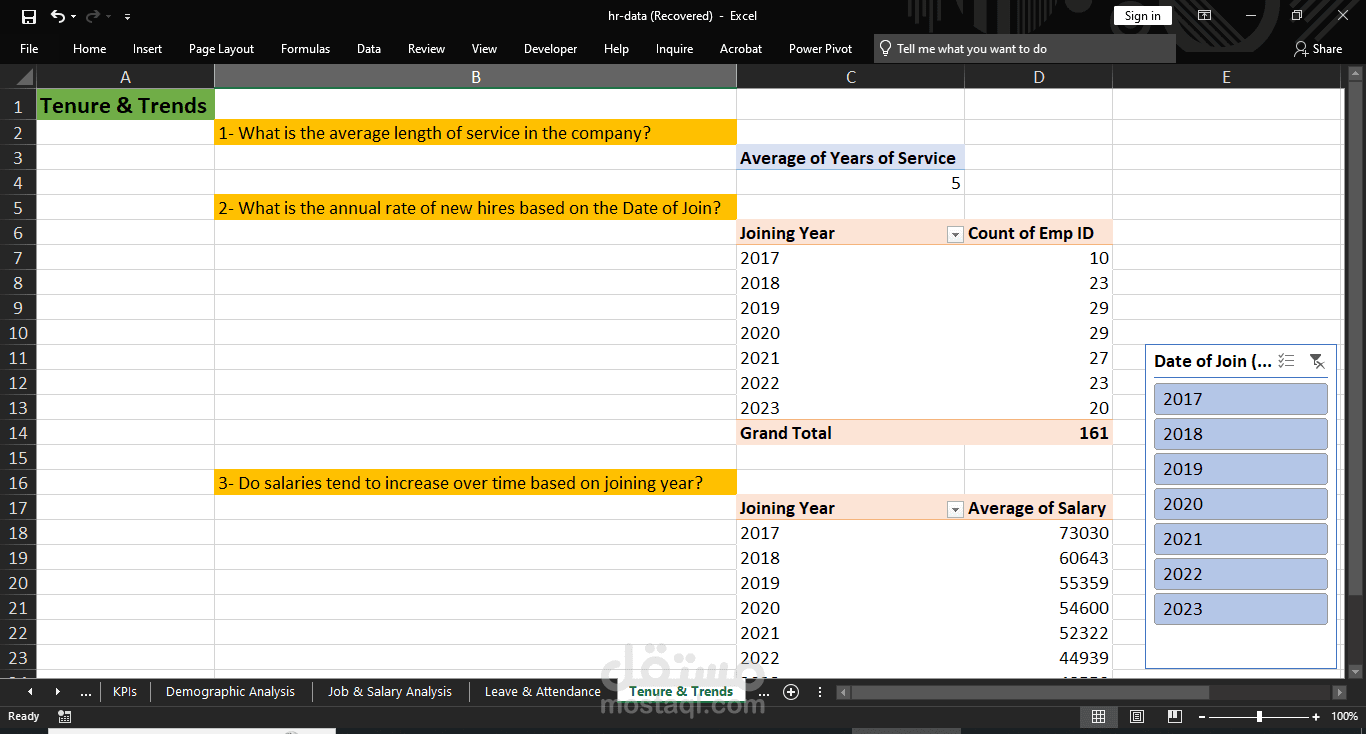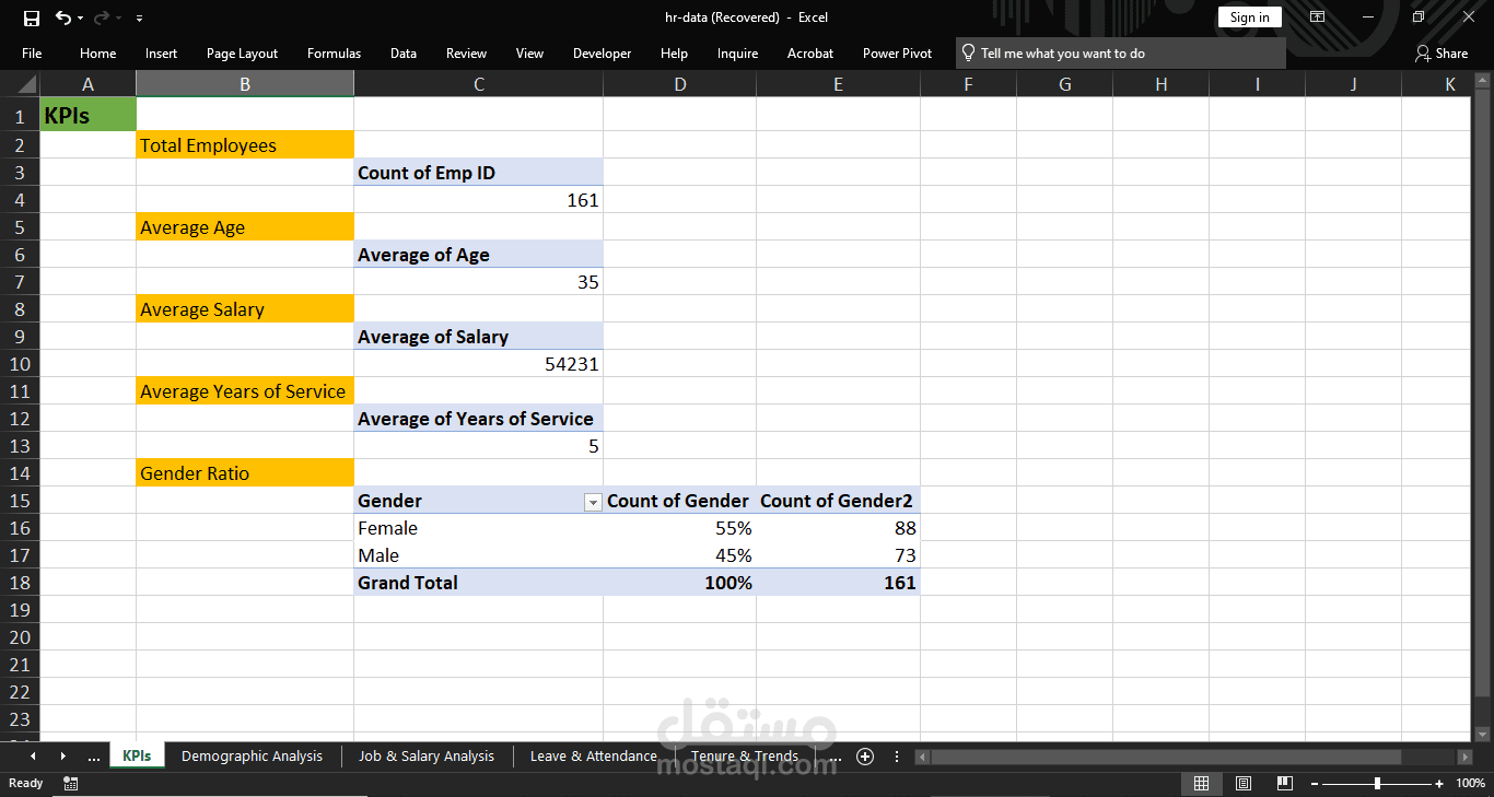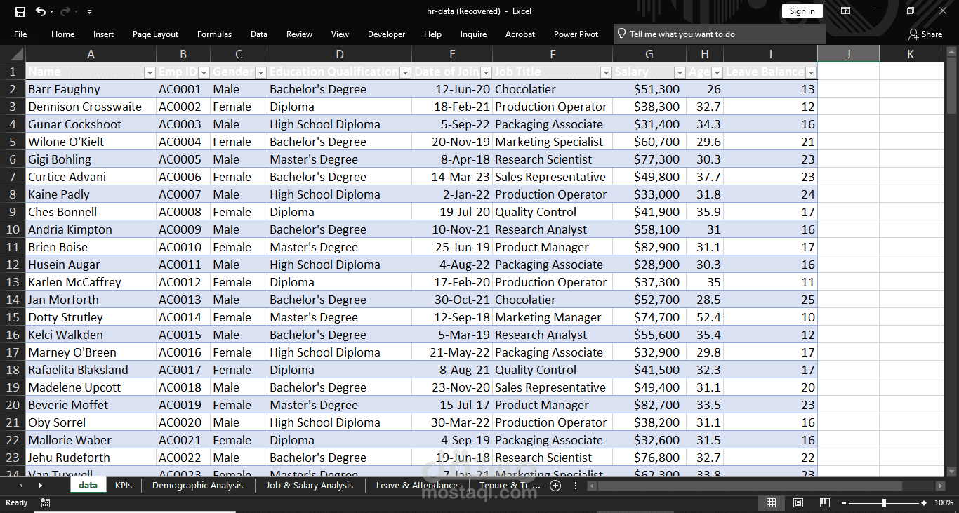 في هذا المشروع تم تحليل بيانات الموارد البشرية باستخدام Excel بشكل كامل، من تنظيف وتجهيز البيانات إلى إنشاء Pivot Tables وMeasures دقيقة. تم تصميم داشبورد تفاعلية تعرض رؤى مفصلة حول الموظفين، بما في ذلك عدد الموظفين، متوسط الراتب، متوسط سنوات الخدمة، توزيع الجنس، المؤهلات التعليمية، الرواتب حسب المسمى الوظيفي، أرصدة الأجازات لكل مسمى وظيفي، ومتوسط الرواتب عبر سنوات الانضمام. تساعد الداشبورد على فهم الهيكل التنظيمي والرواتب والأجازات بسهولة، وتوفر معلومات دقيقة لدعم اتخاذ قرارات الموارد البشرية بشكل أفضل.