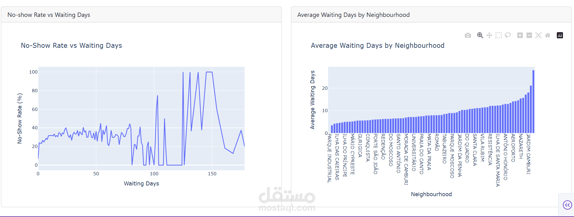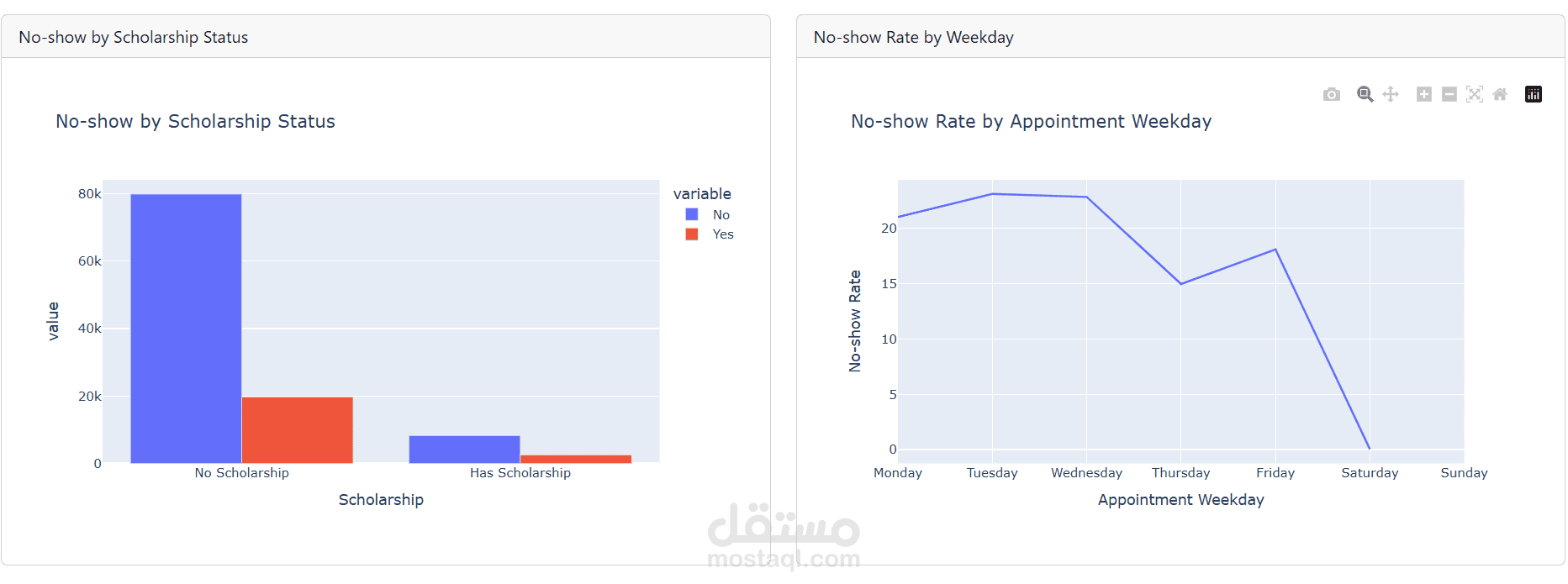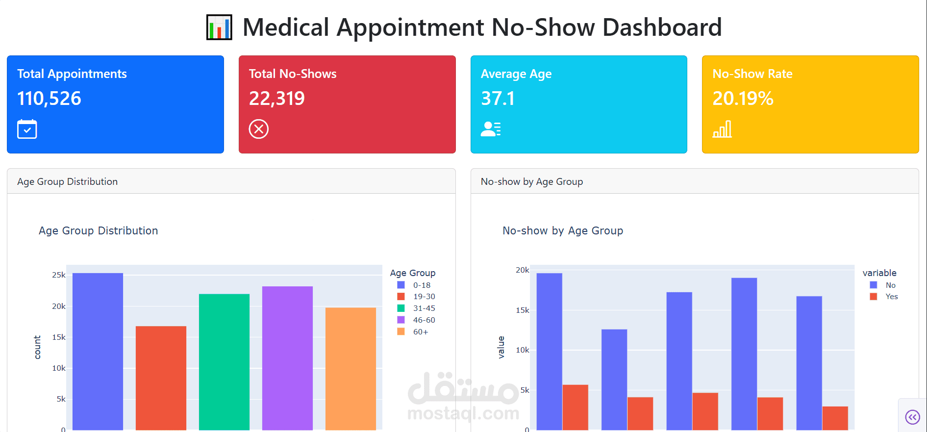 داش بورد تفاعلية لعرض وتحليل بيانات الغياب عن المواعيد الطبية باستخدام مجموعة بيانات Kaggle الخاصة بالمواعيد الطبية.
