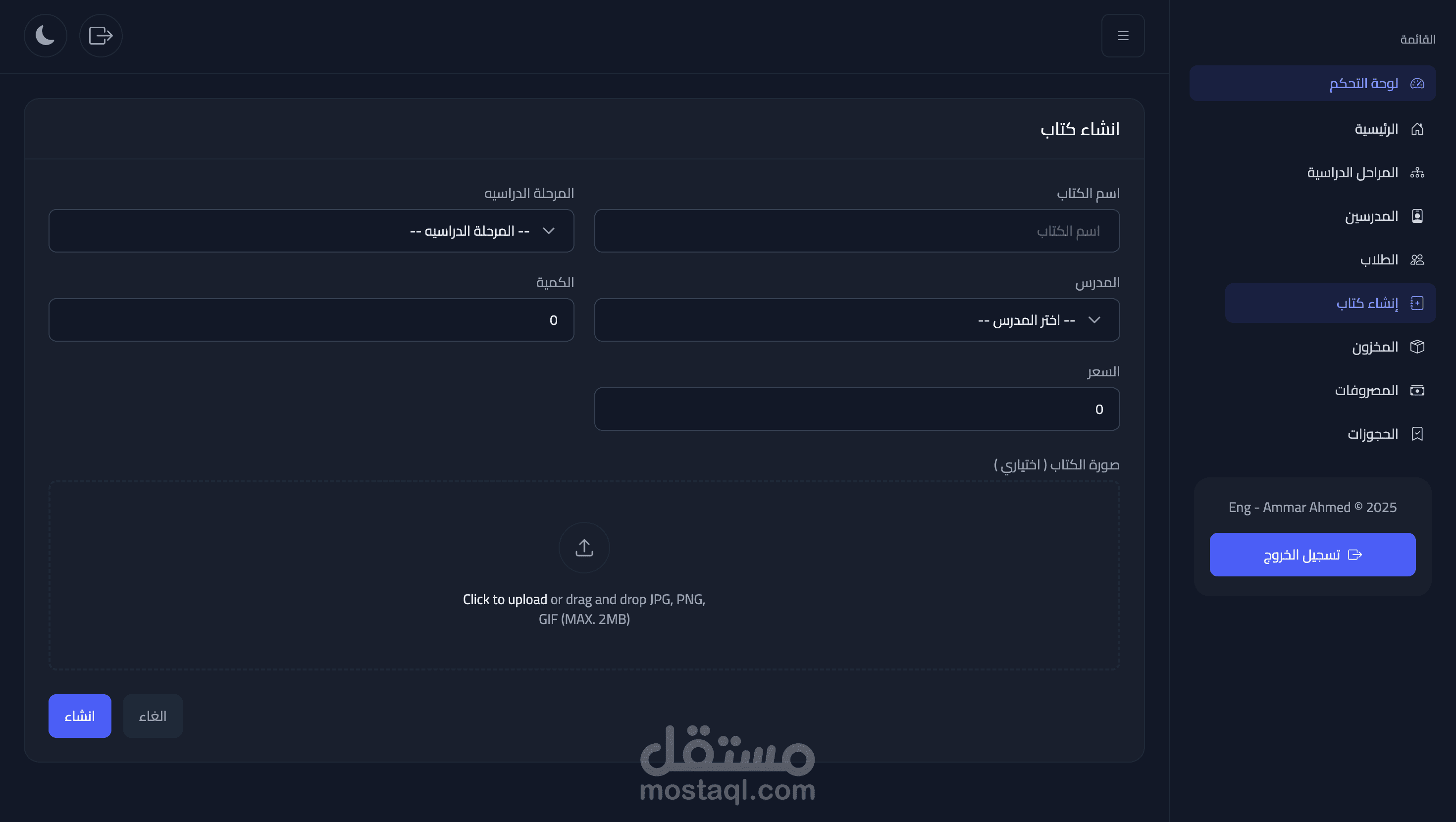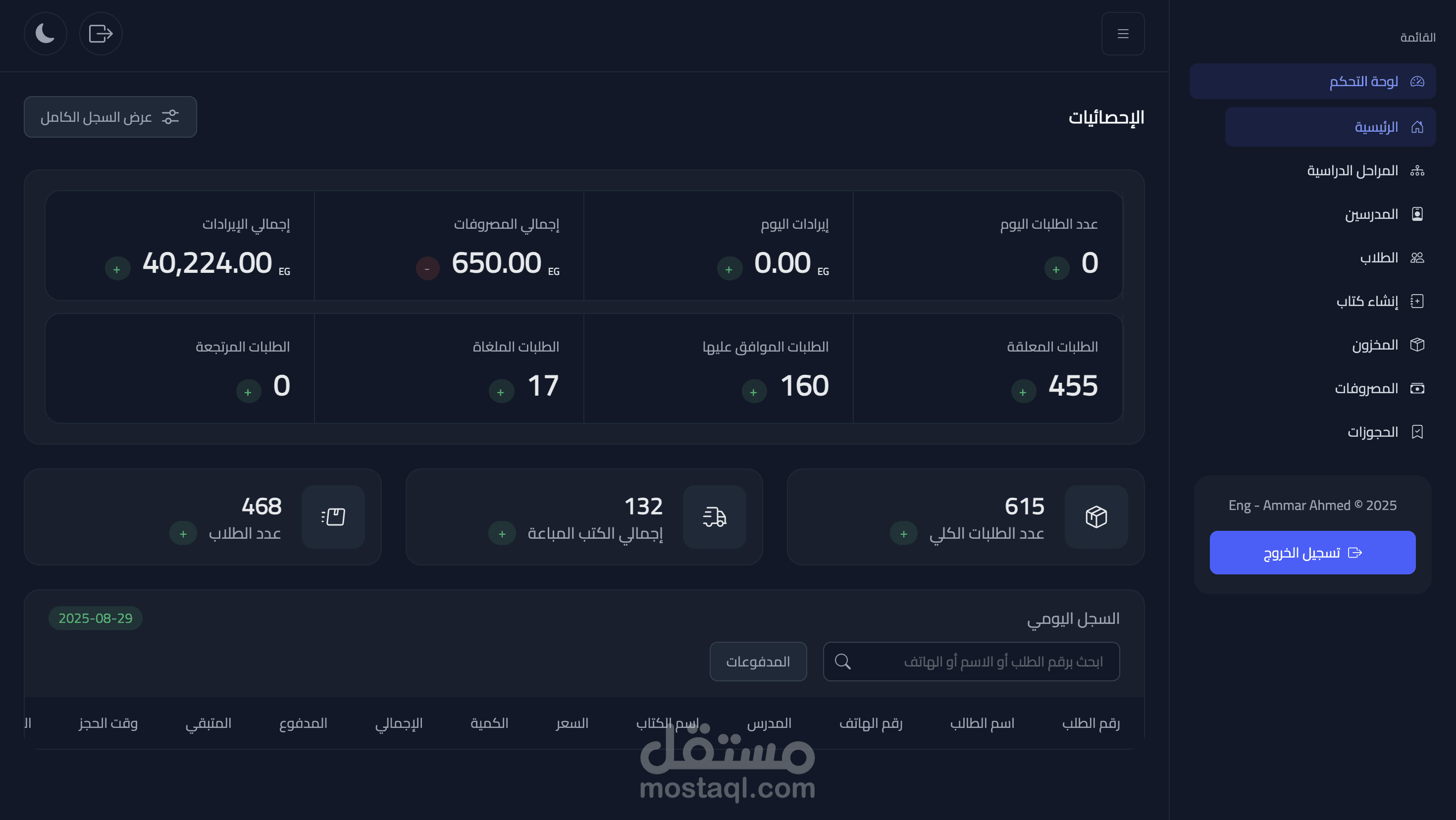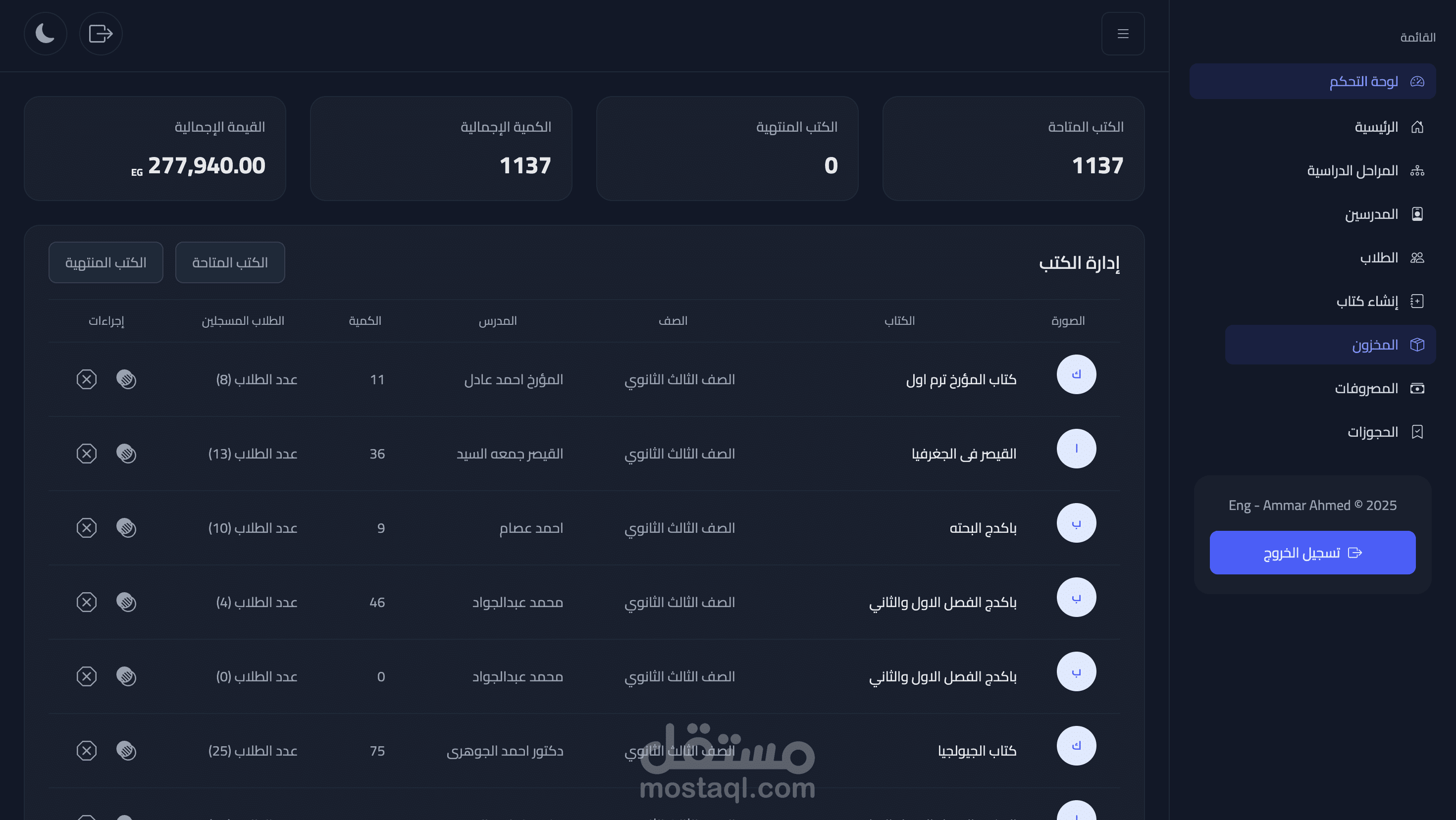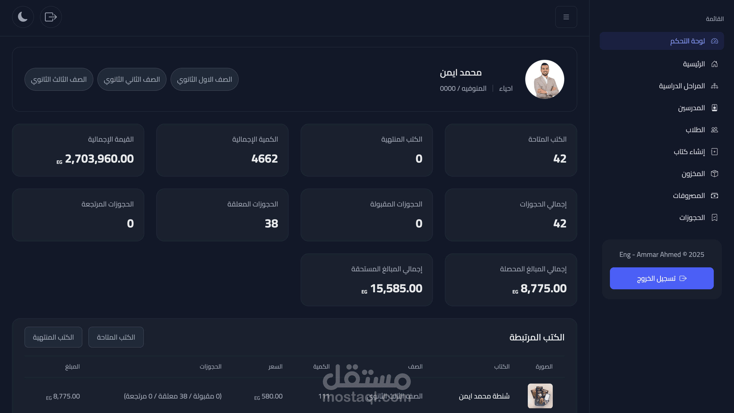منصة متكاملة لإدارة المراحل الدراسية والأقسام، المعلمين والطلاب، والكتب ومبيعاتها — مع لوحات تحكم تفصيلية وأمان عالي.