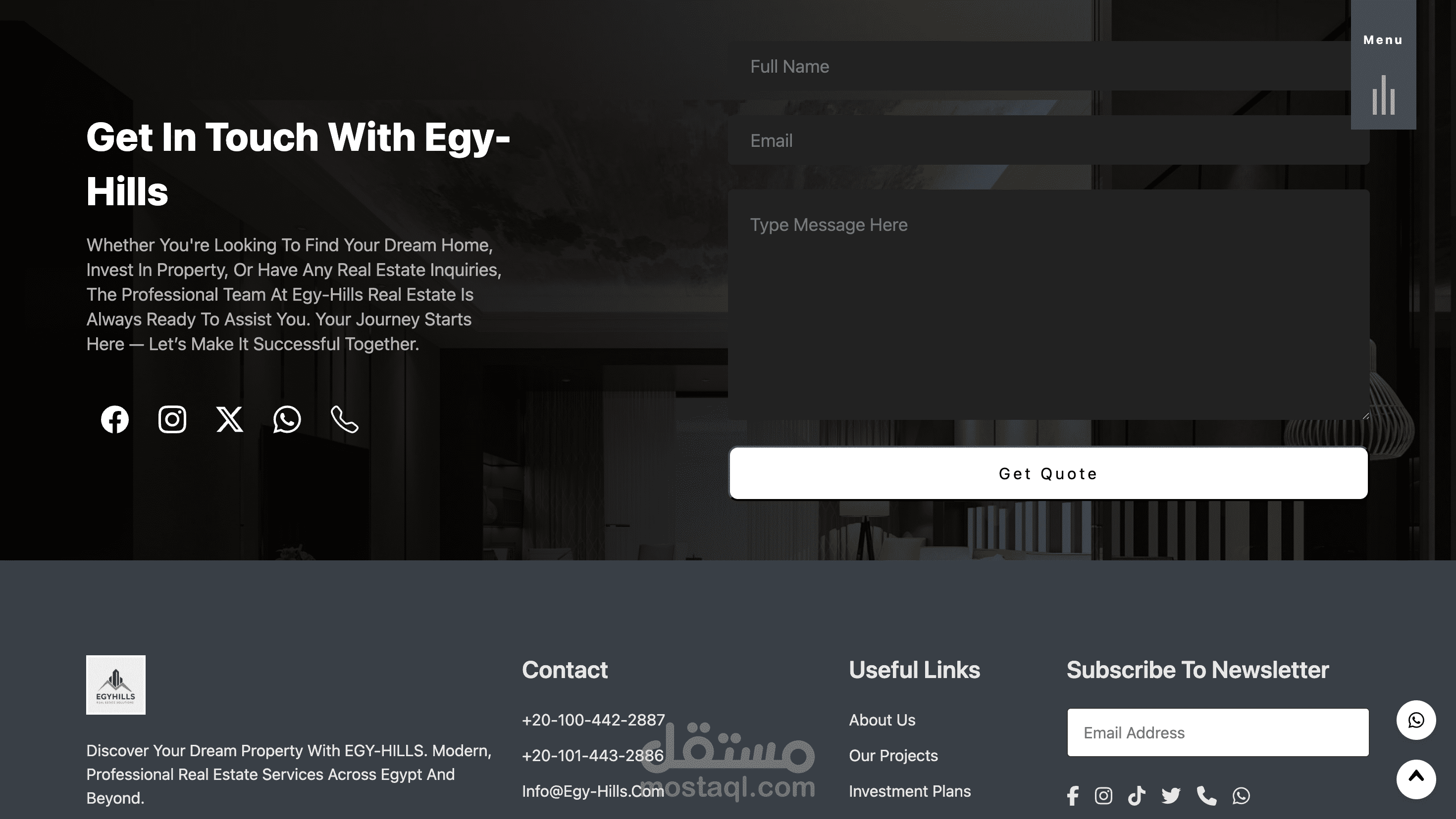 Egy-Hills هو مشروع متخصص في مجال العقارات داخل مصر، يقدم حلول متكاملة لبيع وتأجير الوحدات السكنية والتجارية، ويتميز بخبرة تتجاوز 15 عامًا في السوق العقاري مع تحديث يومي للعروض وتنوع كبير يبدأ من الوحدات الاقتصادية وحتى العقارات الفاخرة، مع توفير خدمة احترافية وسريعة تهدف دائمًا إلى رضا العملاء. يحتوي المشروع على عدة صفحات أساسية: الصفحة الرئيسية التي تعرض بانر رئيسي لأحدث المشاريع والعقارات مع نبذة سريعة عن الشركة وروابط للأقسام المهمة وقسم للعروض المميزة ووسائل التواصل. صفحة العقارات تعرض قائمة شاملة بالعقارات مع إمكانية البحث والفلترة حسب الموقع والنوع والسعر والمساحة مع صفحة تفاصيل لكل عقار تحتوي على الصور والسعر والمواصفات وخطط الدفع. صفحة من نحن تعرض تاريخ الشركة وخبرتها الطويلة ورسالتها ورؤيتها بالإضافة إلى مميزاتها مثل التحديث اليومي وتنوع العقارات وسرعة الخدمة واحترافية الوكلاء مع التعريف بالفريق. صفحة تواصل معنا توفر نموذجًا لإدخال البيانات مثل الاسم والهاتف والرسالة بالإضافة إلى أرقام الهواتف والبريد الإلكتروني وخريطة لموقع الشركة في القاهرة الجديدة. هناك أيضًا صفحة المدونة أو الأخبار التي تتناول مقالات عن السوق العقاري المصري ونصائح للمشترين والمستثمرين وتحديثات المشاريع الجديدة، وصفحة الخدمات التي تعرض ما تقدمه الشركة من بيع وشراء وتأجير واستشارات عقارية وإدارة للمشاريع والعقارات. يتميز المشروع بمجموعة من المزايا الواضحة وهي الخبرة الواسعة في السوق المصري، التنوع الكبير في الوحدات، التحديث اليومي للعروض، الخدمة السريعة والاحترافية، التصميم العصري والواجهة السهلة، والتواصل المباشر مع العملاء عبر الهاتف أو البريد الإلكتروني.