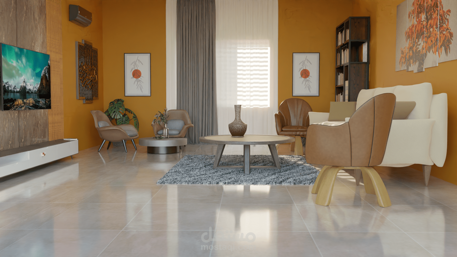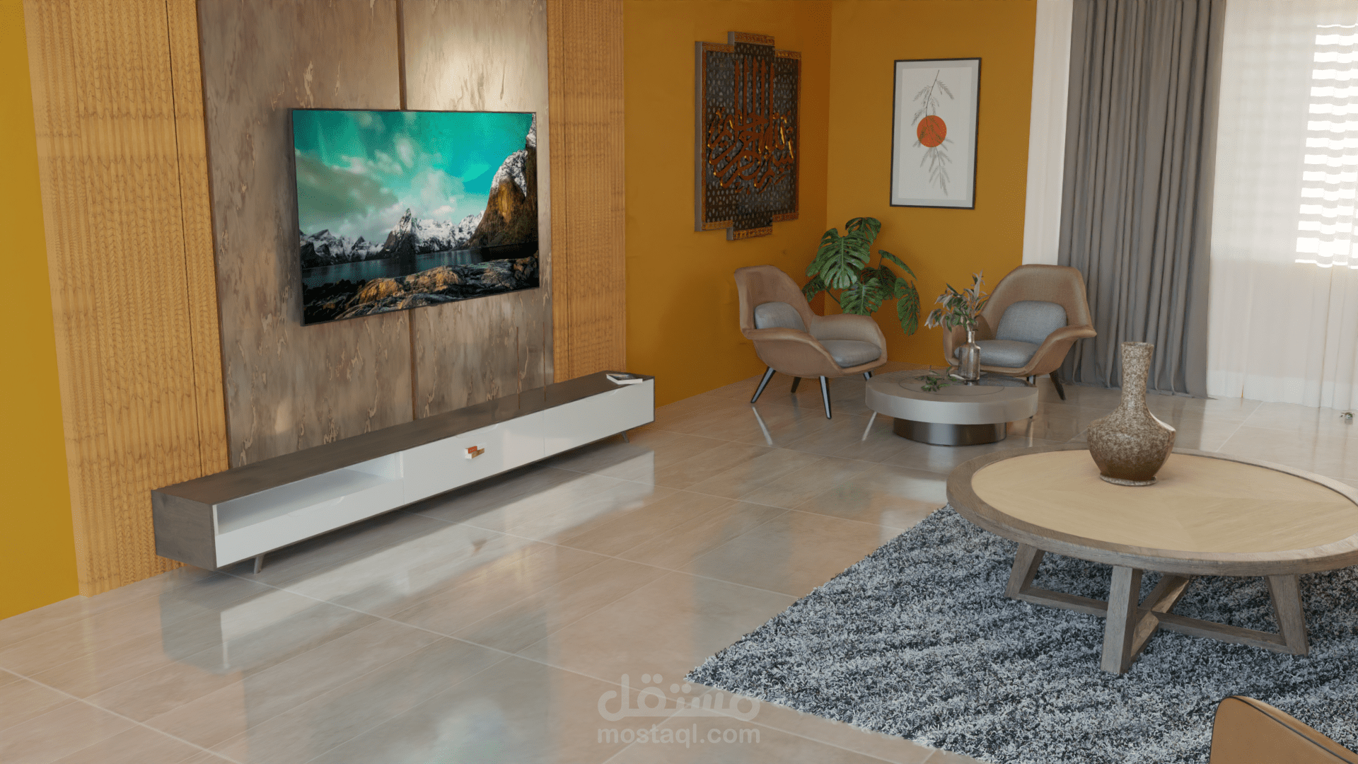 living room showing mix of day light and interior light ( i totally modeled the sofa and the window and the rest of models from blender kit)