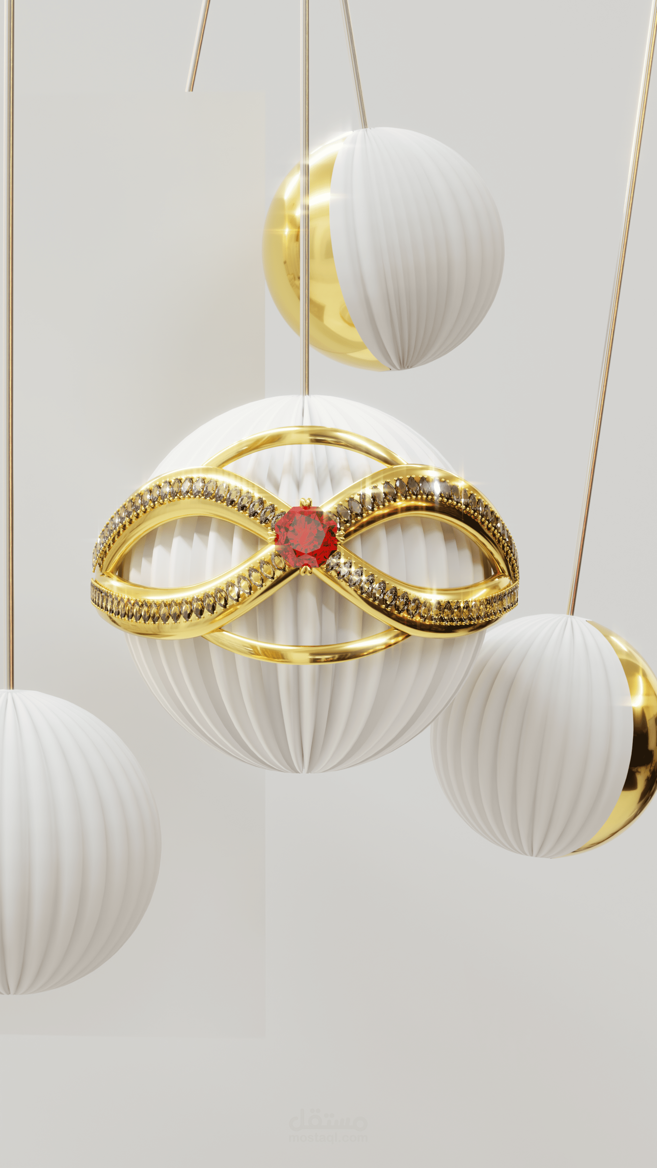 تصميم ثلاثي الأبعاد لخاتم أنيق مصنوع من المجوهرات الفاخرة، تم تصميمه باستخدام برنامج Blender مع مراعاة أدق التفاصيل في الشكل والملمس ليبدو واقعيًا قدر الإمكان.