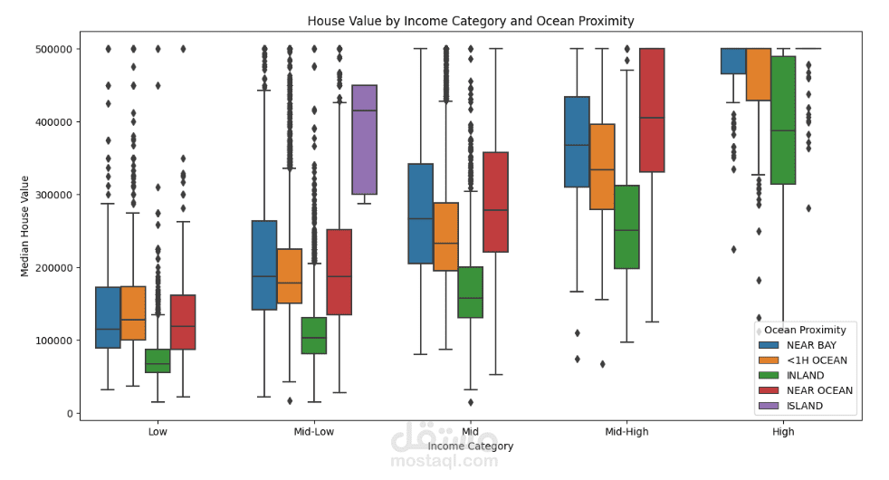 أظهرت النتائج أن متوسط دخل الأسر (Median Income) هو العامل الأكثر تأثيرًا على الأسعار، يليه الموقع الجغرافي (Latitude & Longitude) و عدد الغرف المتوسط. كما أوضحت الرسوم البيانية أن المنازل الساحلية عادةً ما تكون أغلى من المنازل في المناطق الداخلية.