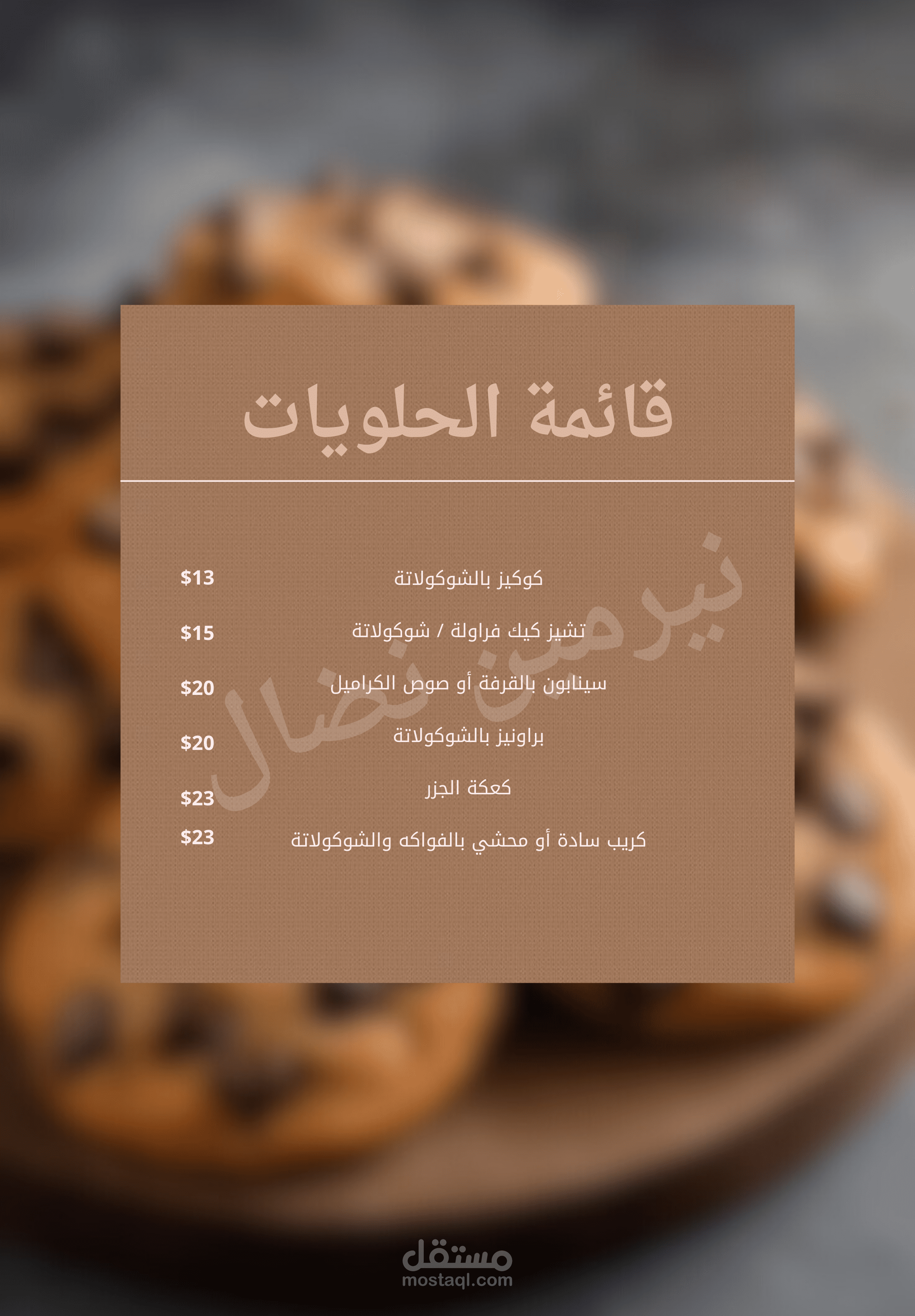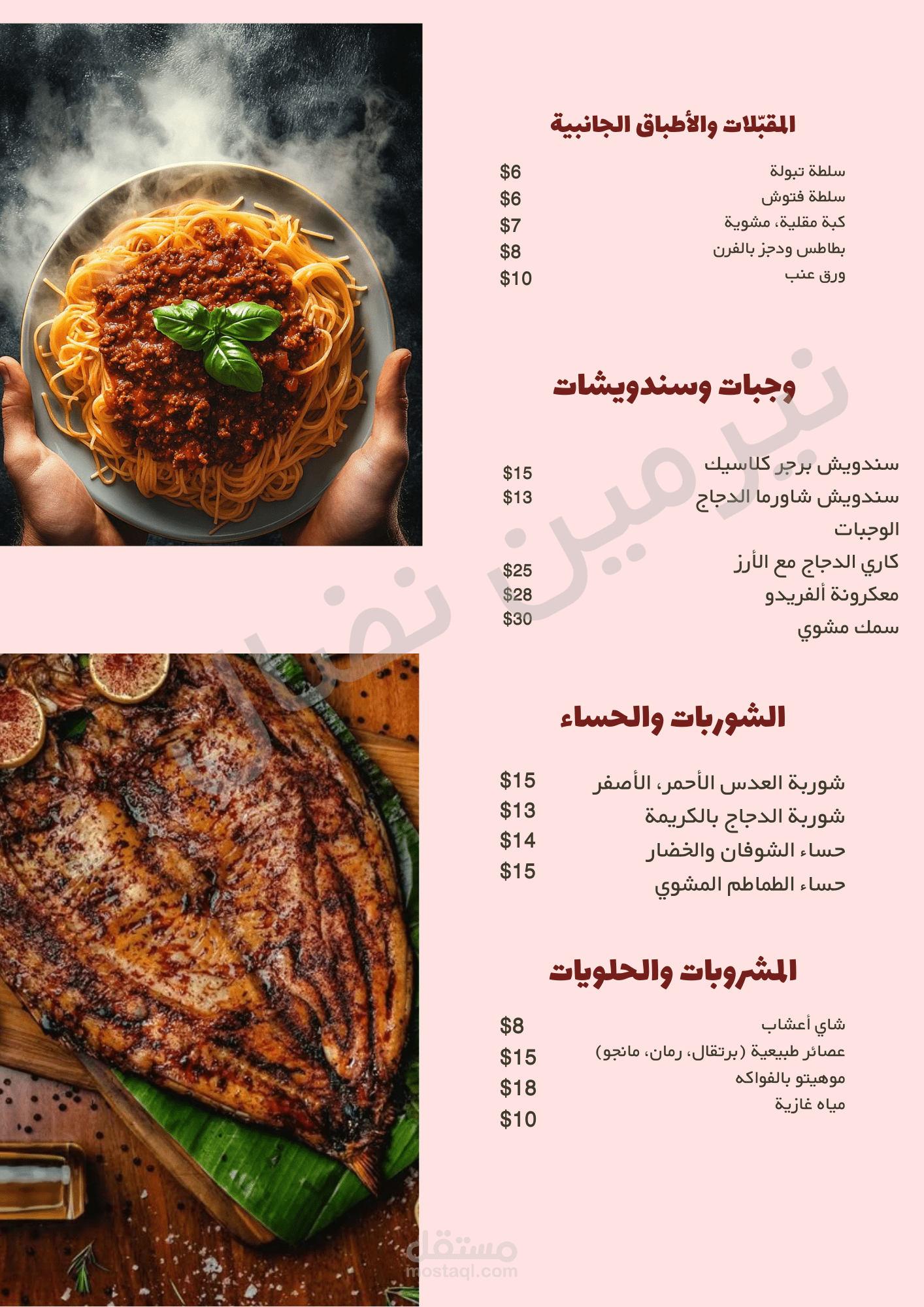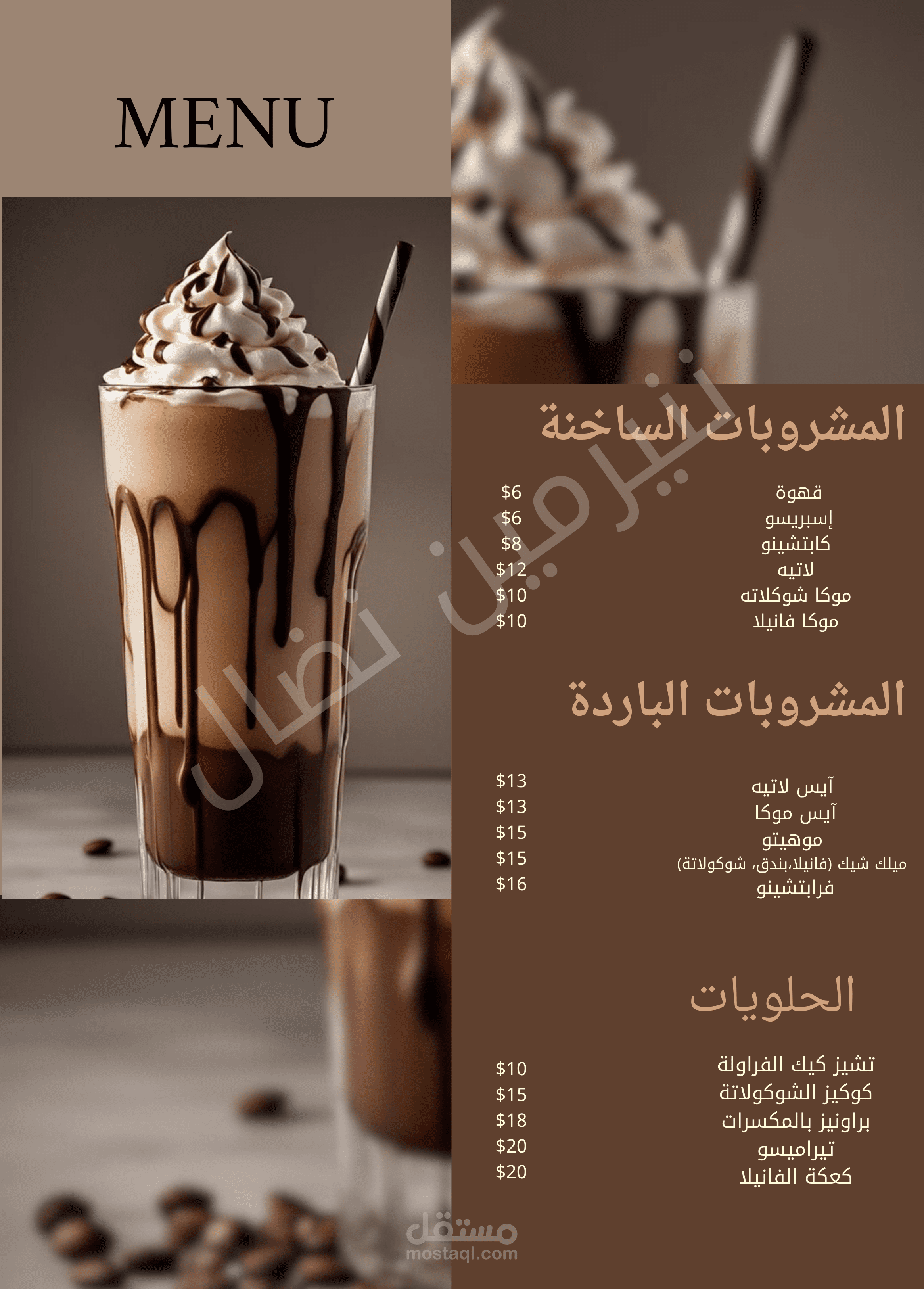 أنا أقدّم لك تصميم منيو عصري وأنيق باستخدام Canva بجودة عالية، مناسب للطباعة والنشر الرقمي، مع ترتيب احترافي للأقسام والأسعار والصور.