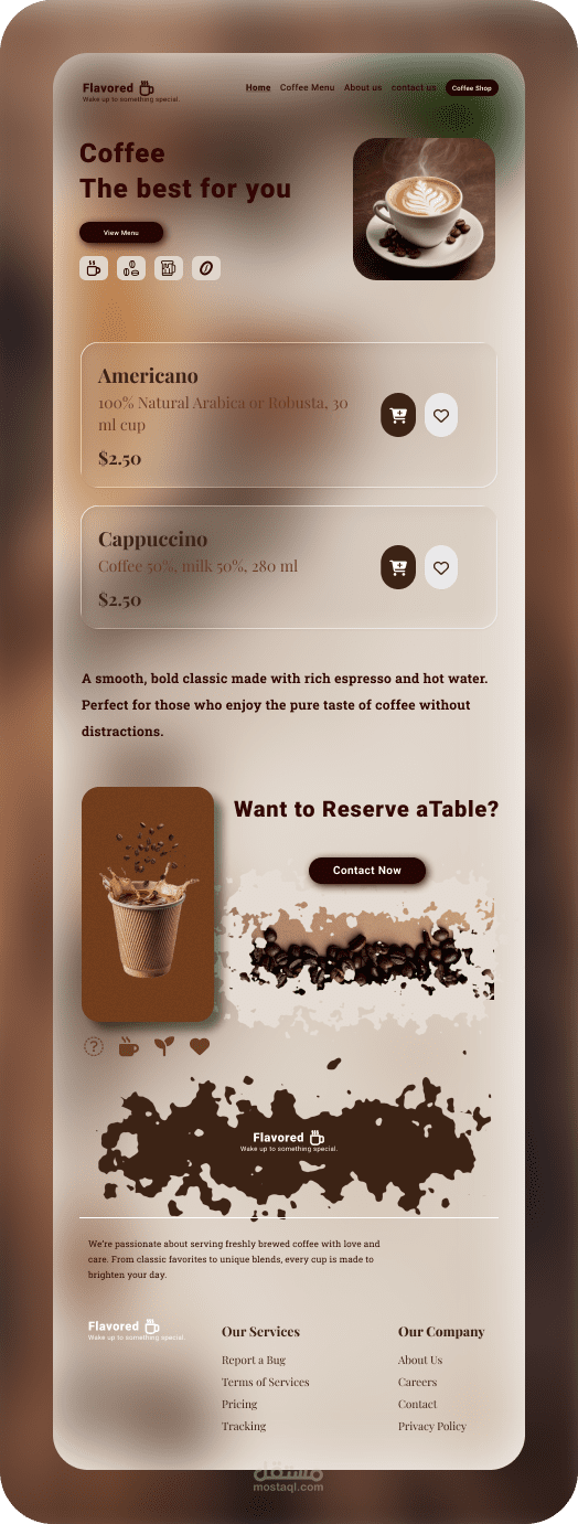 فليڤرد علامة تجارية حديثة تهتم بجودة القهوة ومذاقها وتجربة متكاملة لعملائنا. مهمتنا أن نجمع الناس حول فنجان قهوة طازج، سواء كنت في المنزل أو في العمل أو في مقهانا. استمتع بنكهات غنية، وخلاصات مُحضّرة بعناية، وأجواء دافئة تجعل كل رشفة لا تُنسى.