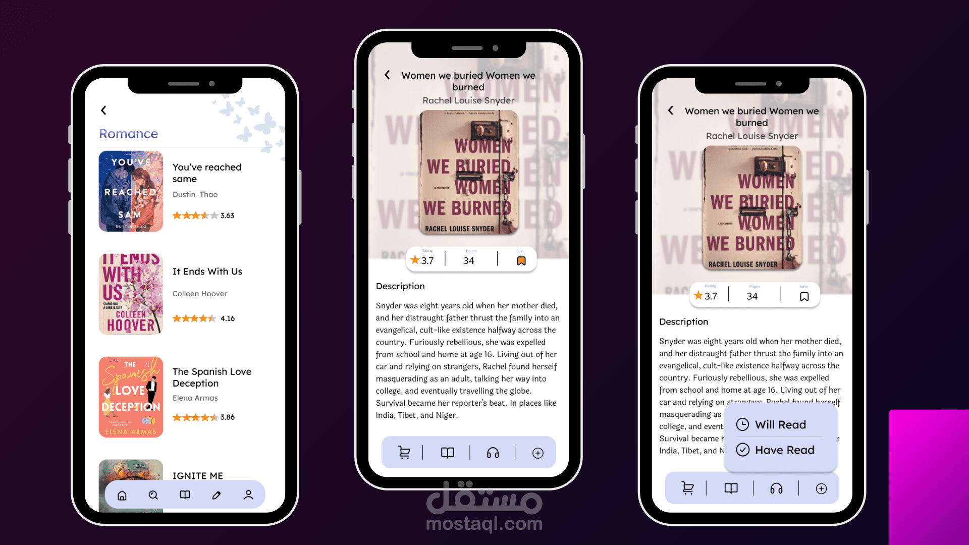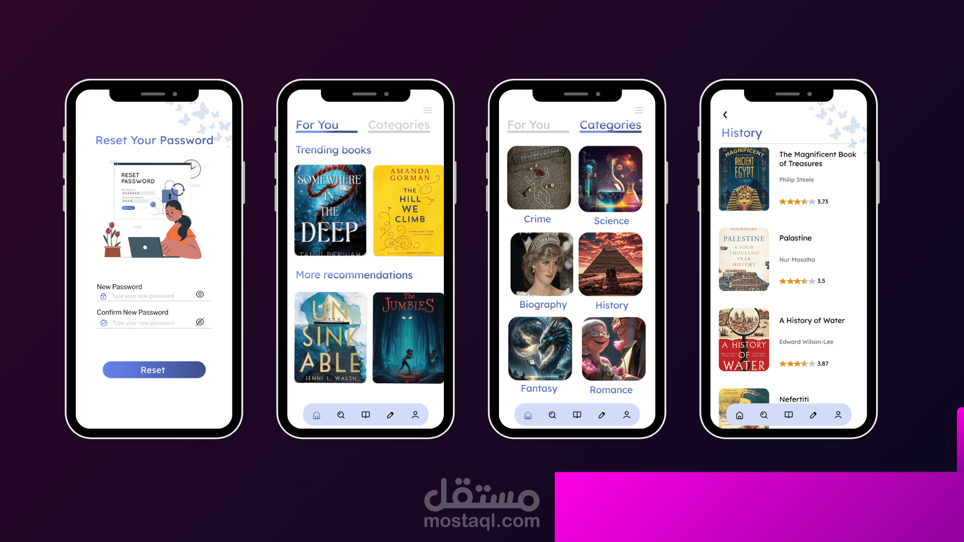 "Bookie" هو تطبيق شامل لعشاق القراءة والاستماع، بيجمع بين المكتبة الرقمية والكوميونتي التفاعلي للكتّاب. المستخدم يقدر يقرأ الكتب الإلكترونية، يستمع للكتب الصوتية، يشتري كتبه المفضلة، وكمان يتواصل مع الكتّاب الهواة والمحترفين اللي بينشروا قصصهم مباشرة على المنصة.