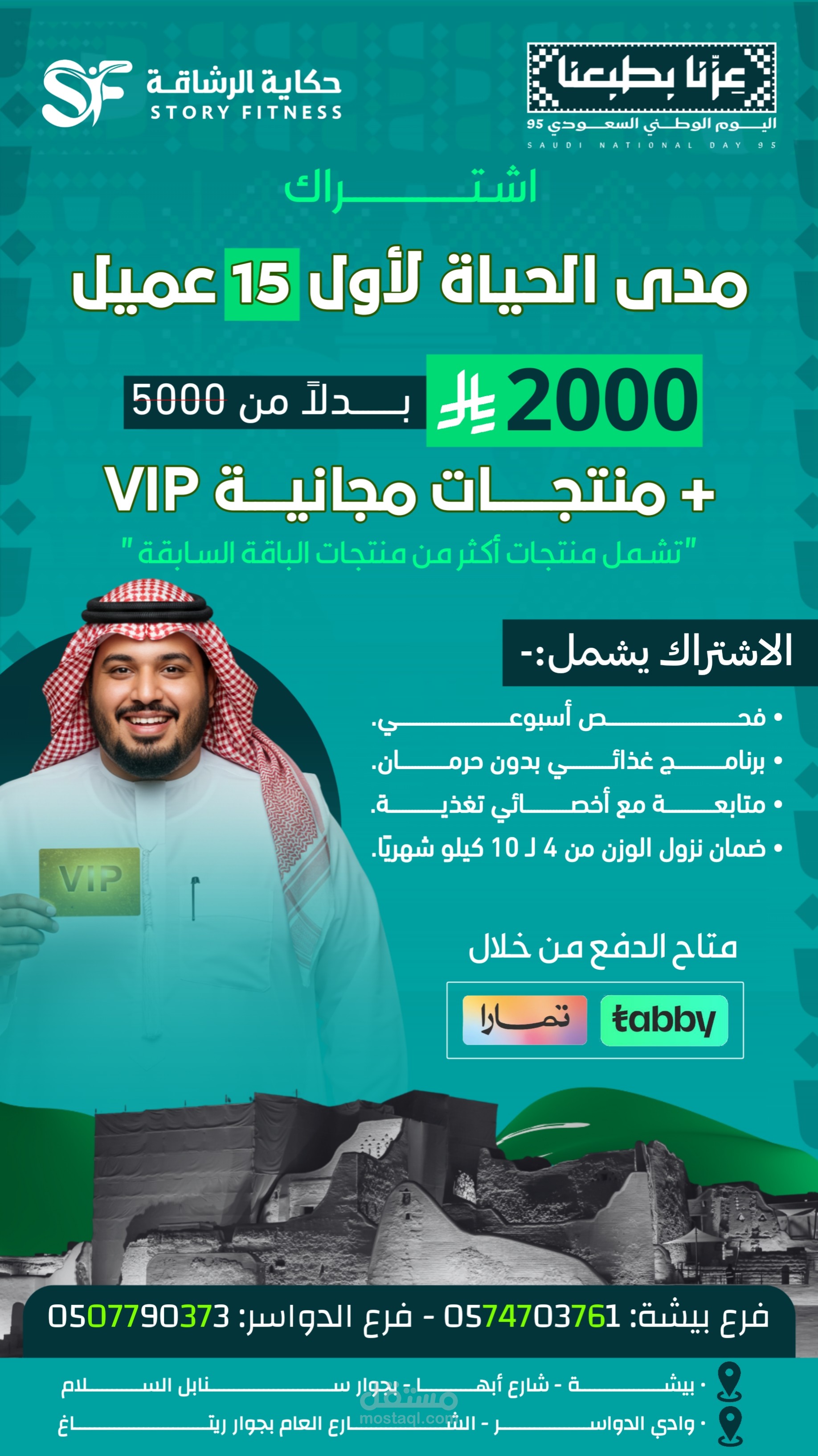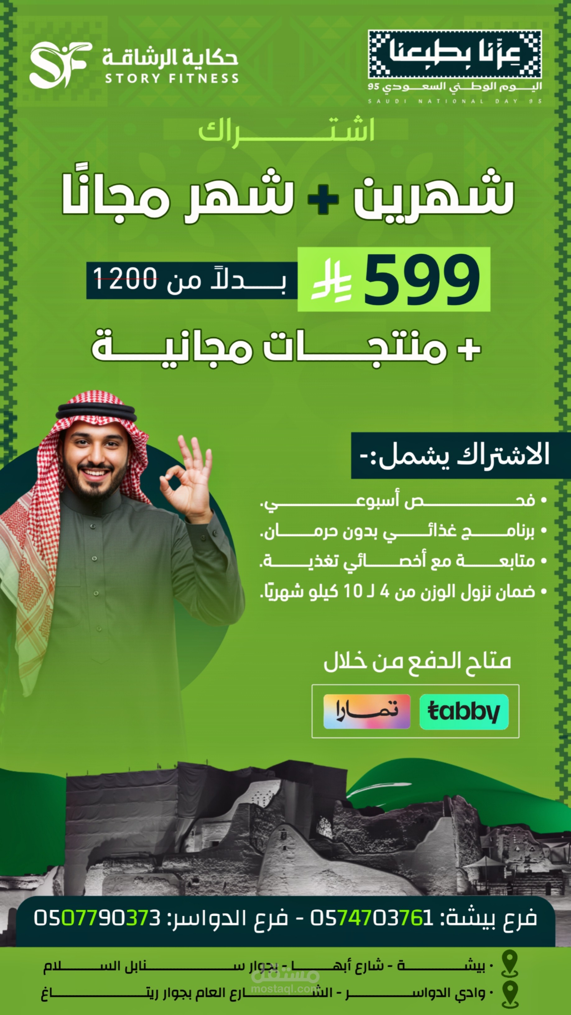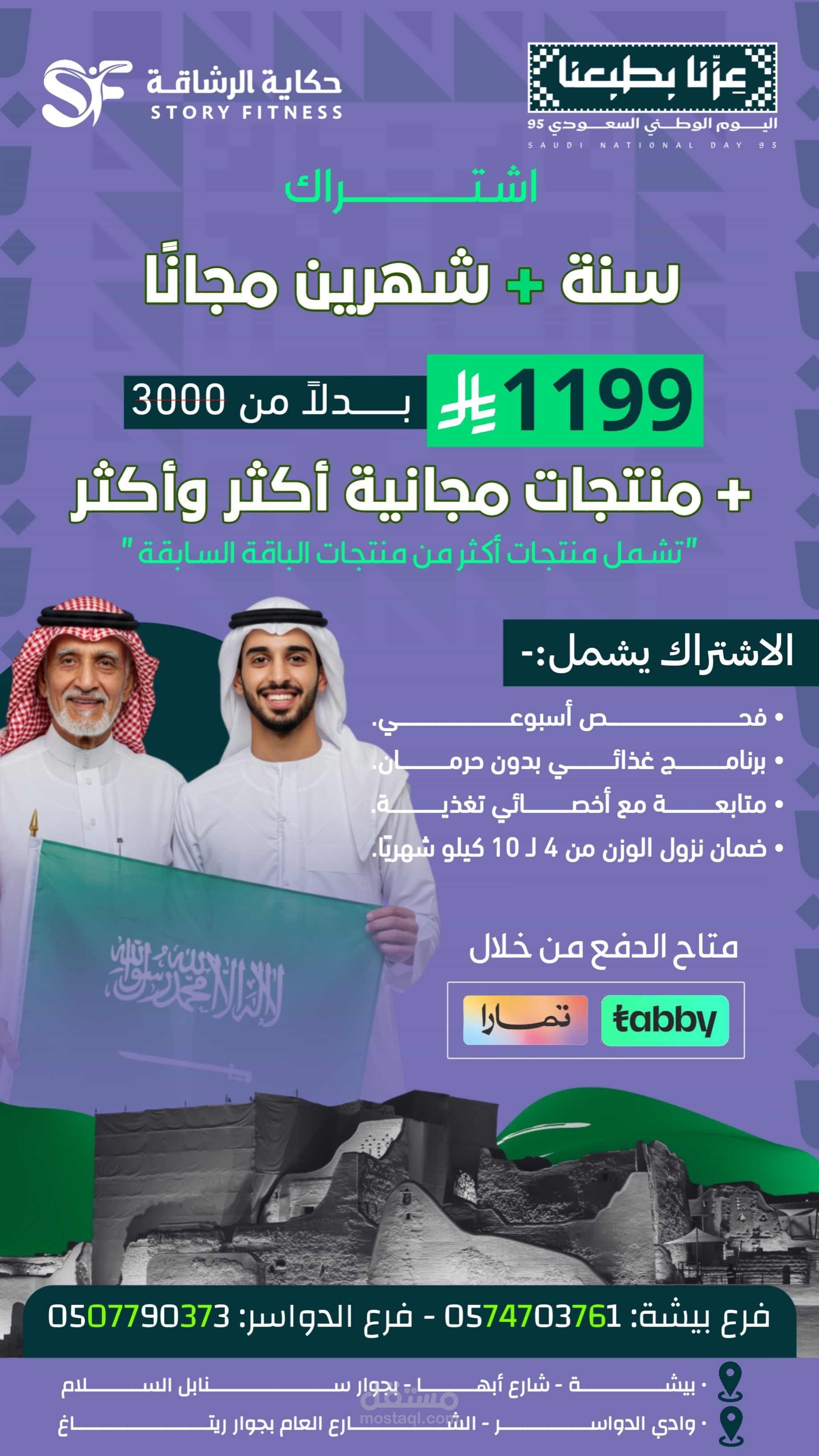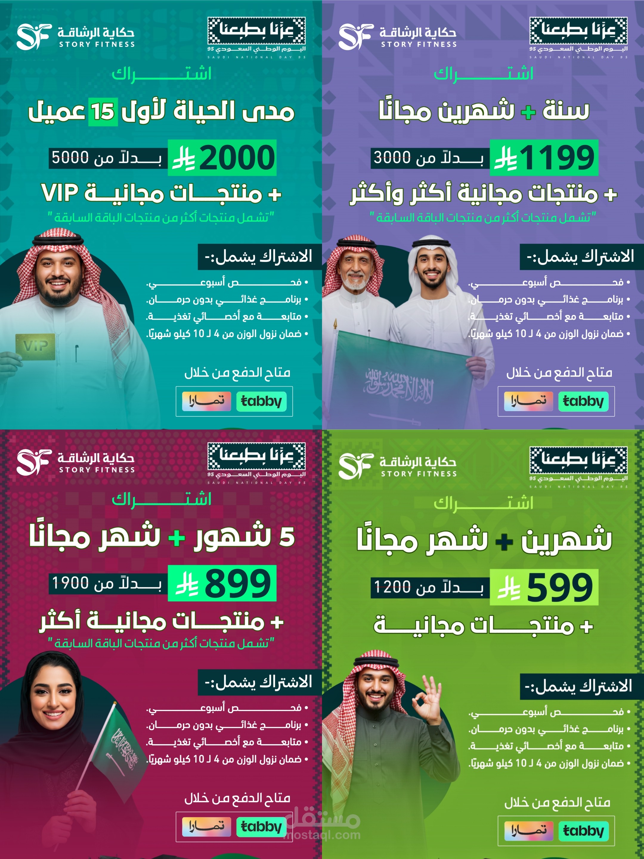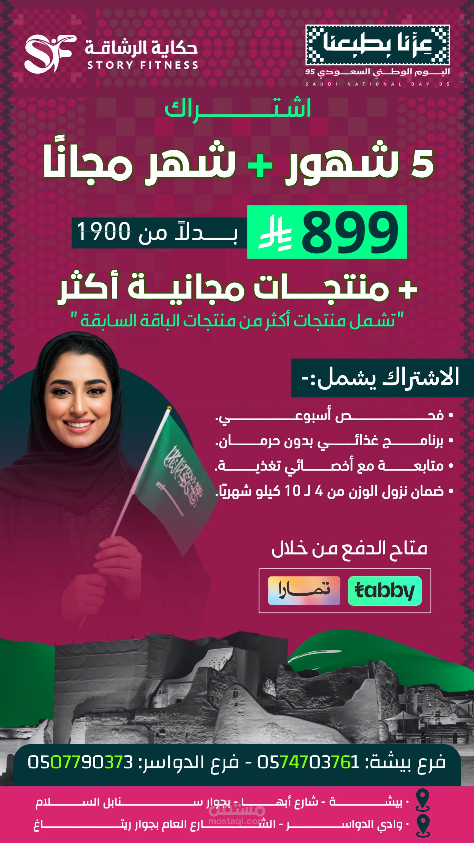 هذه التصاميم عبارة عن عروض ترويجية خاصة باليوم الوطني السعودي 95 لصالة Story Fitness – حكاية الرشاقة، تم تصميمها لتعكس أجواء الاحتفال باليوم الوطني بروح عصرية وجذابة.