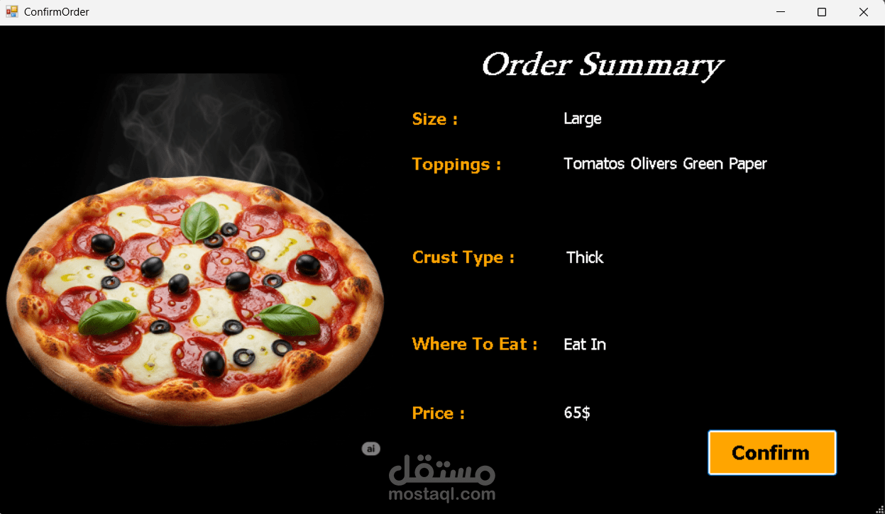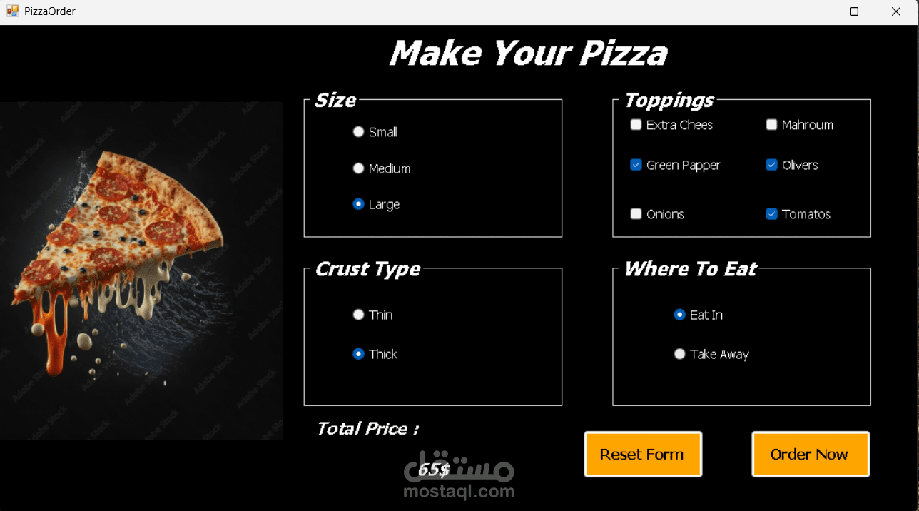 - تم بناء تطبيق متعدد الأشكال بلغة C# يحاكي نظام طلب البيتزا مع حسابات أسعار ديناميكية تعتمد على الحجم و نوع الفطيرة والإضافات.- يتميز المشروع بواجهة مستخدم سهلة الاستخدام لاختيار الحجم و نوع الفطيرة والإضافات. يدير تدفق المستخدم من الطلب الأولي إلى الملخص النهائي، ويتضمن وظيفة إعادة تعيين النموذج.